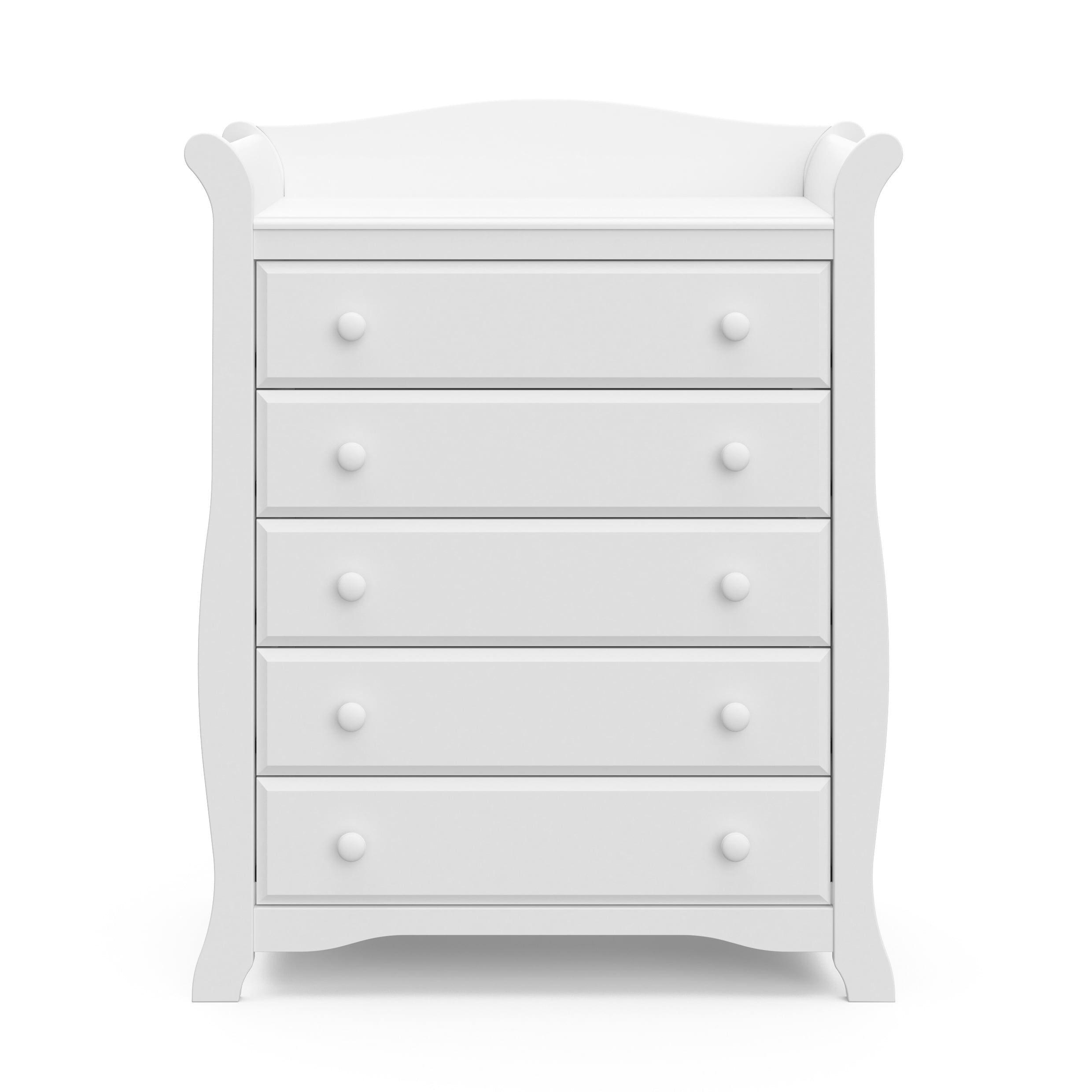 CLASSIC, TRADITIONAL 5-DRAWER DRESSER: This 5-drawer dresser offers families a convenient storage solution in a classic, traditional sleigh design that is easy to match with any nursery or kids bedroom QUALITY WOOD CRAFTMANSHIP: Crafted of wood framing and wood composites, and includes Euro drawer glides (assembly required) SAFETY TESTED: Tested to meet or exceed all applicable CPSIA & ASTM International category safety standards, including the ASTM F2057 safety specification for clothing storage units EXPERT TESTED: Storkcraft dressers are tested at third-party, accredited laboratories to meet or exceed all applicable category voluntary and mandatory safety standards PACKAGED WITH CARE: Packaging tested to reduce the risk of incidental shipment-related damage; Backed by a 1-year limited manufacturer’s warranty AWARD-WINNING BRAND: Storkcraft is the proud recipient of the 2022 Women’s Choice Award for 9 out of 10 Customer Recommended Baby & Kids Furniture PTPA SEAL OF APPROVAL: Storkcraft is the proud recipient of the Parent Tested Parent Approved (PTPA) Seal of Approval, the leader in consumer product awards for families DRESSER DIMENSIONS: Width (50.89 in) x Depth (17.52 in) x Height (40.12 in) x Weight (114.62 lbs) | Drawer Dimensions: Depth (12.99 in) x Width (19.94 in) x Height (5.1 in)