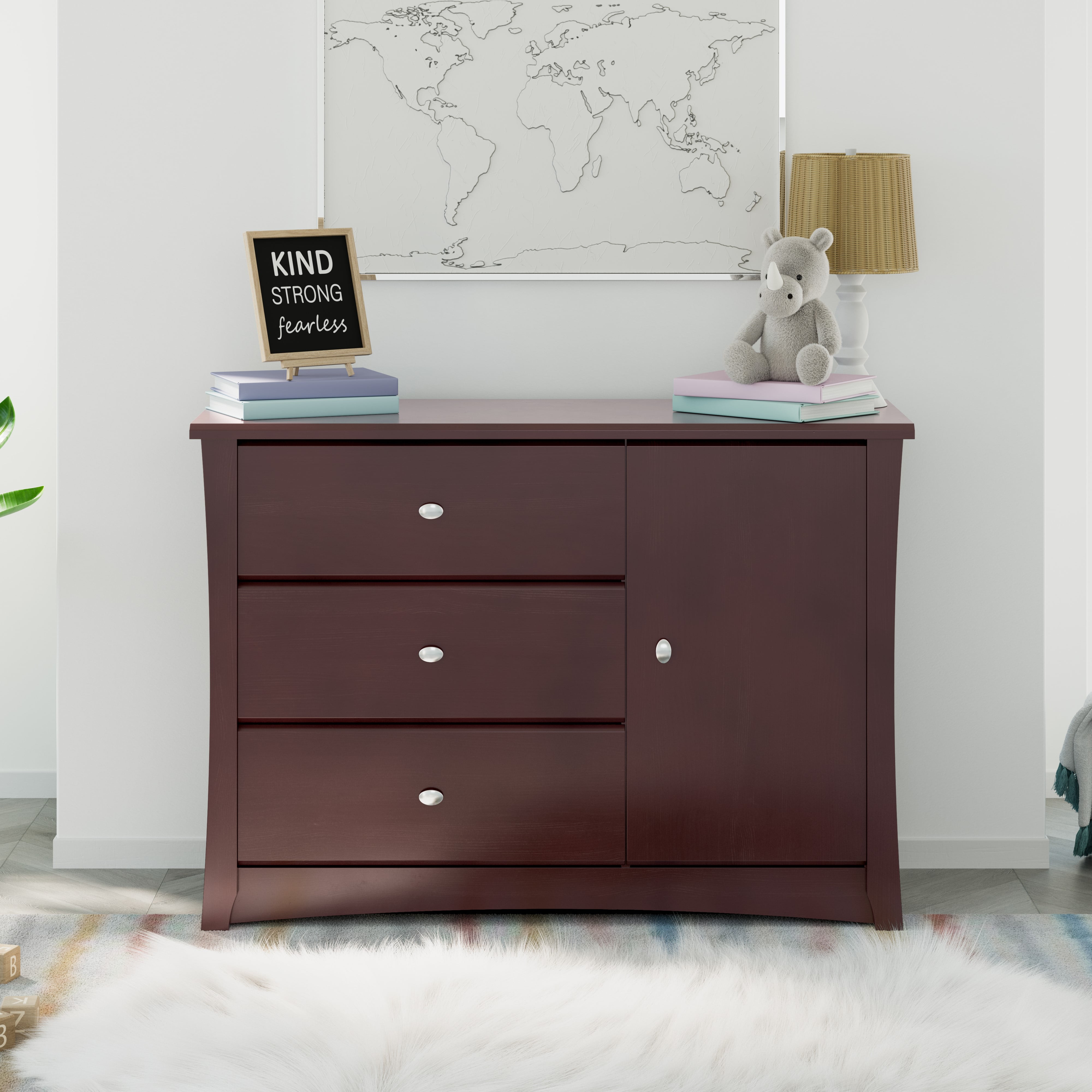 The Storkcraft Crescent 3-Drawer Combo Dresser is a universal nursery and bedroom storage solution. Crafted from engineered wood, the Crescent features stylish metal knobs for added modern flare, 3 spacious drawers, and a cabinet with 2 concealed shelves. This dresser is equipped with durable steel hardware, Euro-glide drawers with safety stops, and is fastened with German cam locks. The Crescent is expert tested by independent laboratories to meet the highest standards for your child’s safety. In addition, the Crescent complies with all applicable federal anti-tipping standards. Complete the Storkcraft Crescent Collection with the matching , , and . Exclusively from Storkcraft, proud recipient of the 2022 Women’s Choice Award for 9 out of 10 Customer Recommended Baby & kids furniture.