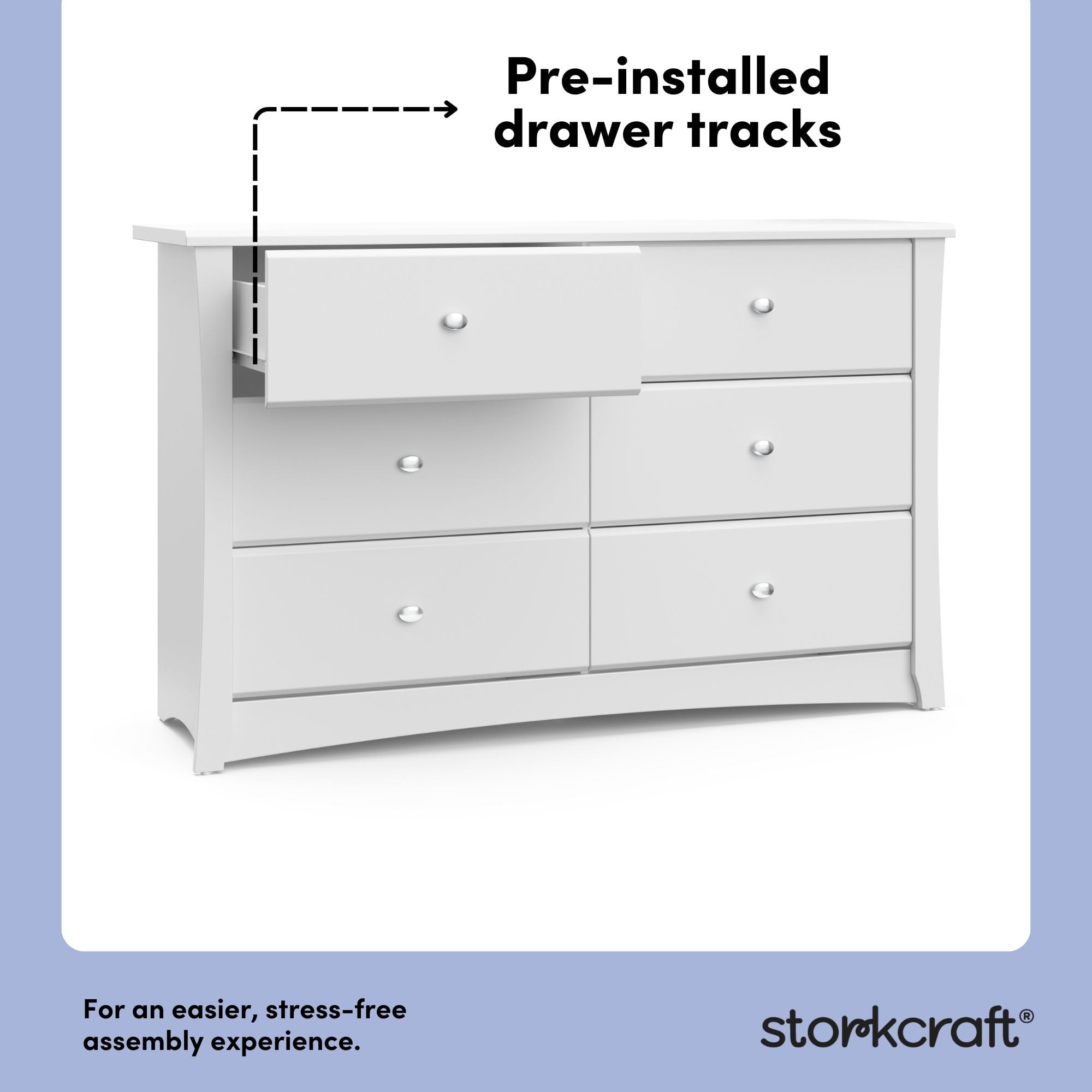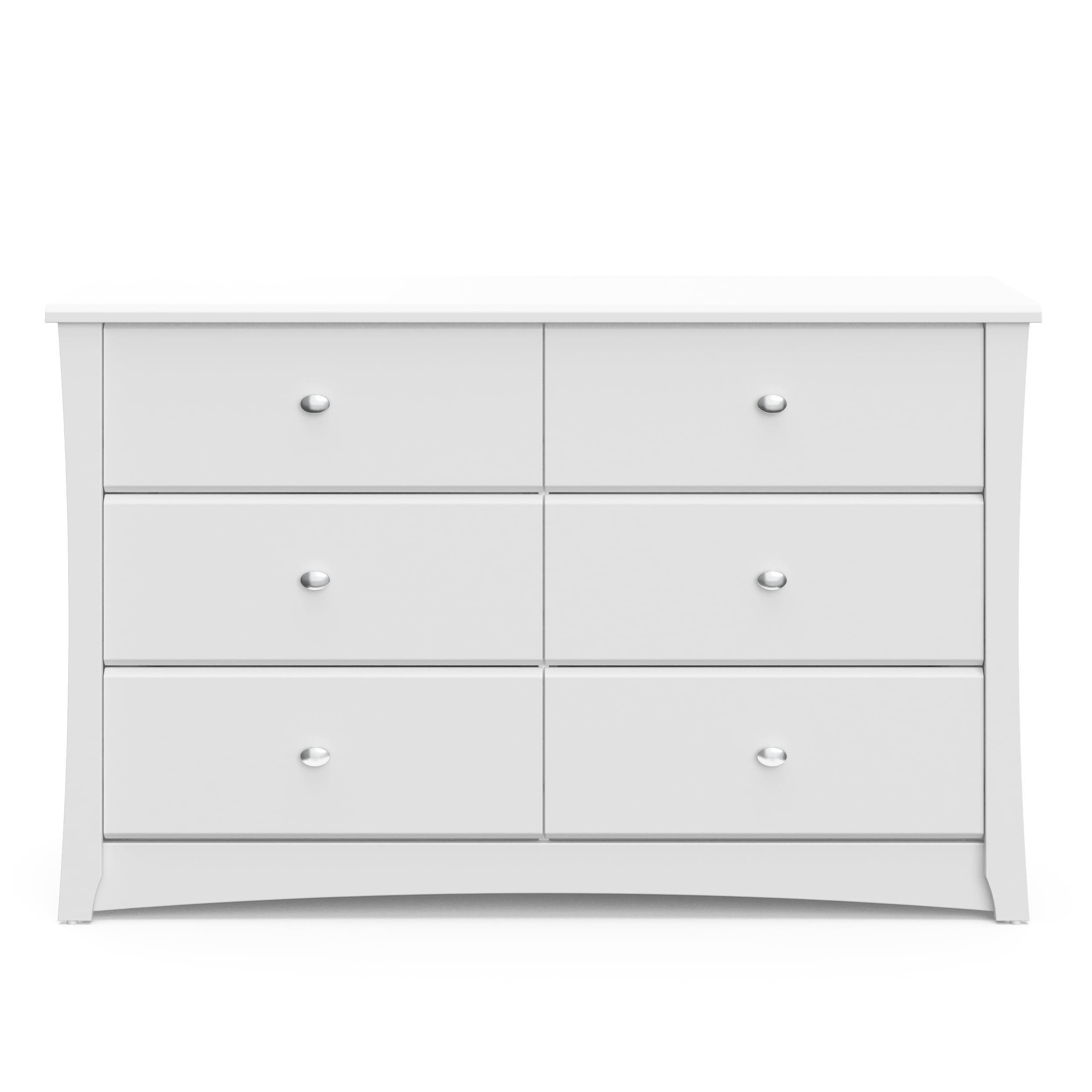 The Storkcraft Crescent 6-Drawer Double Dresser is a universal nursery and bedroom storage solution. Crafted from engineered wood, it features stylish metal knobs for modern flare. This horizontal dresser is equipped with durable steel hardware, Euro-glide drawers with safety stops, and is fastened with German cam locks. The Crescent is expert tested by independent laboratories to meet the highest standards for your child’s safety. Also, it complies with all applicable federal anti-tipping standards. Complete the collection with the matching . Exclusively from Storkcraft, makers of quality nursery and kids’ bedroom furniture since 1945 and proud recipient of the Parent Tested Parent Approved (PTPA) Seal of Approval.