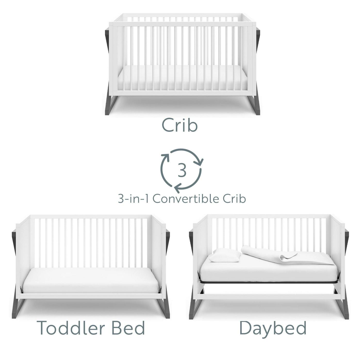 – 3-IN-1 CONVERTIBLE CRIB: Converts from baby crib (mattress sold separately) to toddler bed (compatible with 1 or 2 toddler guardrails, each sold separately) and daybed