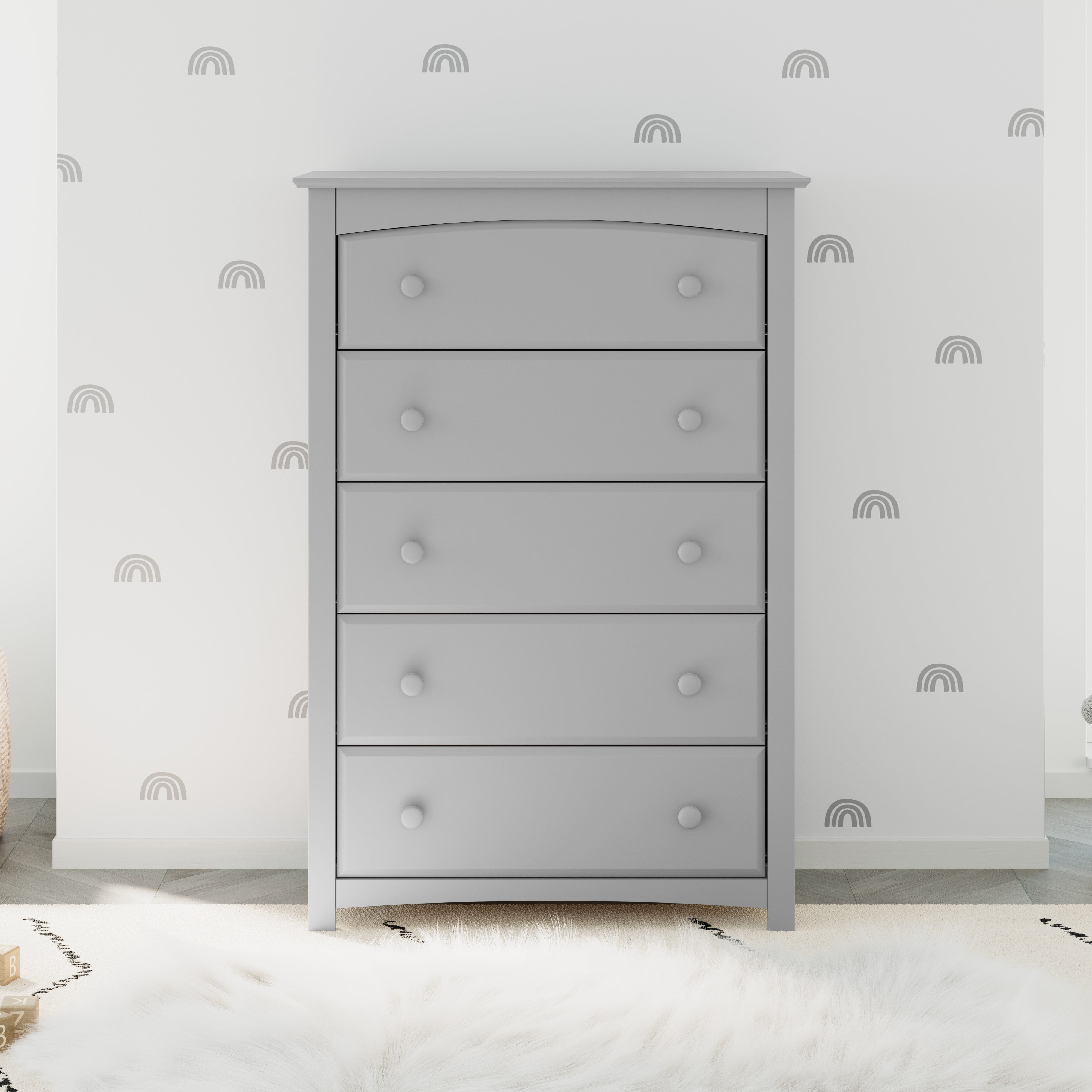 The Storkcraft Kenton 5-Drawer Dresser is a universal nursery and bedroom storage solution. Crafted with high-quality wood and composites, this vertical dresser features 5 spacious drawers and durable steel hardware. The Kenton is equipped with euro-glide drawers with safety stops, and fastened with German cam locks. Backed by Storkcraft’s 1-year limited warranty and supportive customer care. The Kenton is expert tested by independent laboratories to meet the highest standards for your child’s safety. Also, it complies with all applicable federal anti-tipping standards. Complete the collection with the matching 6-Drawer Dresser. Exclusively from Storkcraft, proud recipient of the 2022 Women’s Choice Award for 9 out of 10 Customer Recommended Baby & kids furniture. Available in White, Espresso, Black, Pebble Gray, and Gray.