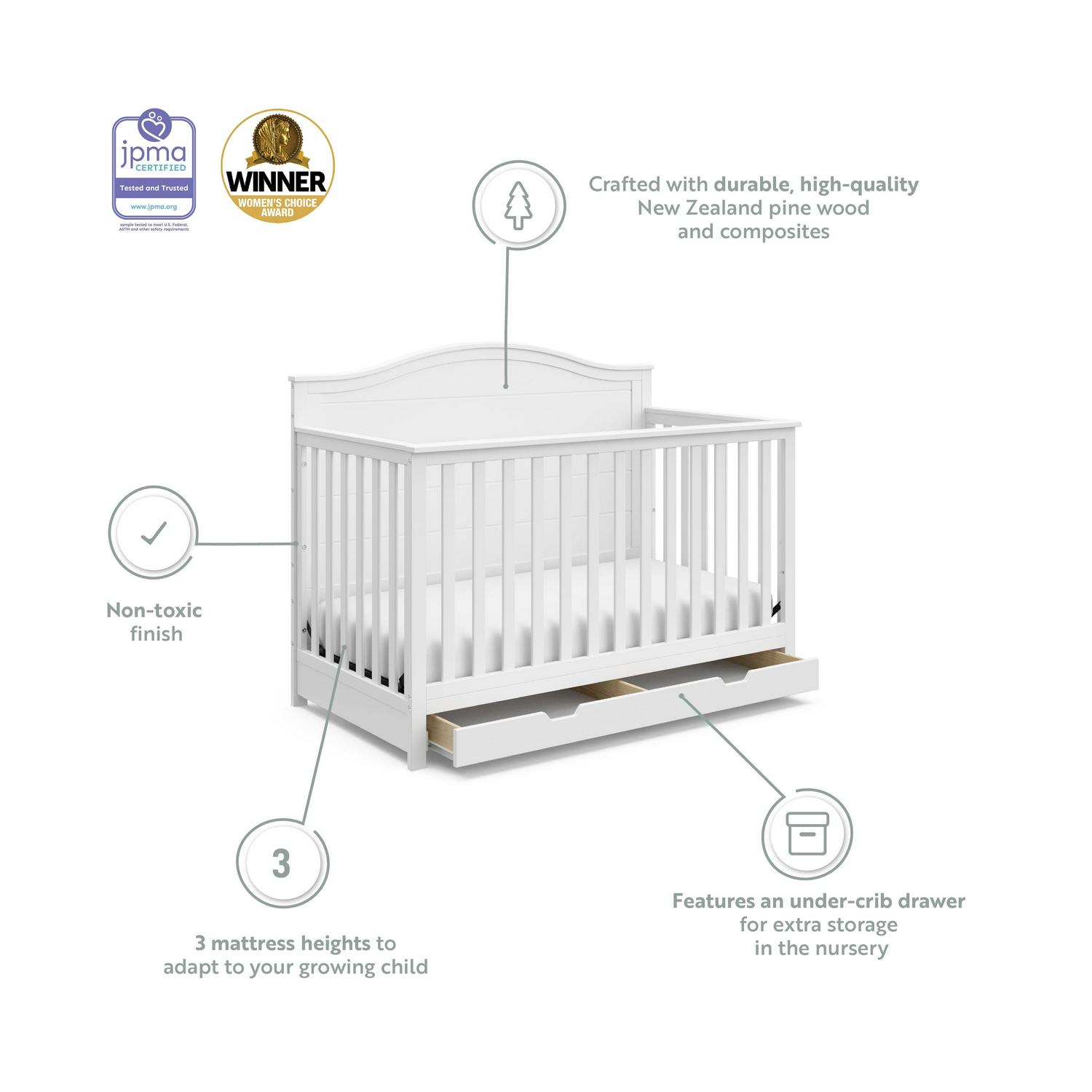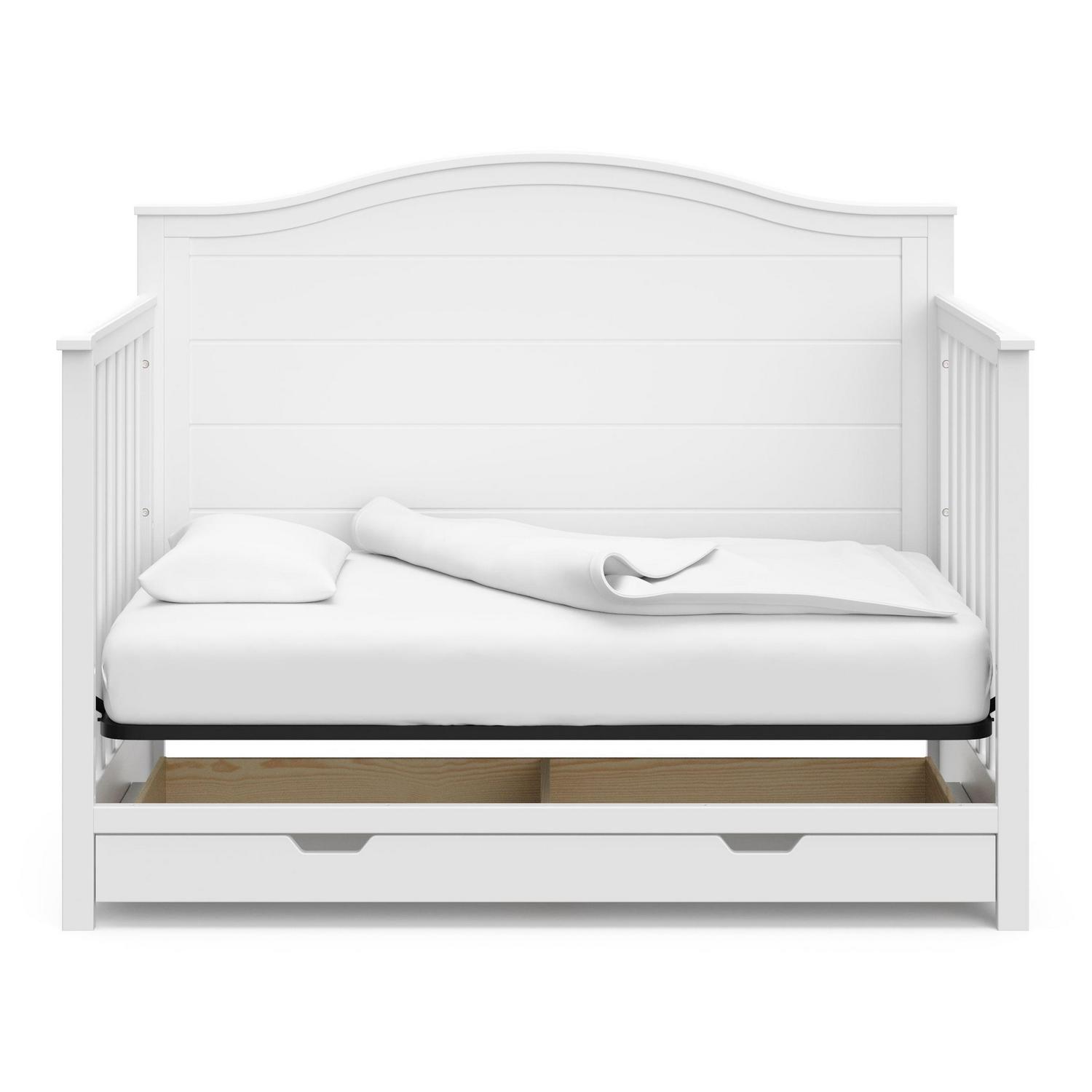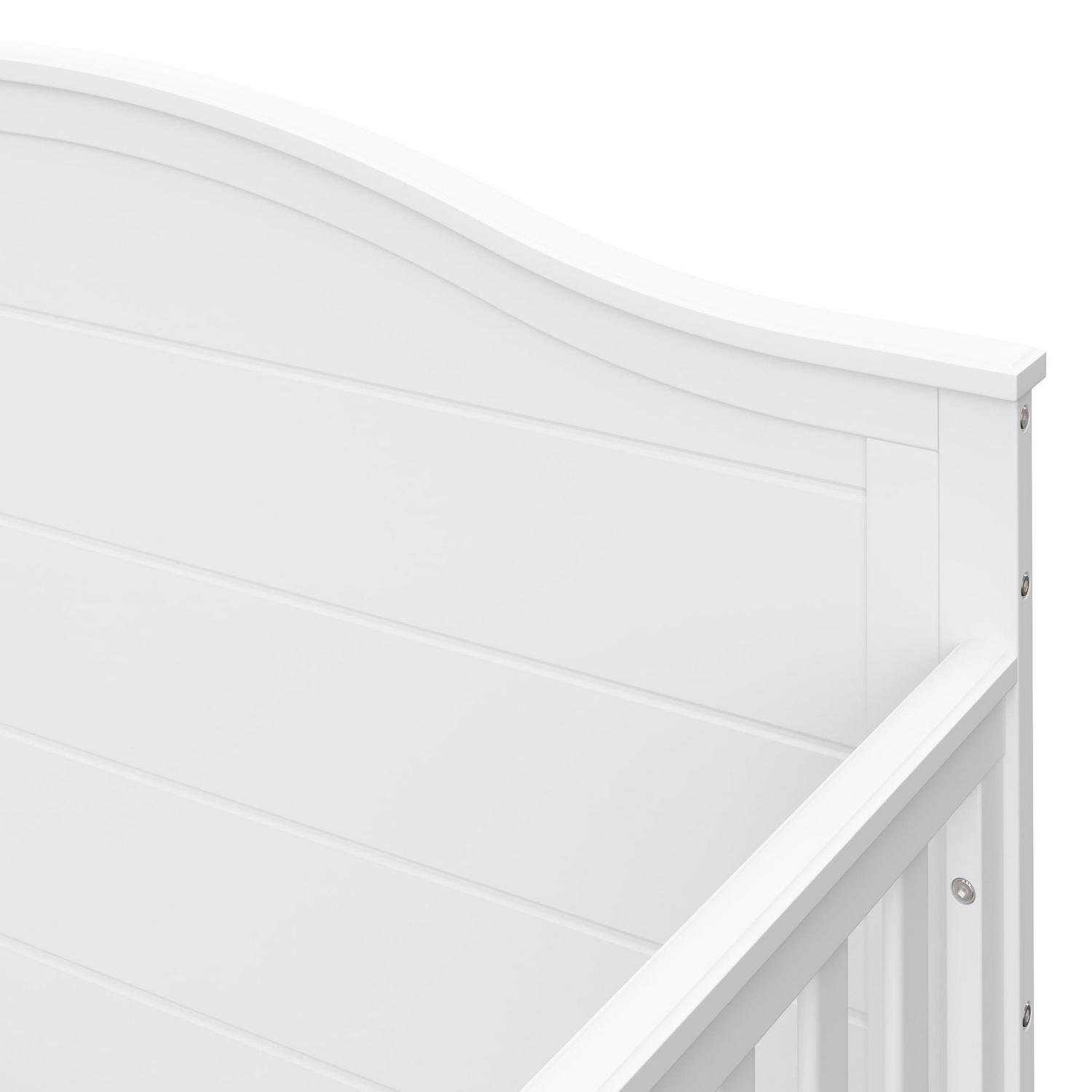 The Storkcraft Moss 5-in-1 Convertible Crib with Drawer offers space-saving nursery storage in a modern, farmhouse style. The Moss’ quality craftsmanship is complemented by its under-crib drawer, which has 2 separate compartments. Designed to adapt to your growing baby, the Moss includes an adjustable mattress support base with 3 different height options. It can also convert into a daybed, toddler bed, and full-size bed. The Moss is JPMA Certified and expert tested by independent laboratories to meet the highest standards for your child s safety. Mattress not included. Crib conversion kit and toddler guardrails sold separately. Exclusively from Storkcraft, proud recipient of the 2022 Women’s Choice Award for 9 out of 10 Customer Recommended Baby & Kids Furniture. For additional nursery storage, pair with the Moss 6-Drawer Dresser.