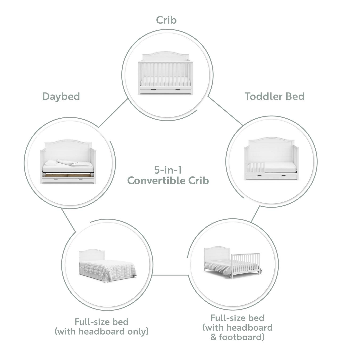 – 5-IN-1 CONVERTIBLE CRIB WITH DRAWER: Converts from baby crib (mattress sold separately) to toddler bed (compatible with 1 or 2 toddler guardrails, each sold separately), daybed, and full-size bed with headboard & optional footboard (compatible full-size conversion kit sold separately)