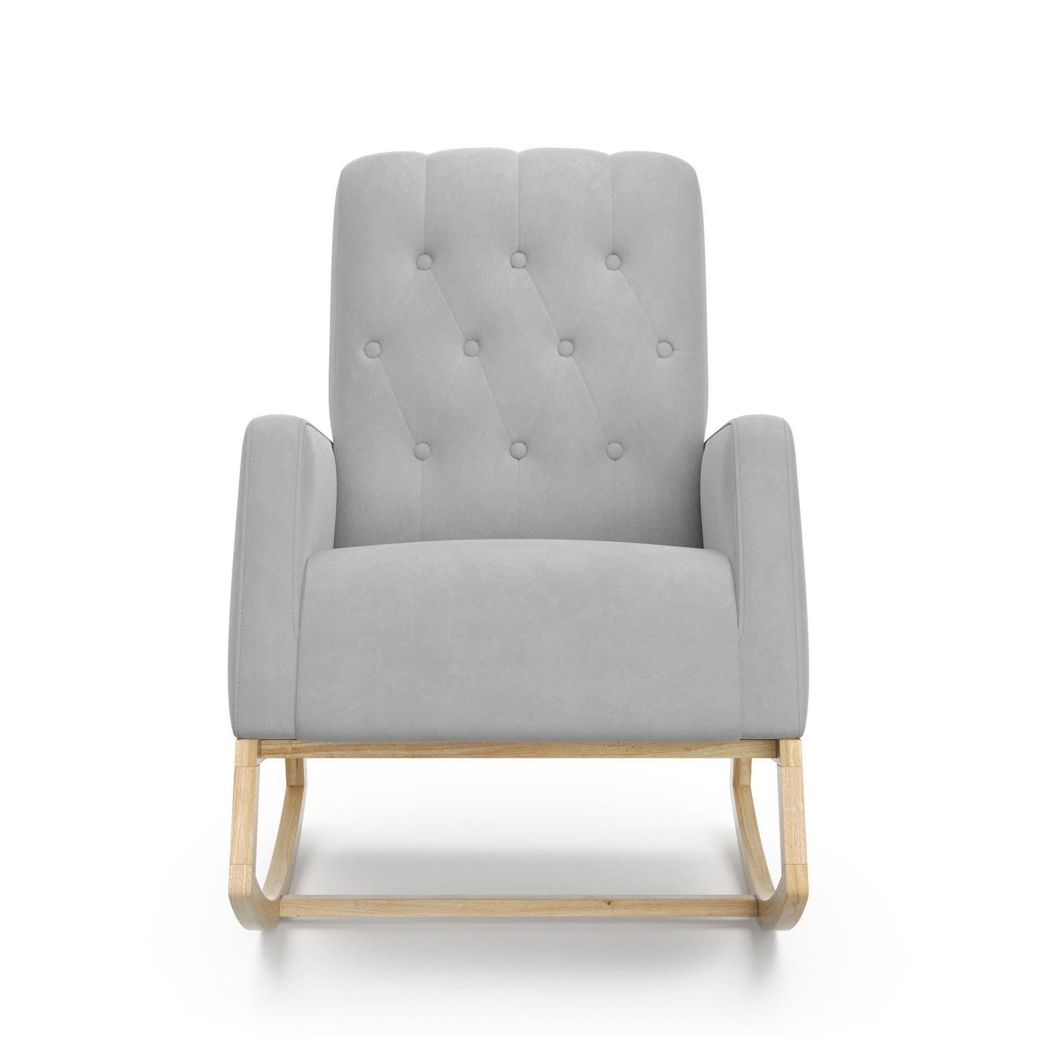 – ROCKING CHAIR FOR NURSERY: Stylish, comfortable mid-century modern rocker with gentle rocking motion; Fully upholstered with a quilted, button-tufted pattern; Durable, solid wood base