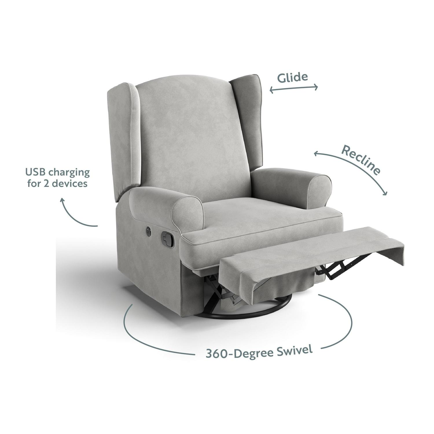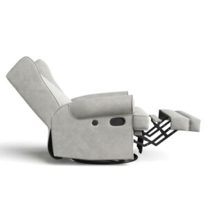 – FULLY UPHOLSTERED GLIDER: Upholstered in durable yet comfortable water-repellant, eco-friendly fabric, this plush, supportive, USB-friendly reclining glider with 360-degree metal swivel base was crafted for years of use and enjoyment
