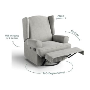 The Storkcraft Serenity Wingback Recline Glider with USB Charging Port is a classically proportioned reclining nursery glider chair with a durable metal 360-degree swivel base, handsome wingback details, and gentle, seamless “glide and recline” functionality to provide families with years of comfort and enjoyment. Designed for today’s modern parent, the Serenity has a USB charging port with 2 charging slots to keep your smartphone, tablet computer, or e-reader charged in the nursery. Plush, cushioned, and supportive, the durable upholstered Serenity was designed for ultimate nursery comfort, and as a cozy nest for parents and child to enjoy calmness and serenity. Upholstered in durable yet comfortable water-repellant, eco-friendly fabric, the Serenity is able to recline backwards, and its leg support can kick up for an even more comfortable rest. Rest easy knowing that the Storkcraft Serenity is backed by a 1-year limited warranty, and Storkcraft’s supportive customer care. Exclusively from Storkcraft, proud 2018-2023 Women’s Choice Award Winner for 9 out of 10 Customer Recommended Baby & Kids Furniture. Available in Ivory and Steel.