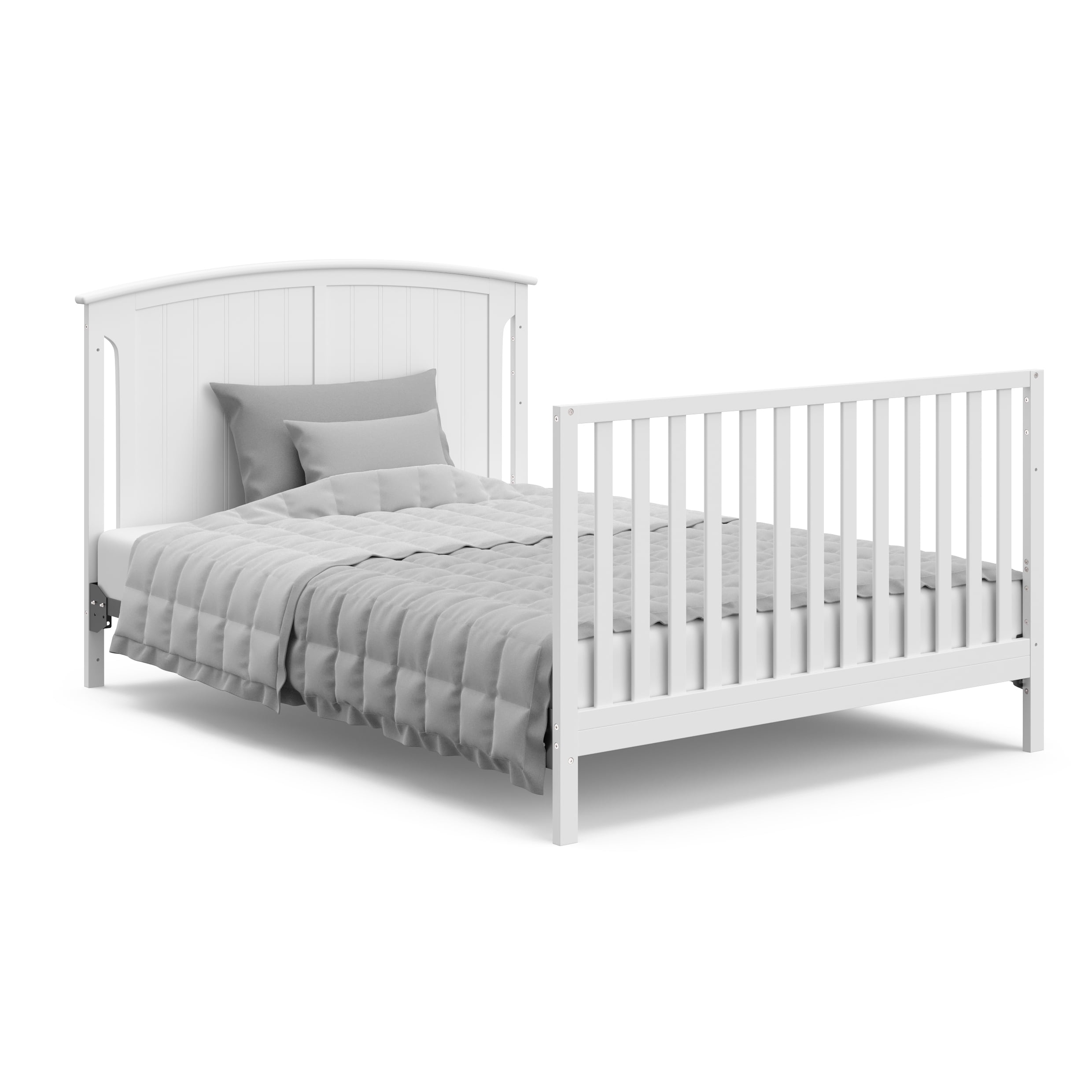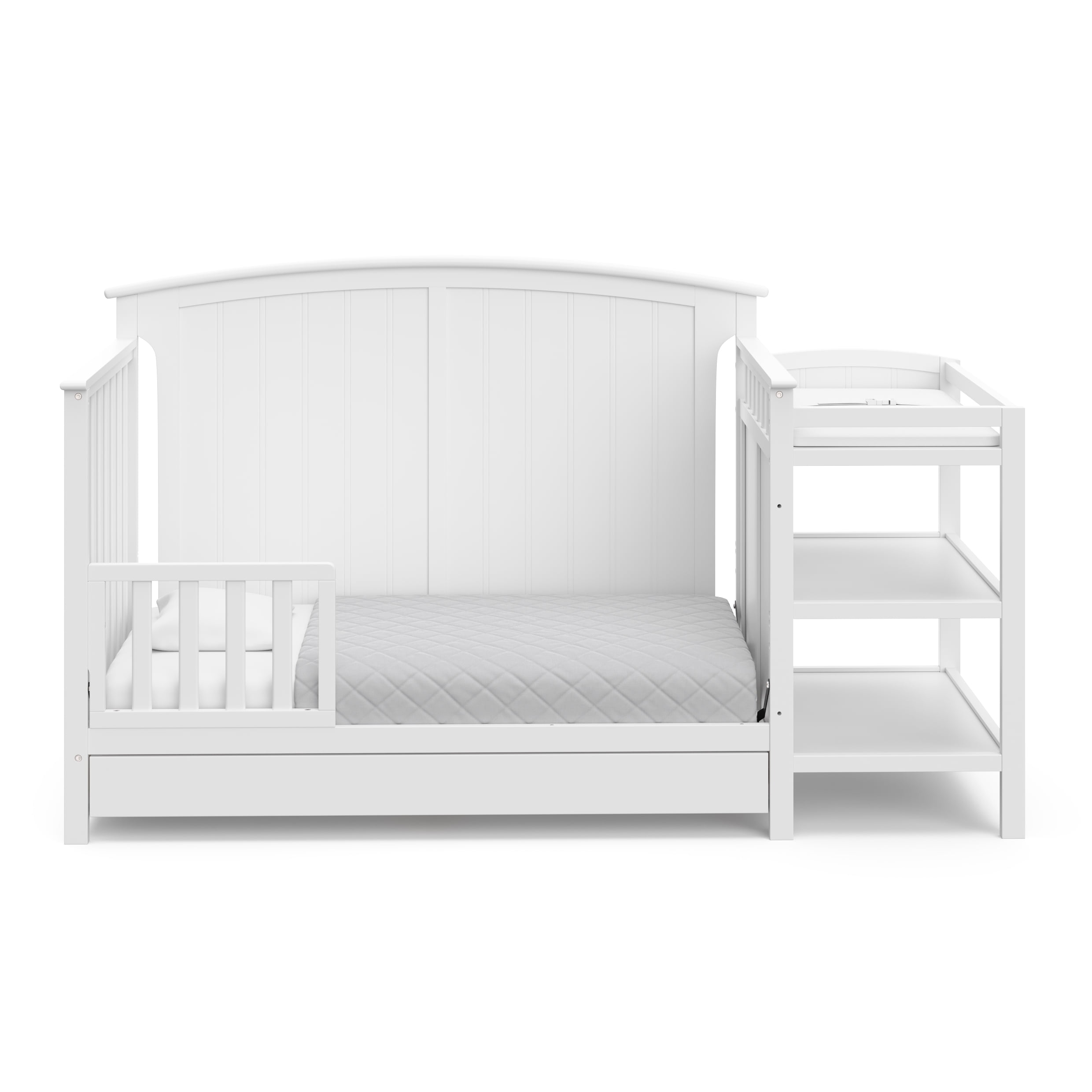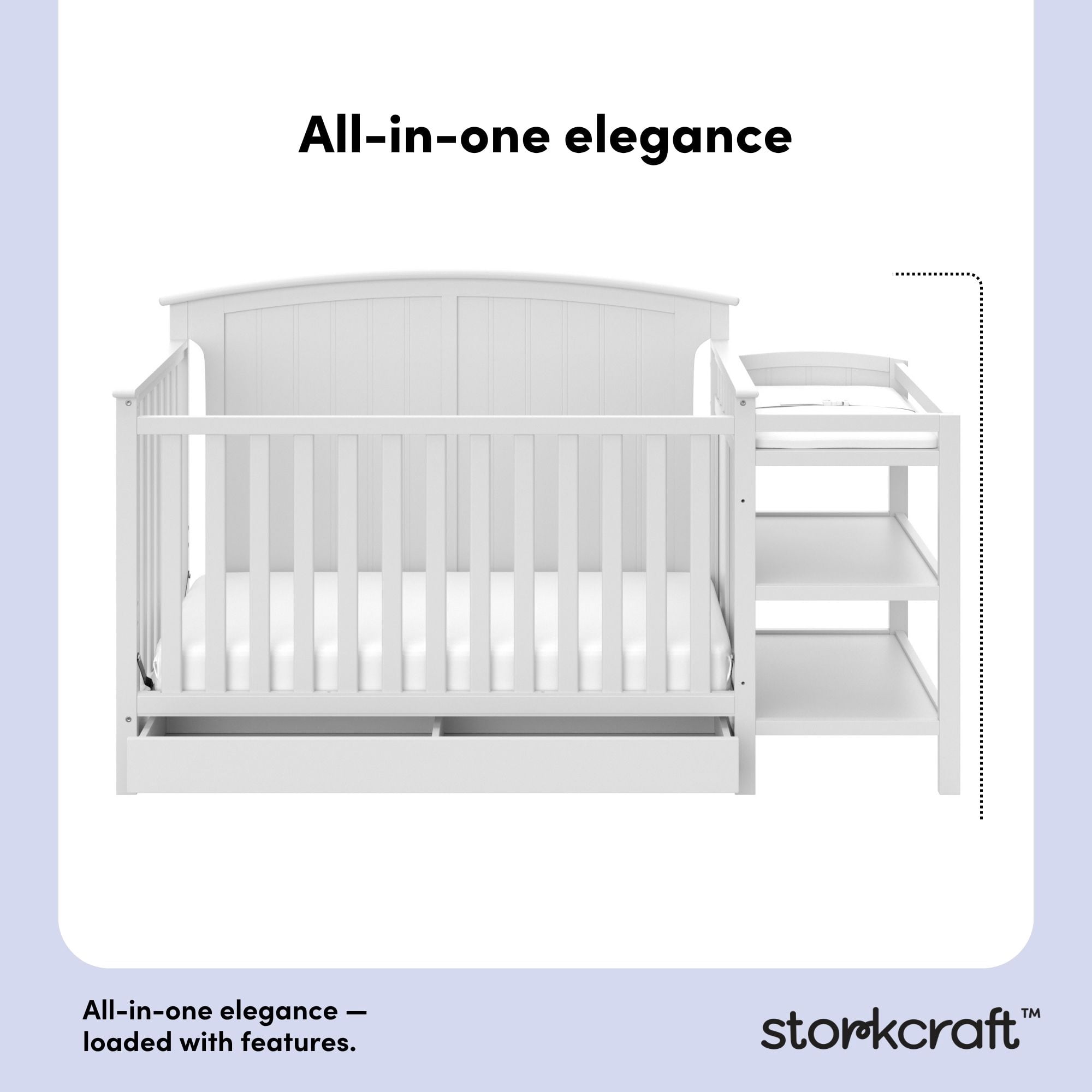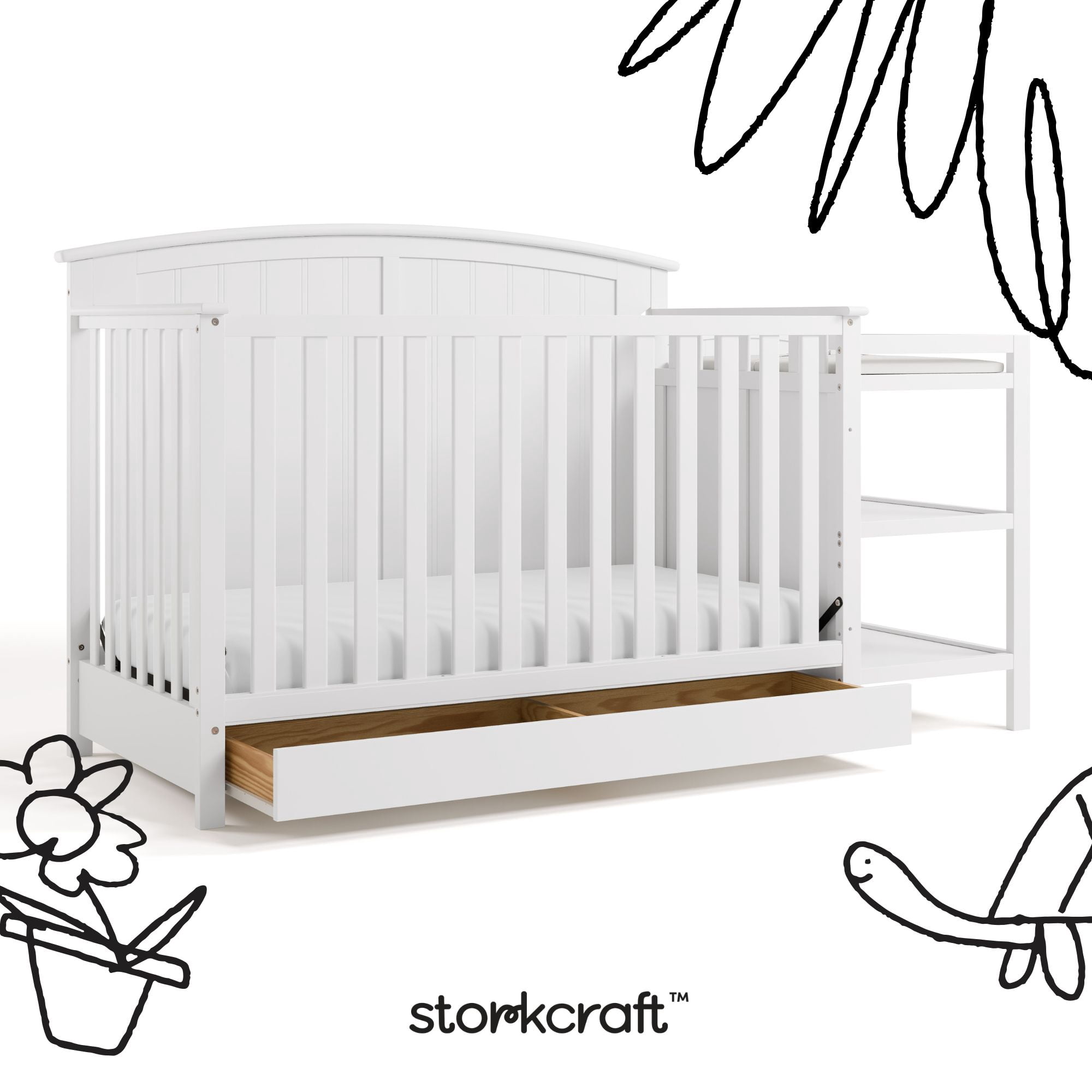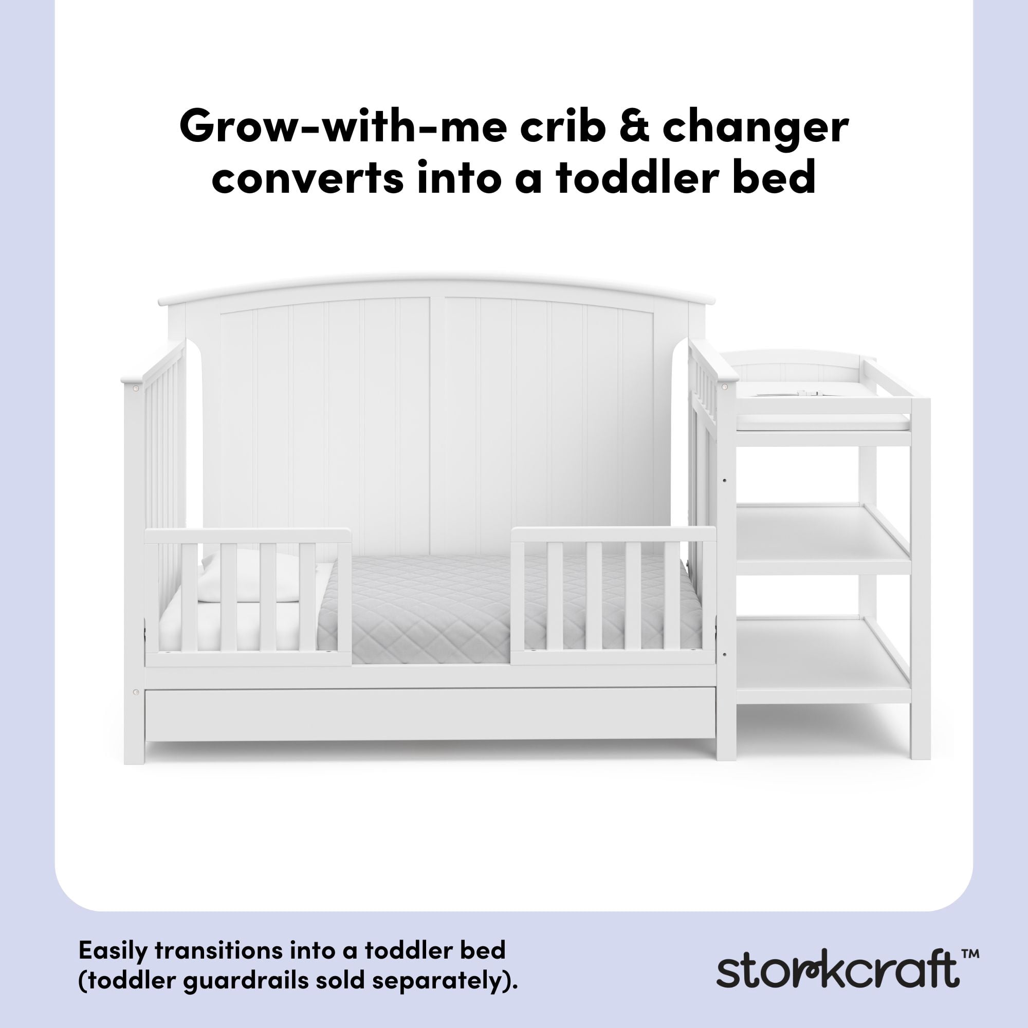 Bring your dream nursery to life with the Storkcraft® Steveston 5-in-1 Convertible Crib & Changer with Drawer — a versatile, all-in-one solution designed to grow with your baby. Featuring a solid panel, arched headboard, sleek classic design, and neutral finish, the Steveston includes an under-crib storage drawer and an attached changing table with two open shelves for added convenience. A water-resistant changing pad is also included, offering both comfort and practicality. This convertible baby crib with changing table is built to adapt with your child through every stage, with an adjustable mattress support base offering four height options to lower the mattress as your baby grows. Please note: this crib should only be used until your child can climb out or is taller than 35 inches (89 cm). The Steveston easily converts from a crib to a toddler bed (toddler guardrail sold separately), then to a daybed, and finally to a full-size bed (conversion kit sold separately). It fits any standard full-size crib and toddler mattress (crib mattress sold separately — we recommend any Graco® crib mattress). For peace of mind, this Storkcraft crib is GREENGUARD Gold Certified, meaning it’s been screened for over 15,000 chemicals and VOCs to help promote cleaner indoor air. It also meets or exceeds ASTM and CPSIA safety standards and is Baby Safety Alliance Verified. Storkcraft®, established in 1945, is a proud recipient of the Parent Tested Parent Approved (PTPA) Seal of Approval and has been recognized by Fast Company, Parents, and the Baby Innovation Awards. The Steveston is backed by a 1-year limited warranty and supported by our real-life Customer Care team.