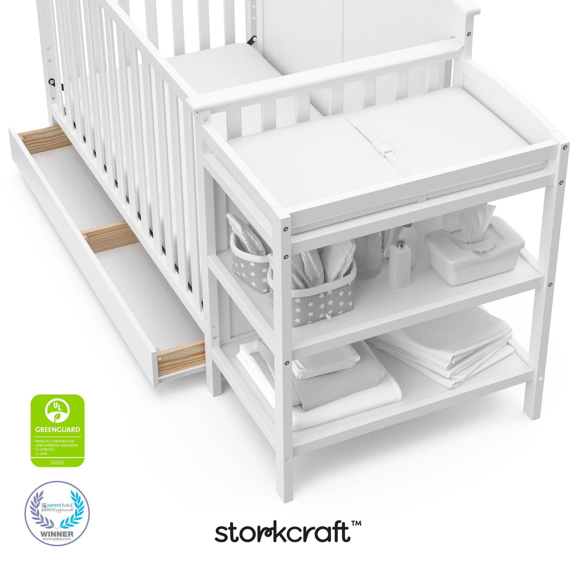 5-IN-1 CONVERTIBLE CRIB & CHANGING TABLE: Converts from crib with attached changing table (includes water-resistant diaper changing pad; mattress sold separately) to toddler bed (compatible toddler guardrails sold separately), daybed, and full-size bed (compatible full-size bed conversion kit sold separately). GREENGUARD GOLD CERTIFIED: Screened for over 15,000 chemicals and VOCs to ensure indoor air quality. BABY SAFETY ALLIANCE VERIFIED, SAFETY TESTED: Expertly tested to meet or exceed all safety standards; finish tested to meet ASTM and CPSIA standards. 4 MATTRESS HEIGHT OPTIONS: Adjustable mattress support with 4 height options, including a convenient “newborn” height; fits standard full-size crib & toddler mattress. QUALITY CRAFTSMANSHIP: Crafted from pine wood, and wood composites with Euro drawer glides; assembly required (2 people recommended). FROM STORKCRAFT, SINCE 1945: Storkcraft has been a trusted maker of quality nursery and kids’ bedroom furniture since 1945. Proud recipient of the Parent Tested Parent Approved (PTPA) Seal of Approval, with over 80 years of craftsmanship. PACKAGED WITH CARE: Tested packaging to reduce shipment-related damage risk; backed by a 1-year limited manufacturer’s warranty. CRIB DIMENSIONS ASSEMBLY: Width (73.25 inches) x Depth (29.69 Inches) x Height (41.81 inches)
