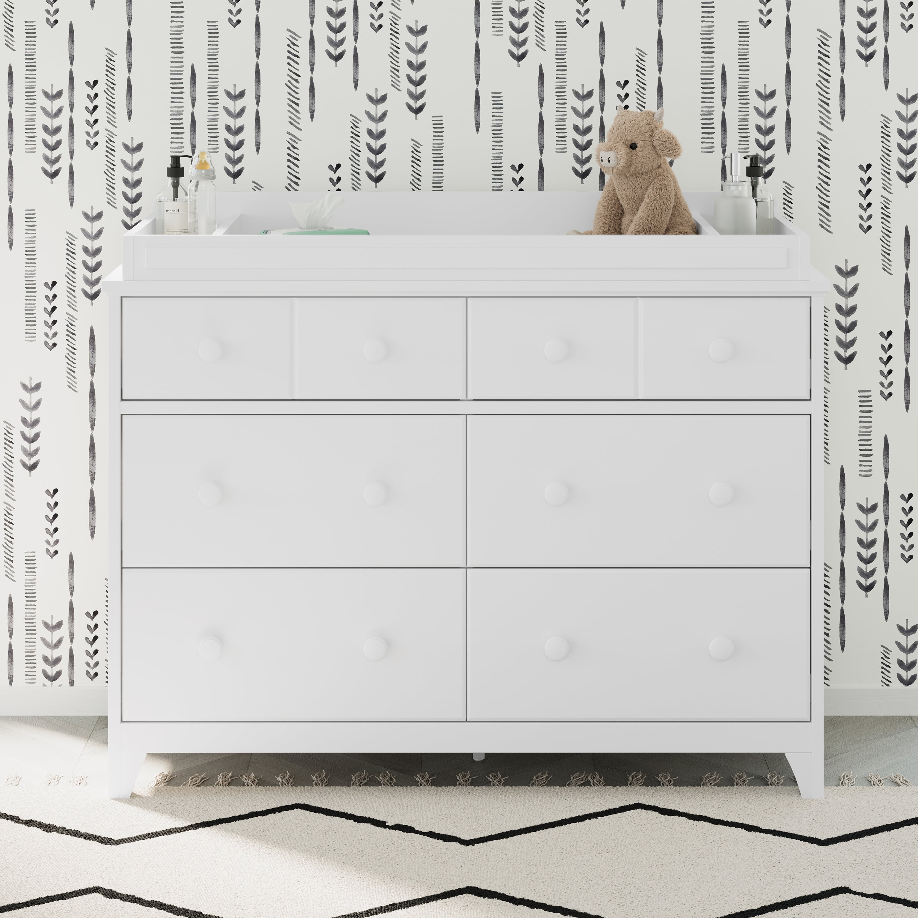 The Storkcraft Universal Changer Topper is the perfect addition to your double dresser. It transforms it into a handy, safe, and secure baby changing station. The Storkcraft Universal Changer Topper is compatible with any double dresser with a surface dimension of at least 17 inches x 46 inches. The Storkcraft Universal Changer Topper has 3 spacious compartments to fit a standard size baby changing pad. It also fits baby wipes, lotions, and other changing essentials for ultimate functionality. Designed to blend perfectly and nest securely on top of a variety of suitable double dressers, the Storkcraft Universal Changer Topper is available in multiple baby-safe, non-toxic finishes. Also, it is expert tested by independent laboratories to meet the highest standards for your child’s safety. The Storkcraft Universal Changer Topper is compatible with the Storkcraft Kenton 6 Drawer Dresser and the Storkcraft Moss 6 Drawer Dressers, as well as the Graco Benton 6 Drawer Dresser and the Graco Hadley 6 Drawer Dresser. Easy assembly required. Only compatible with double dressers with a surface dimension of at least 17 inches x 46 inches. Exclusively from Storkcraft, proud recipient of the 2022 Women’s Choice Award for 9 out of 10 Customer Recommended Baby & Kids Furniture.
