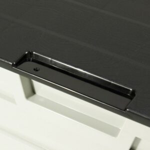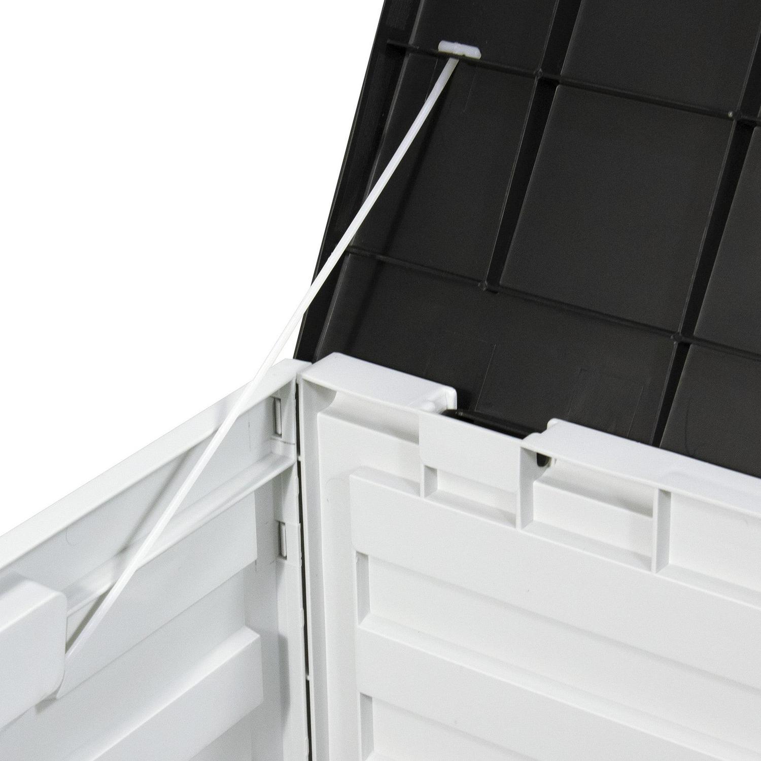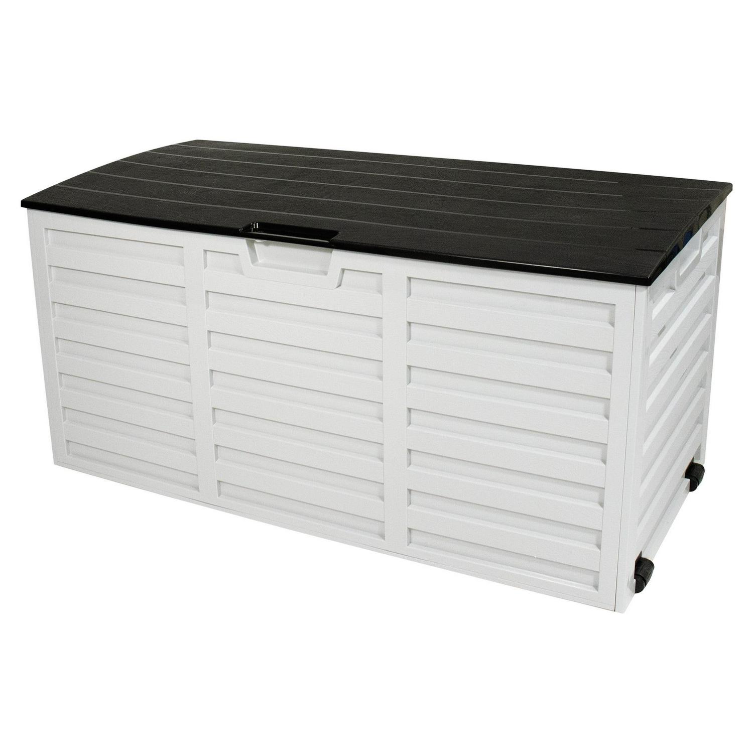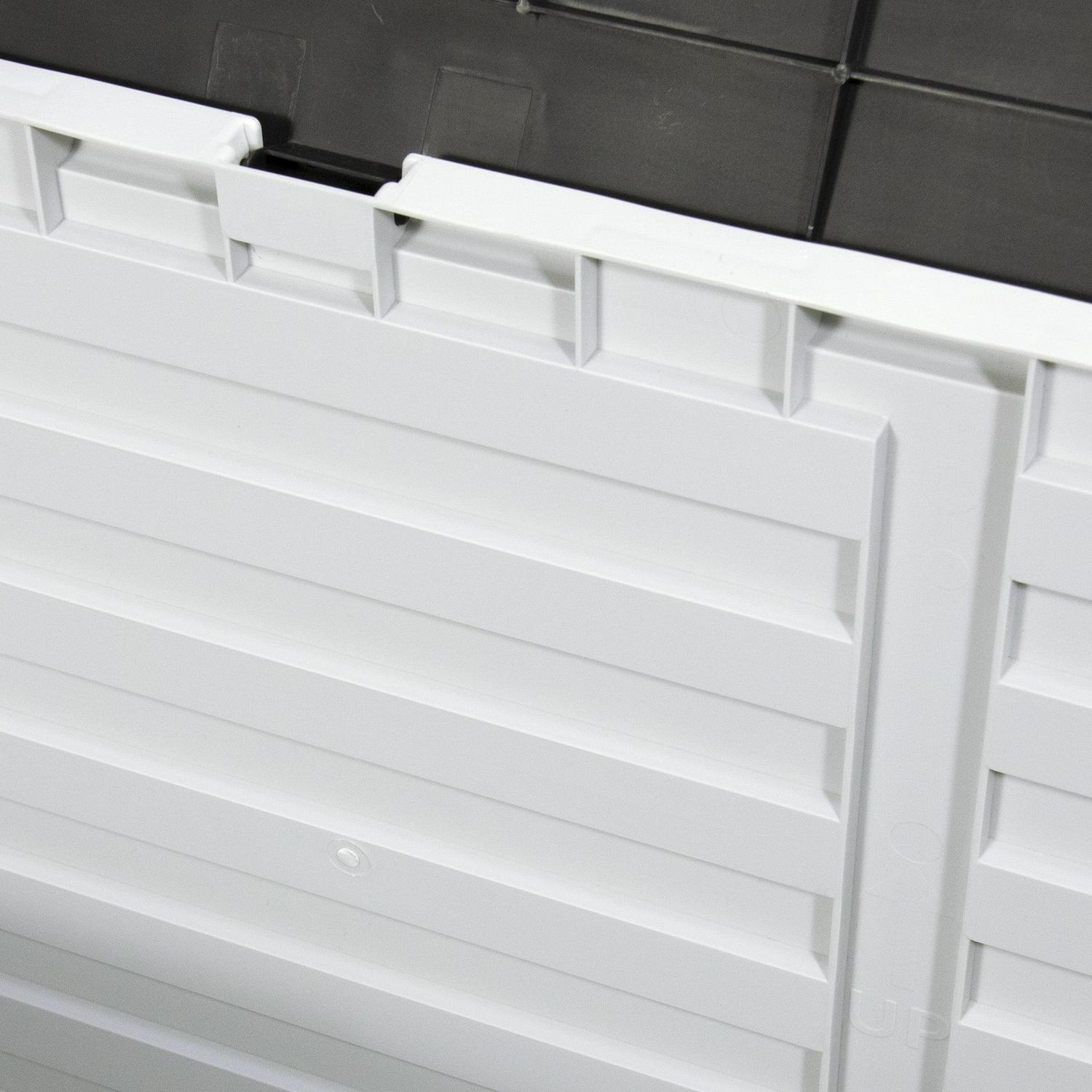 The Stout Stuff 70 Gallon Deck Box is a multipurpose indoor or outdoor storage box. This light weight storage box is easily assembled without the use of any tools. Its weather- resistant construction will withstand seasonal elements, such as rain, winds or colder temperatures. The classic white a gray finish will complement most outdoor décor. Use this deck box to store pillows, cushions, sports ball, pool supplies, toys, garden accessories and more. The storage box can easily be wheeled out of the way and locked with padlock (sold separately) when not in use. The Stout Stuff deck box measures 44 in. x 19.25 in. x 21 in., and has total capacity of 70 gallons making it perfect for your back yard space.