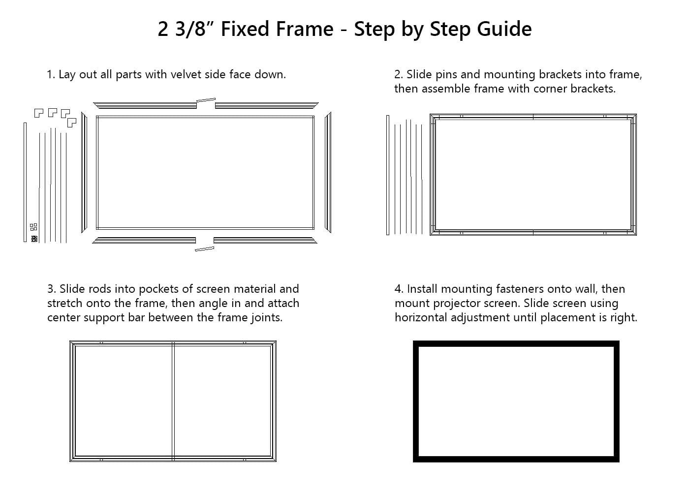 Description Product is a 6 piece 120″ Diagonal 16:9 fixed frame screen and is made to mount on a wall. The Silver Ticket Products 120″ 16:9 Fixed Frame projection screen offers powerful performance for the price. Materials Available – Matte White, Grey, HC Grey, Silver, Woven Acoustic. Please see other product pages for screen materials. This screen features real projection screen material, not a sheet. This material is a white stretchy, high-quality vinyl at 1.1 gain that is designed for watching movies. Wait until you see the colors! There is no resolution lost at any angle. This screen truly assembles much faster than any other brand available! Forget about tucking the screen material into the frame – the Silver Ticket Tension Rod System saves you time and frustration. How does the material connect to the frame? Each side of the material has a pocket. A rod slides through the pocket to attach to the frame. This saves you time during assembly, but also removes any puckers or wrinkles in the viewing surface. The rod holds the material perfectly square all around the whole frame. This pocket and rod system remains hidden behind the frame so you only see the movie. Forget about tricky installations – this fixed frame screen mounts on the wall much like a large picture frame. The sturdy aluminum frame is WRAPPED, not flocked, with a light absorbing black velvet fabric to absorb over-projected light so you don’t have to be a professional when aligning your projector. While other brands use square tubing in their frames, this screen is built with durable extruded aluminum that contours down to the projected image so you won’t have any ugly shadow on the image area. Join the thousands of satisfied customers — buy Silver Ticket 120 inch,16:9 today! USEFUL LINKS: Visual Installation Guide Instruction Manual (.PDF) Product Warranty Replacement parts: 2 3/8″(6cm) Hardware Kit 2 3/8″(6cm) Joint Bars Screen Material 120″ 16:9 Matte White Support Bar 120″ 16:9 2 3/8″(6cm) Tension Rods 120″ 16:9 2 3/8″ (6cm)