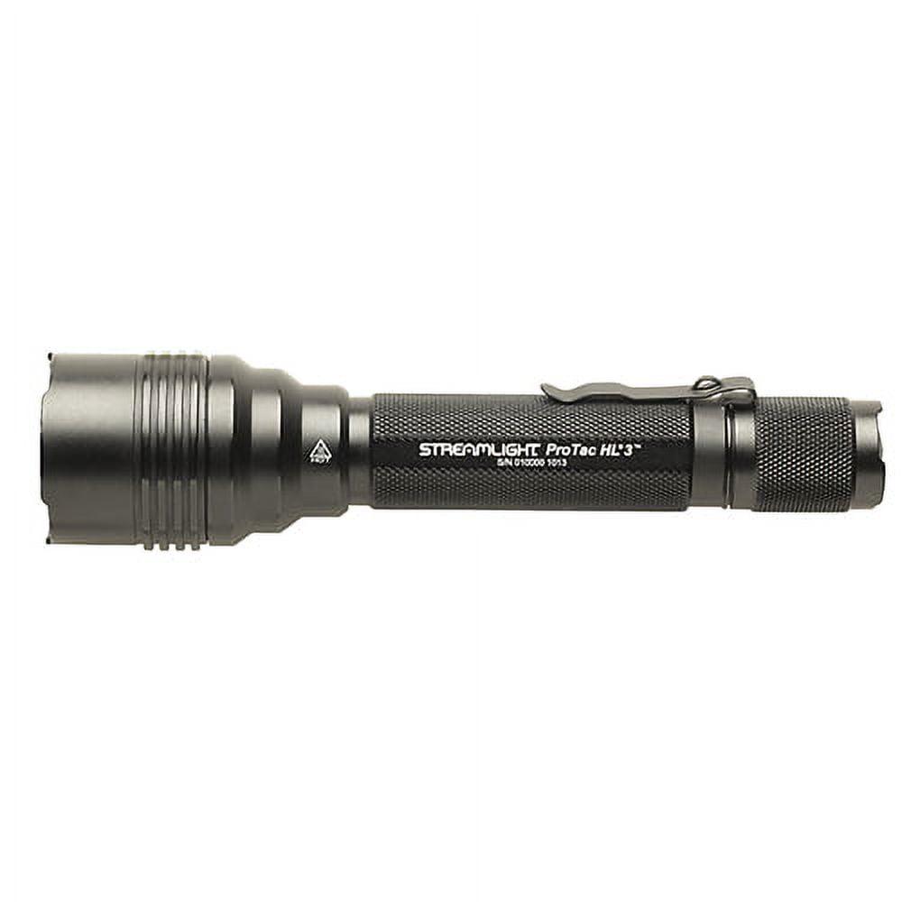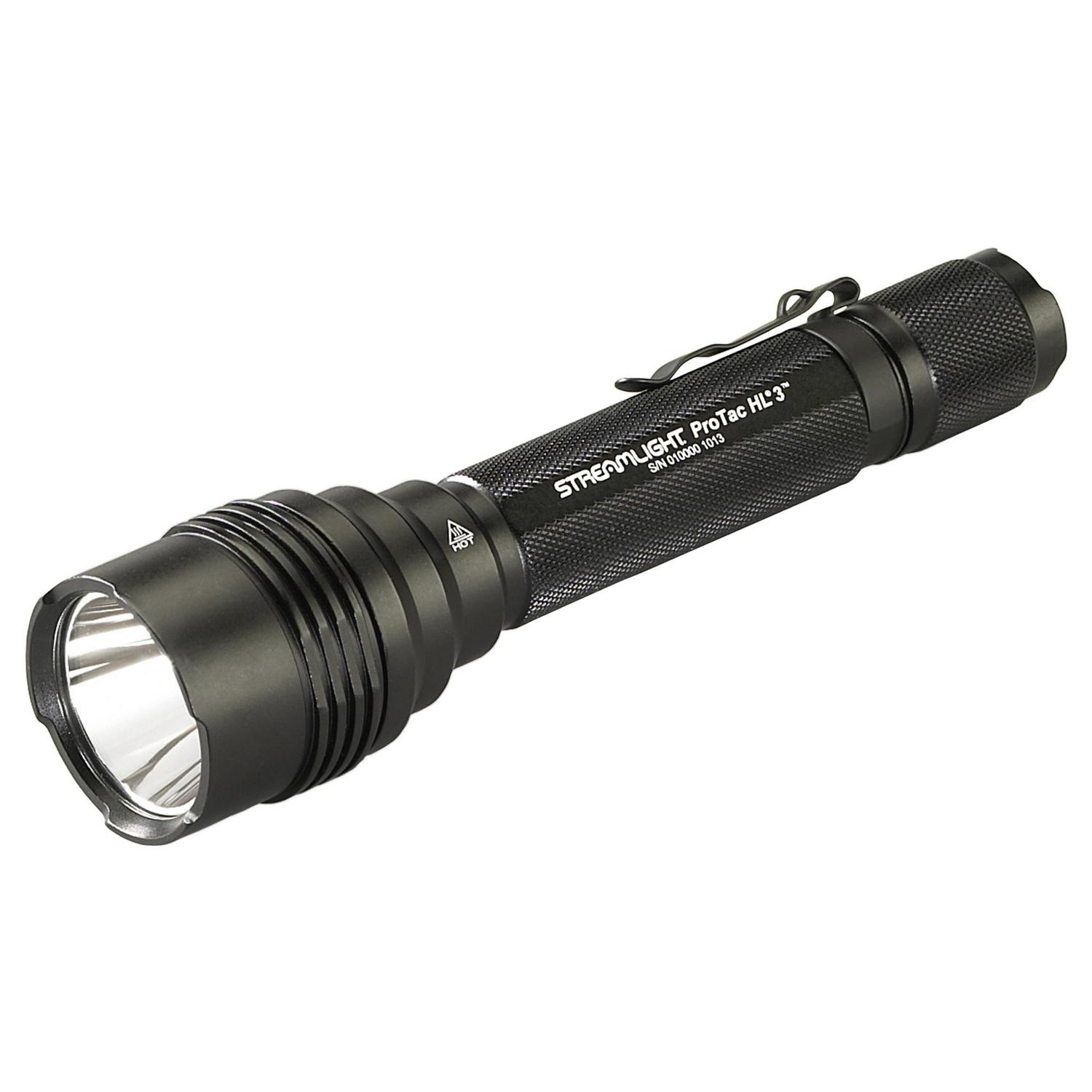 A powerful 1100-lumen maximum brightness level, a self-defense or signal strobe, and a strong aluminum housing make the ProTac Streamlight HL 3 Flashlight a good choice for professional, recreational, or around-the-house use. A tailcap push-button switch turns the light on and off and selects output levels, The light can be programmed in three modes high/strobe/low, high only, and low/high. Power is supplied by three included CR123A batteries. Output is regulated to ensure consistent performance across the batteries’ lifetime. Rated IPX7 for water resistance, the light is both submersible and impact resistant to 3.3′. This item comes in clamshell packaging.