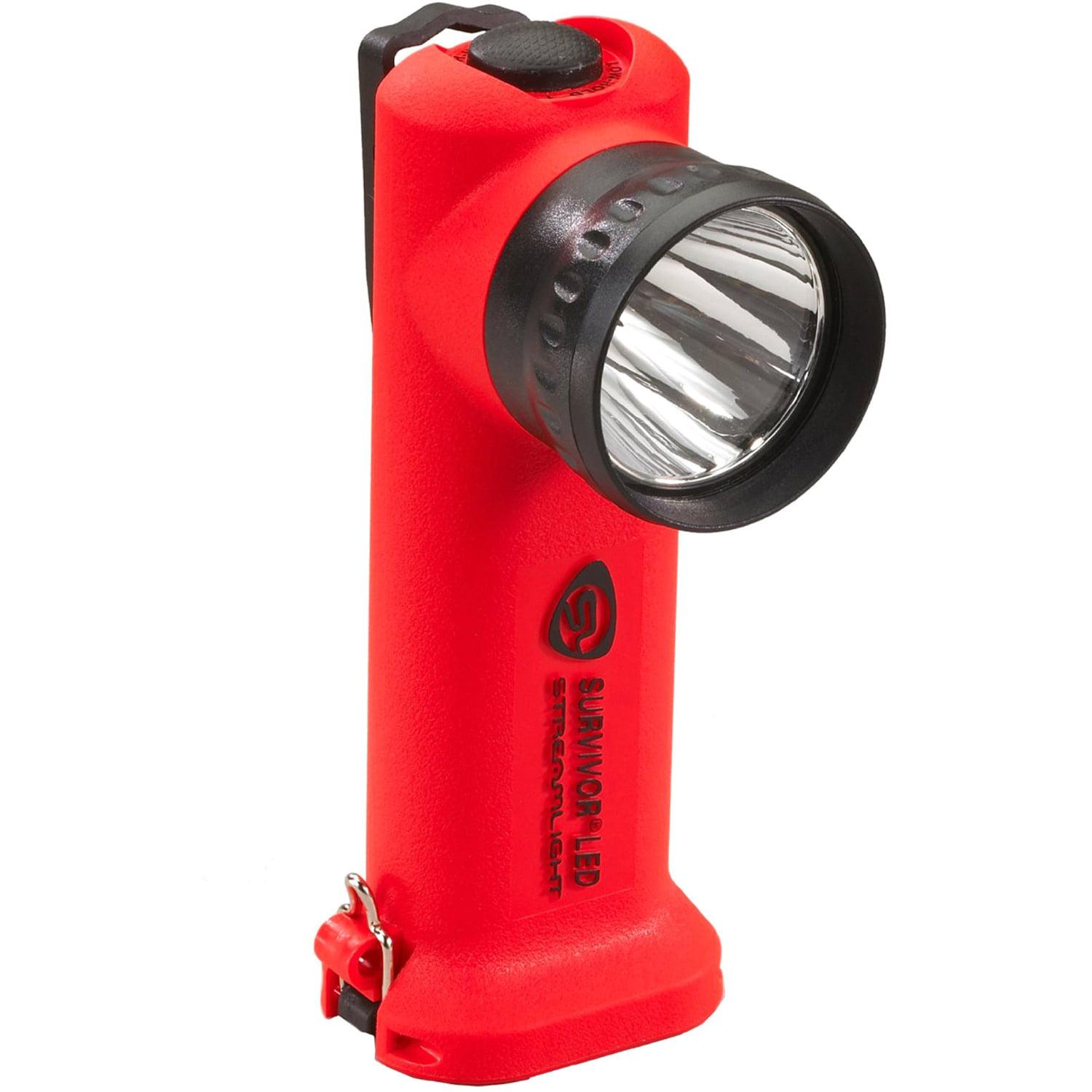 Introducing Survivor LED. The Brightest, Right-Angle LED Flashlight in the World. The Luxeon LED will never break or burn out, it’ll never have to be replaced. Ultra-bright, 3 watts Luxeon LED has 50,000 hr. life with 65 lumens. No need for a spare bulb. A Deep-dish, parabolic beam generator creates a long-range (500 ft.), focused beam and ample side lighting for multi-use applications. A weatherproof, microprocessor-controlled, push-button switch is raised to make it easy to use with gloves.3 position switch: High, low, and locator strobe. Raised push button switch is recessed in polymer housing for protection. Runtimes: Up to 3 hrs. on high beam. Up to 6 hrs. on low beam. Dual power source: 4 “AA” Alkaline batteries or rechargeable nickel-cadmium battery pack (rechargeable model includes backup alkaline battery pack).