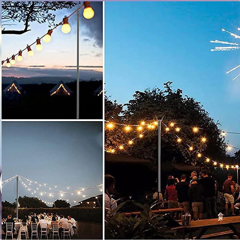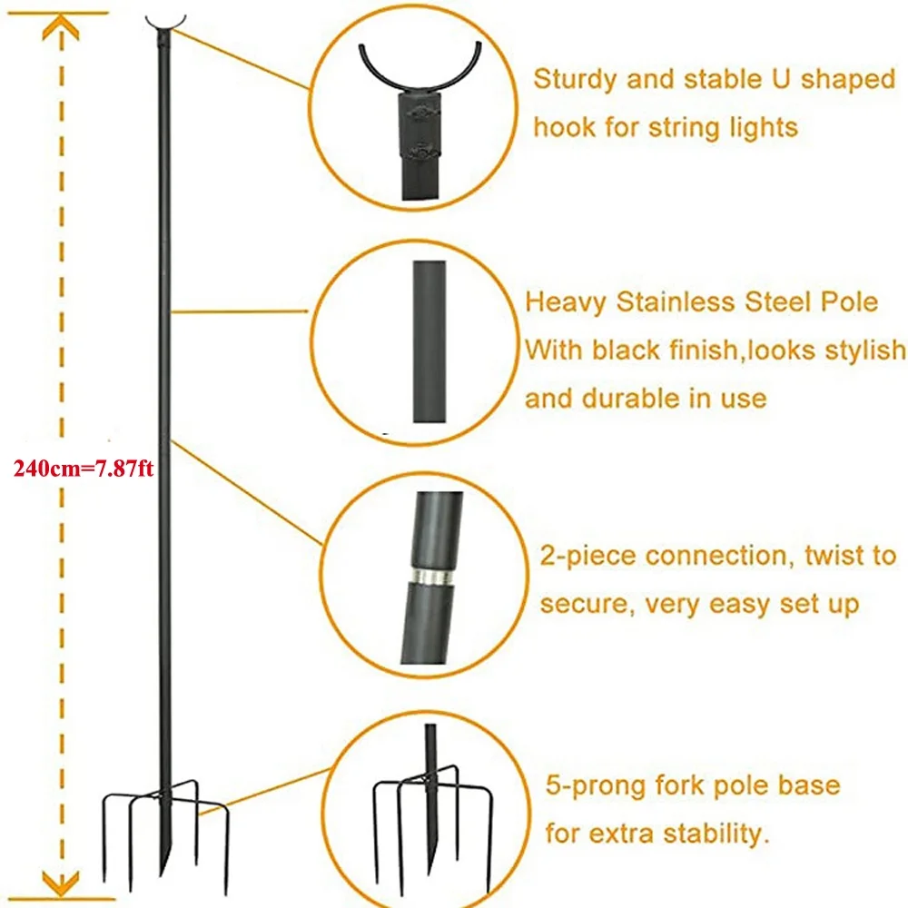 Poles extend to 7.8 feet tall. The outdoor string light pole with 4-fork base enable the pole stand firm in the soil or grass straightly and stably, (If the soil gets soft, you could add concrete to make the soil hard & firm enough to hold the pole).The optimal pole distance for light-weight lights is 12ft-15ft, while the pole distance for heavy lights is 6.5ft-10ft. No climbing ladders with this simple twist connection. Just plant the bottom pole into the ground by pressing the forked end into the dirt and then affix the top half with a twist. String light pole was designed to suspend festive lines of outside string lights, they can also be used for displaying all kinds of decor including banners, streamer, lanterns, balloons or garland. Best for outdoor party, holiday, Halloween, Christmas, wedding, birthday decorations.