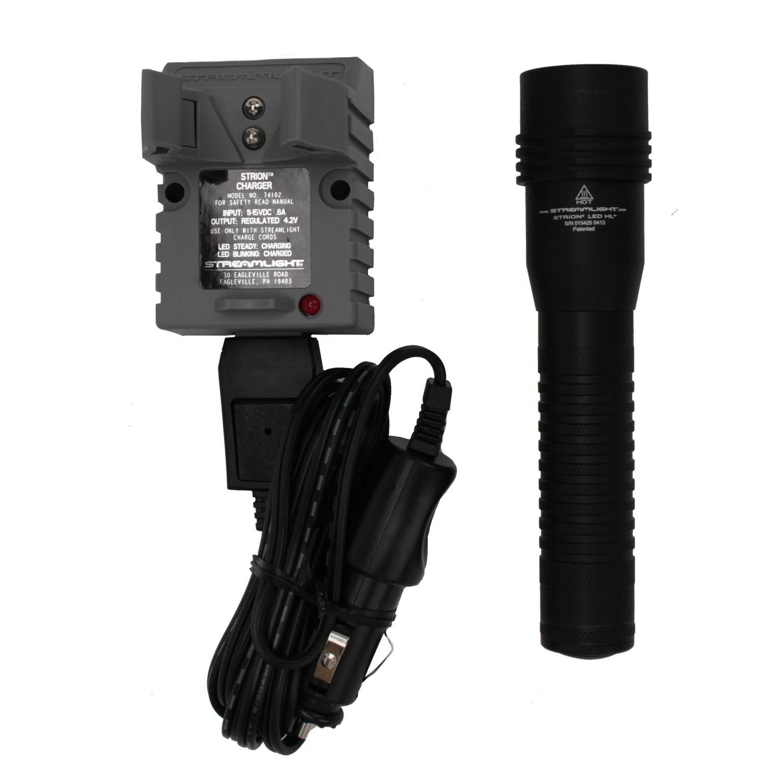 Streamlight Strion LED HL with 12V DC. Streamlight s HL Series – now available in compact rechargeable systems!When you need maximum illumination with a wide beam to search a large area the Strion LED HL rechargeable, high lumen flashlight provides a blast of 500 lumens with 200 meters of beam distance. Features: – Multi-function On/Off push-button tail switch lets you choose three lighting modes and strobe – Three modes and strobe: – High for a super-bright beam – 500 lumens; 10, 000 candela peak beam intensity; 200 meter beam distance; runs 1 hour – Medium for bright light and longer run times 250 lumens; 5, 000 candela peak beam intensity; 141 meter beam distance; runs 2 hours – Low for light without glare and extended run times 125 lumens; 2, 500 candela peak beam intensity; 100 meter beam distance; runs 3.5 hours – Strobe for disorienting or signaling your location; runs 2.5 hours – C4 LED technology, impervious to shock with a 50, 000 hour lifetime – Lithium ion battery is rechargeable up to 1000 times; fully recharges in 3 hrs. – Clamp style charger holder with digital control circuit that prevents over-charge; LED indicates charge status – IPX4 water-resistant; 2 meter impact resistance tested – 6000 series machined aircraft aluminum with anodized finish – Borofloat high temperature glass lens – Anti-roll head prevents the light from rolling away when you set it down – Grooved barrel adapts to long gun mount – 5.9″ (14.99 cm) ; 5.2 oz. (148 grams) – Serialized for positive identification – Assembled in USA This item will be shipped in compliance with all USPS regulations or will be shipped ORM-D (which requires the package be marked as such) with domestic shipping only.