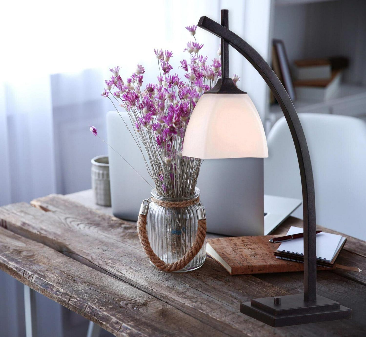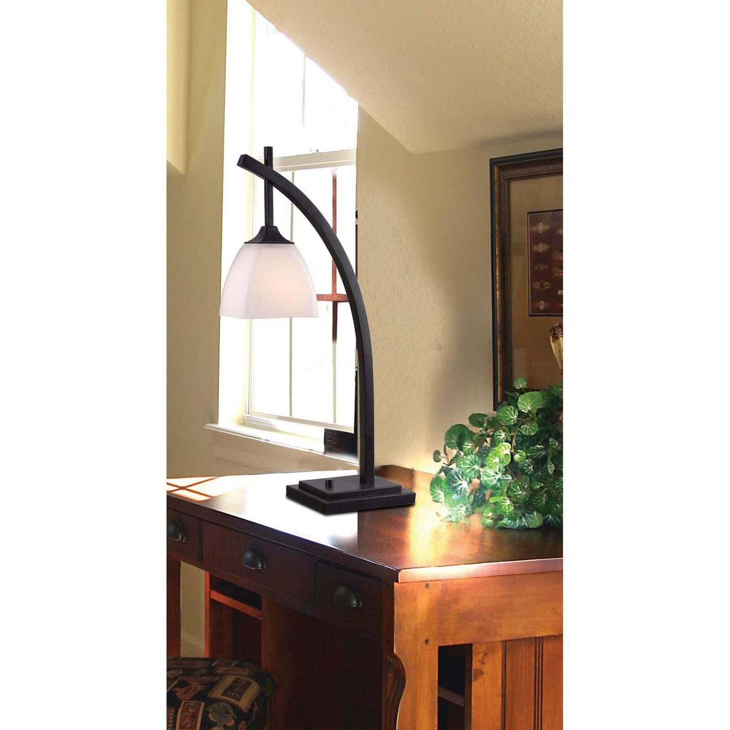 Beautify your home or office with this transitional table lamp collection, simple yet impactful design elements provide the perfect balance of form and function. Finished in a rich golden flecked bronze, and featuring a soft white rectangular shade, the angular supporting arm of this lamp allows for focused yet out of the way illumination for reading or other deskside tasks. The single light model rests at 24-inches in height and features a desktop space-saving footprint of only 6-inches in width. Each model features an easy to access on/off switch found in the stepped design of the base.