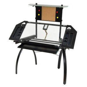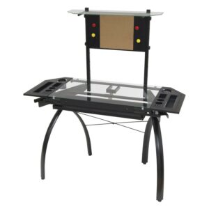 With the Futura Tower, there’s a place for everything. Office and arts supplies, notes, photos the Futura Tower stores it all over a 32.5″ W x 20.5″ D tempered safety-glass work surface. Constructed of durable heavy-gauge steel with a powder-coated finish, the desk features a 9″ W x 24″ L shelf tower and an extra large slide-out drawer for storage. A 24-inch pencil ledge slides up and locks into place when needed. Includes four removable art trays, two cup holders and a combo magnetic/cork board (four magnets included) add to its versatility. Floor levelers on each leg provide stability on any surface.