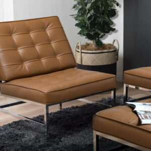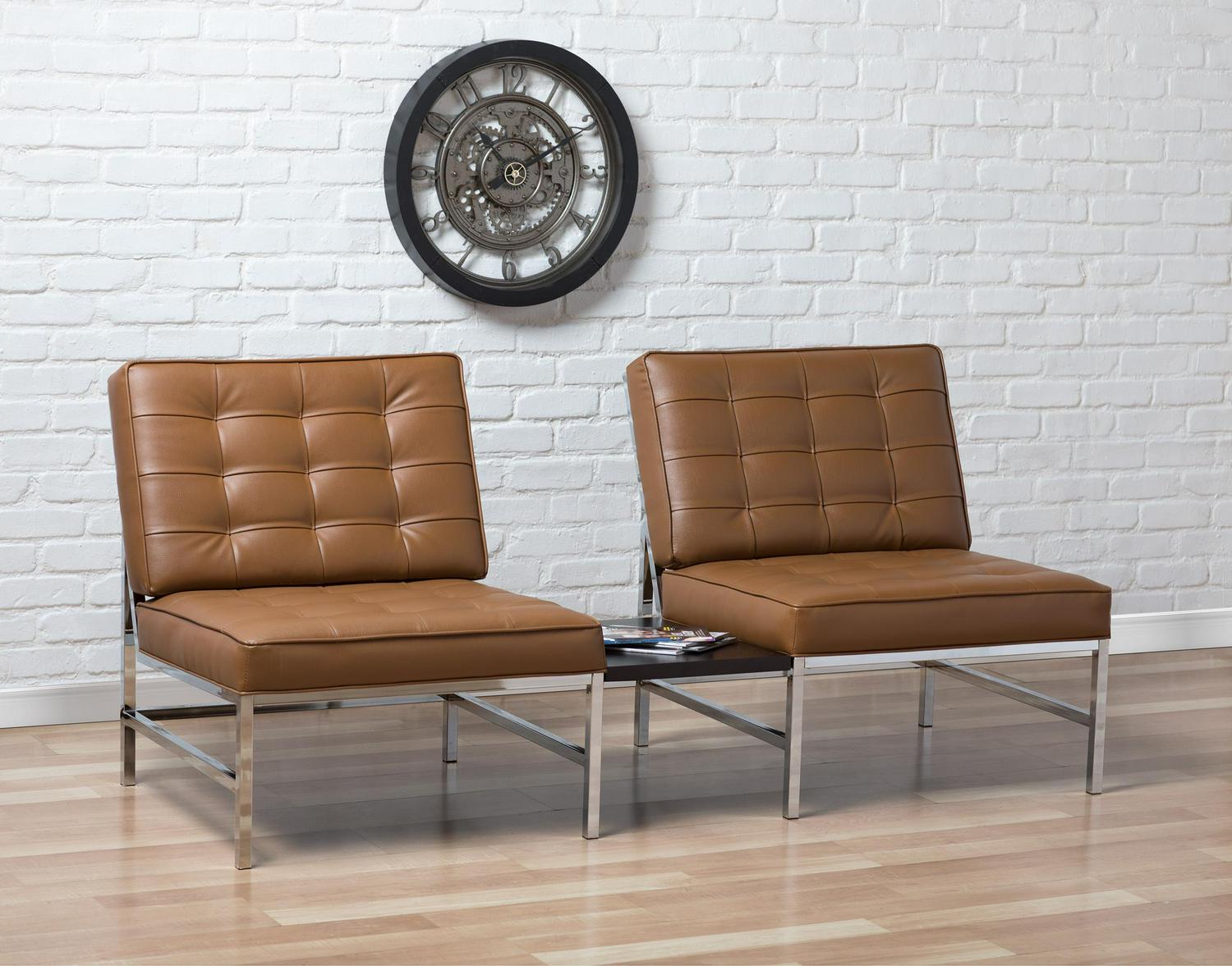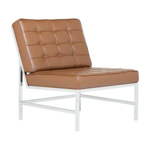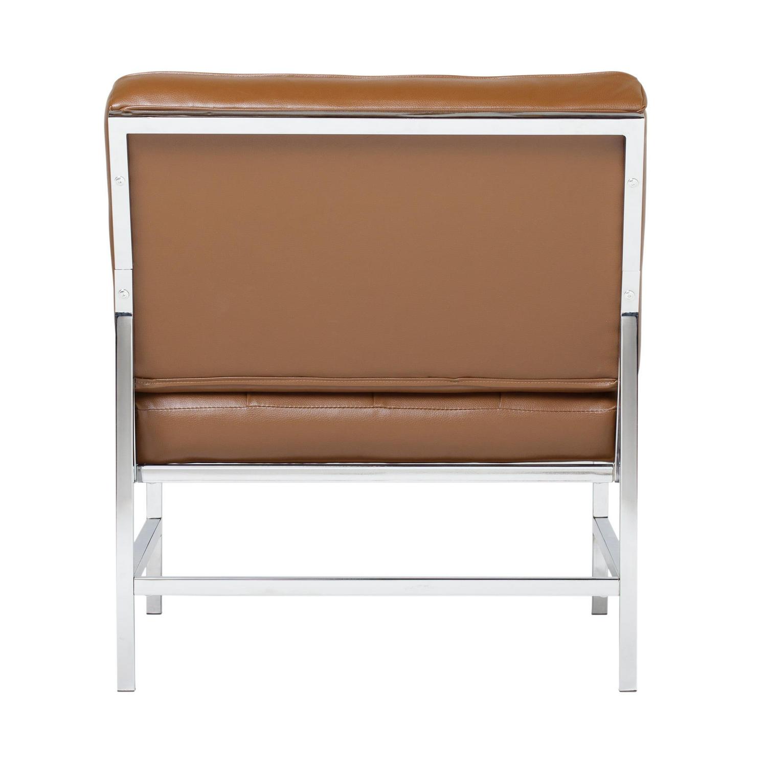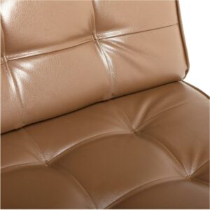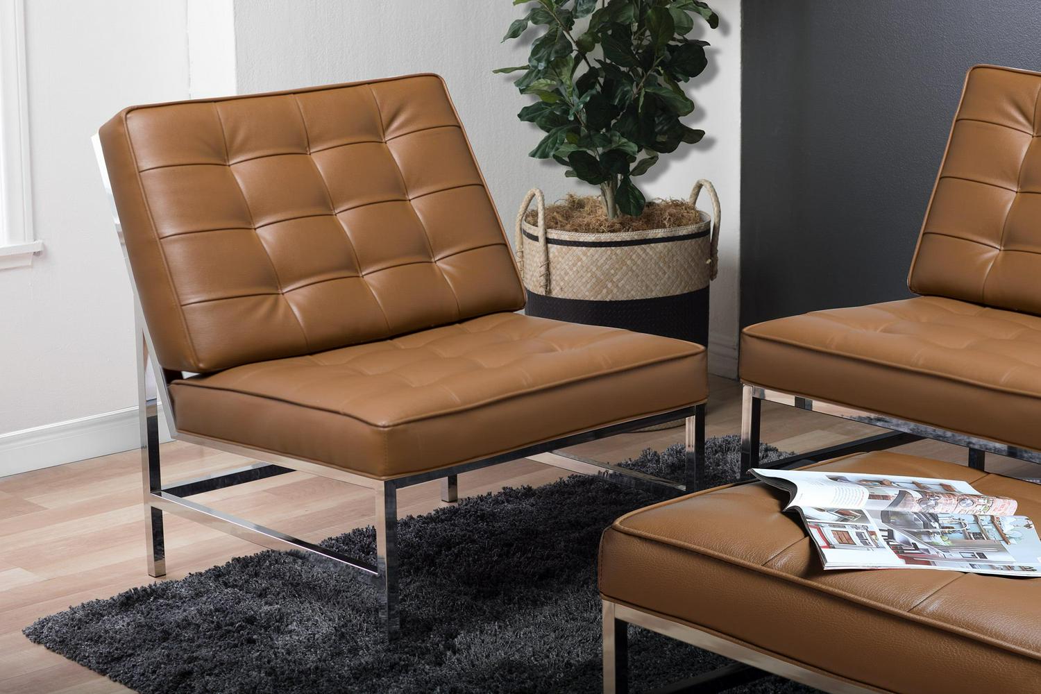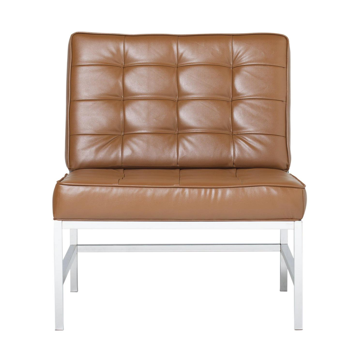 Create stylish seating amenities for your lounge or living room with the Studio Designs Ashlar Bonded Leather Chair. Featuring an armless design with an extra-wide seat and sloped backrest, this chair is designed to provide luxurious accommodations for guests and family alike. Its tufted caramel leather upholstery is amply padded for premium comfort, and its sturdy metal frame is adorned with a sleek chrome finish for a modern look.