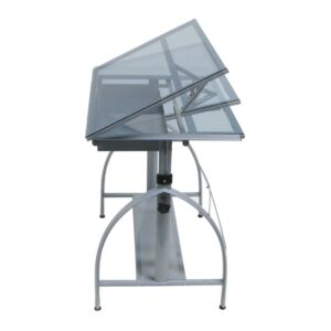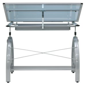 Studio Designs Avanta Height Adjustable Blue Tempered Glass Top Drafting Table – Silver The Avanta Drafting Table is great for its versatility. Constructed of durable heavy gage steel and a blue tempered safety-glass top, it can be used as a multi-purpose drafting, light, or craft table. The vertical height is adjustable up to 38” and the main work surface (42”W x 24”D) may be angled up to 30 degrees. Also featured are a large drawer and bottom shelf for storage and a 24” pencil ledge that slides up and locks into place when needed. Its four floor levelers provide stability any surface.