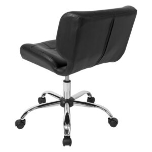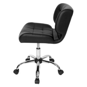 The Studio Designs Black Crest Office Chair is built for the busy professional. This chair features a sleek, armless design and is made mobile with wheels and a 360° swivel. The seat is made of black vinyl with cushioning for comfort. Grid stitching and a mirrored chrome, five-star base give this office chair a modern design. The seat height can be easily adjusted to best fit the height of your desk.