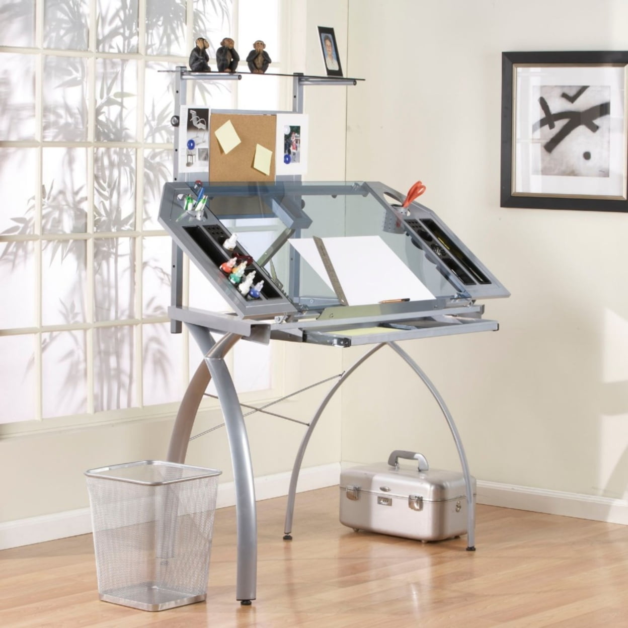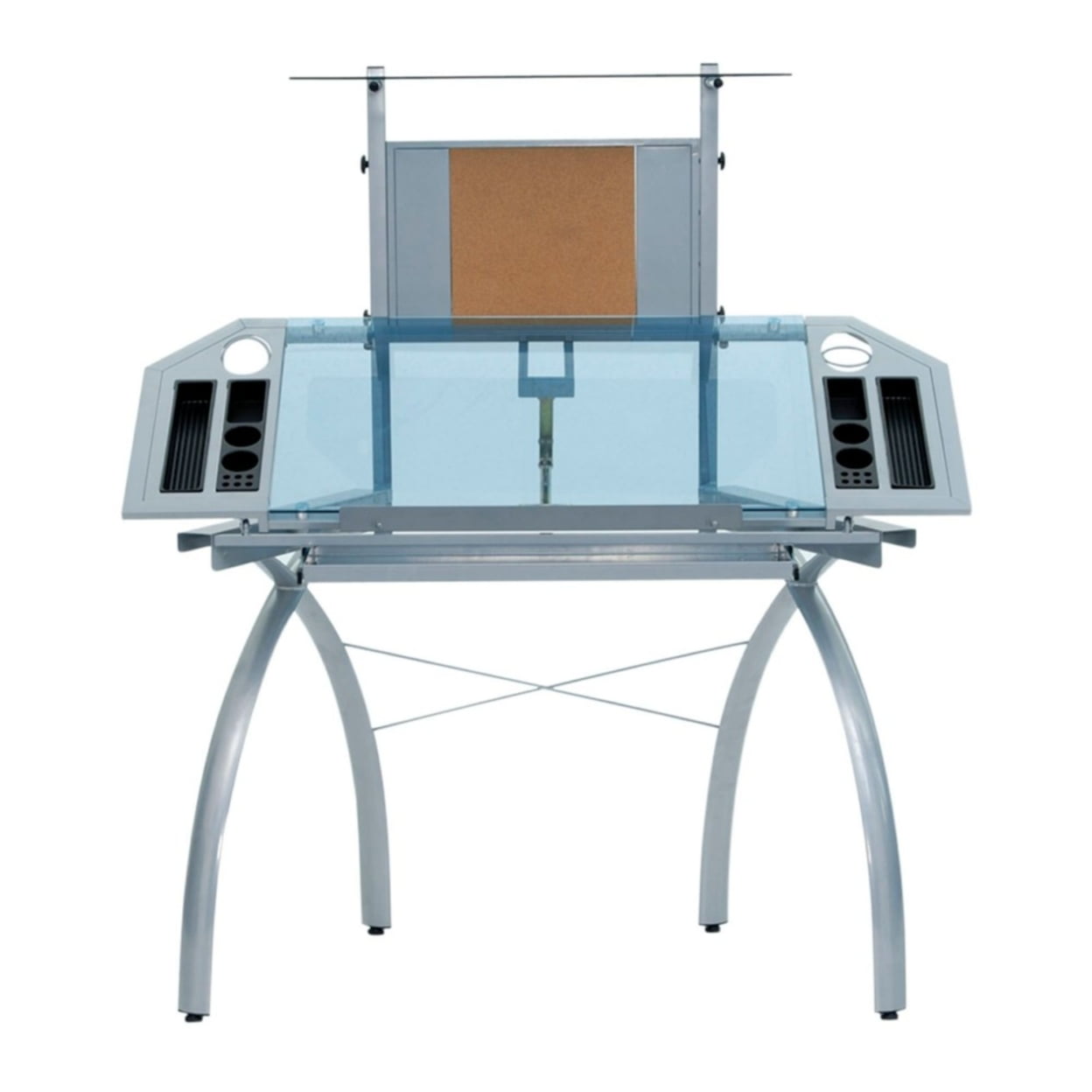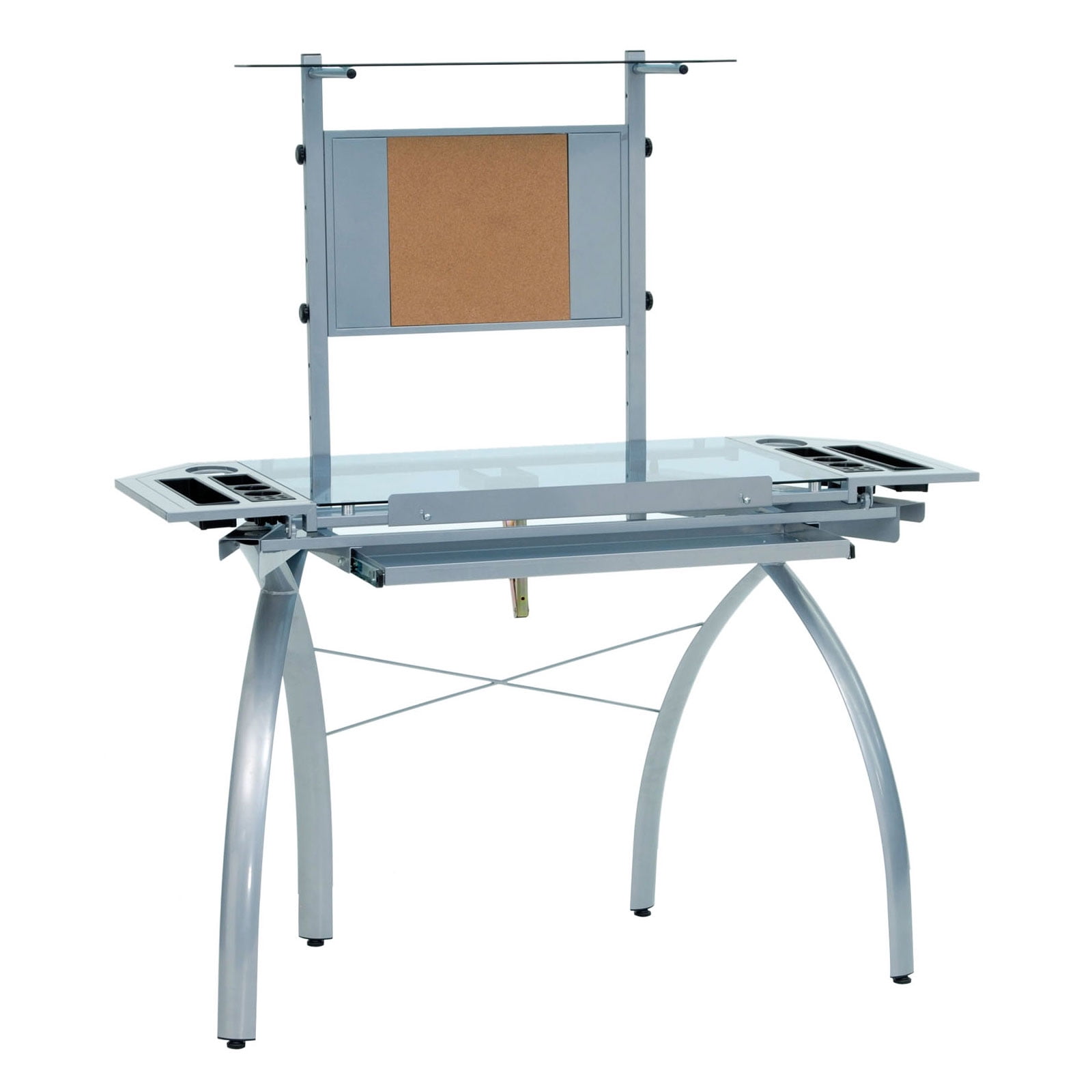Studio Designs Futura Metal and Glass Corner Drafting Table with Cork Board and Storage in Silver