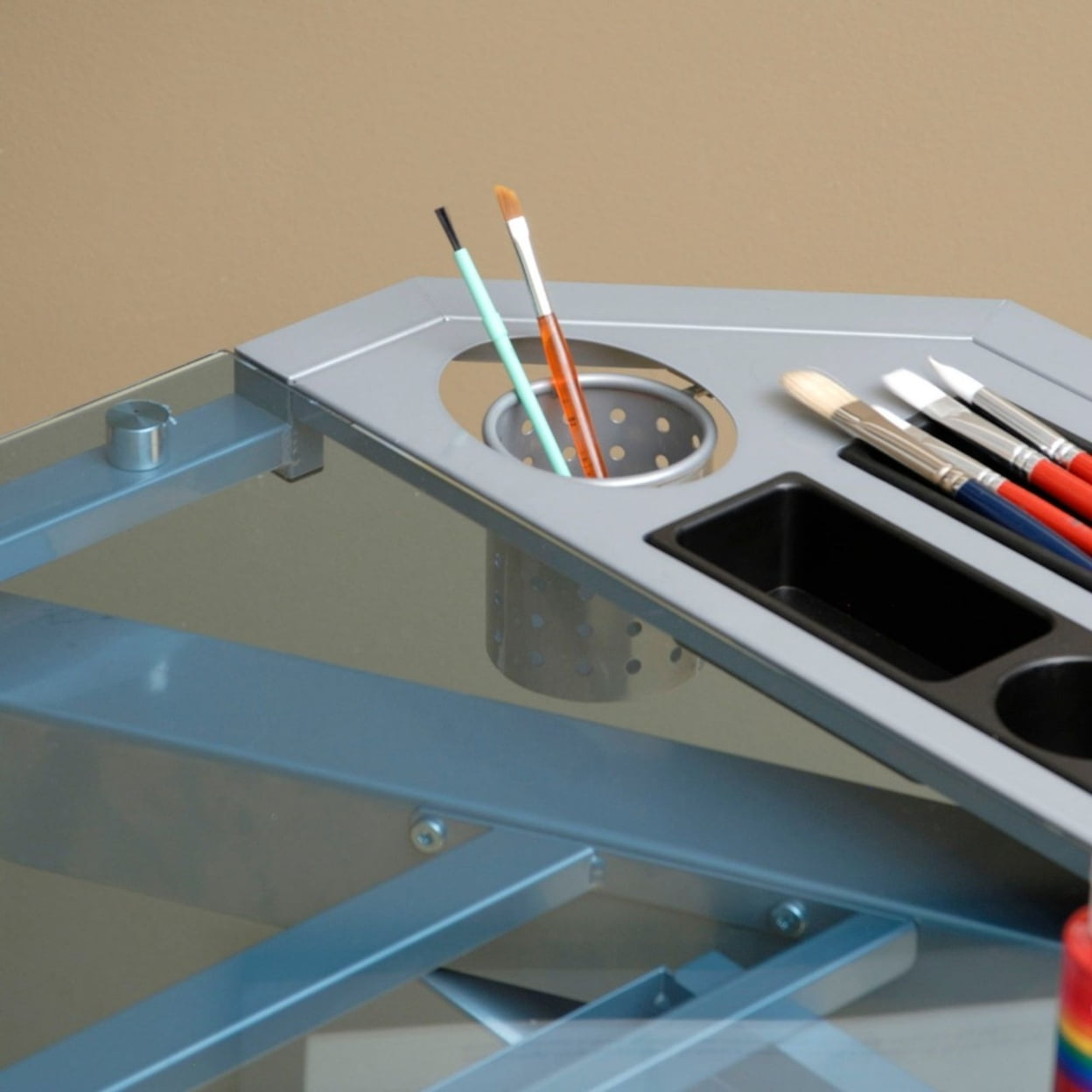 Whether you need a space for crafts, drawing, painting, or drafting, the Studio Designs Futura Tower Adjustable Drafting Table fits the bill for any budding designer or artist. This desk is the perfect drafting or drawing station. The table has a 33 x 21 inch work surface made of durable, tempered blue safety glass. Meanwhile, you can adjust the work top through 6 positions up to 40 degrees to suit your individual or project needs. This table also features 4 art trays, a large supply drawer, sliding pencil ledge, tower shelf, cork board, and even 2 cup holders. Long story short, it has plenty of storage space. Unleash your creative side with a creation space of your own with the Studio Designs Futura Tower Adjustable Drafting Table.