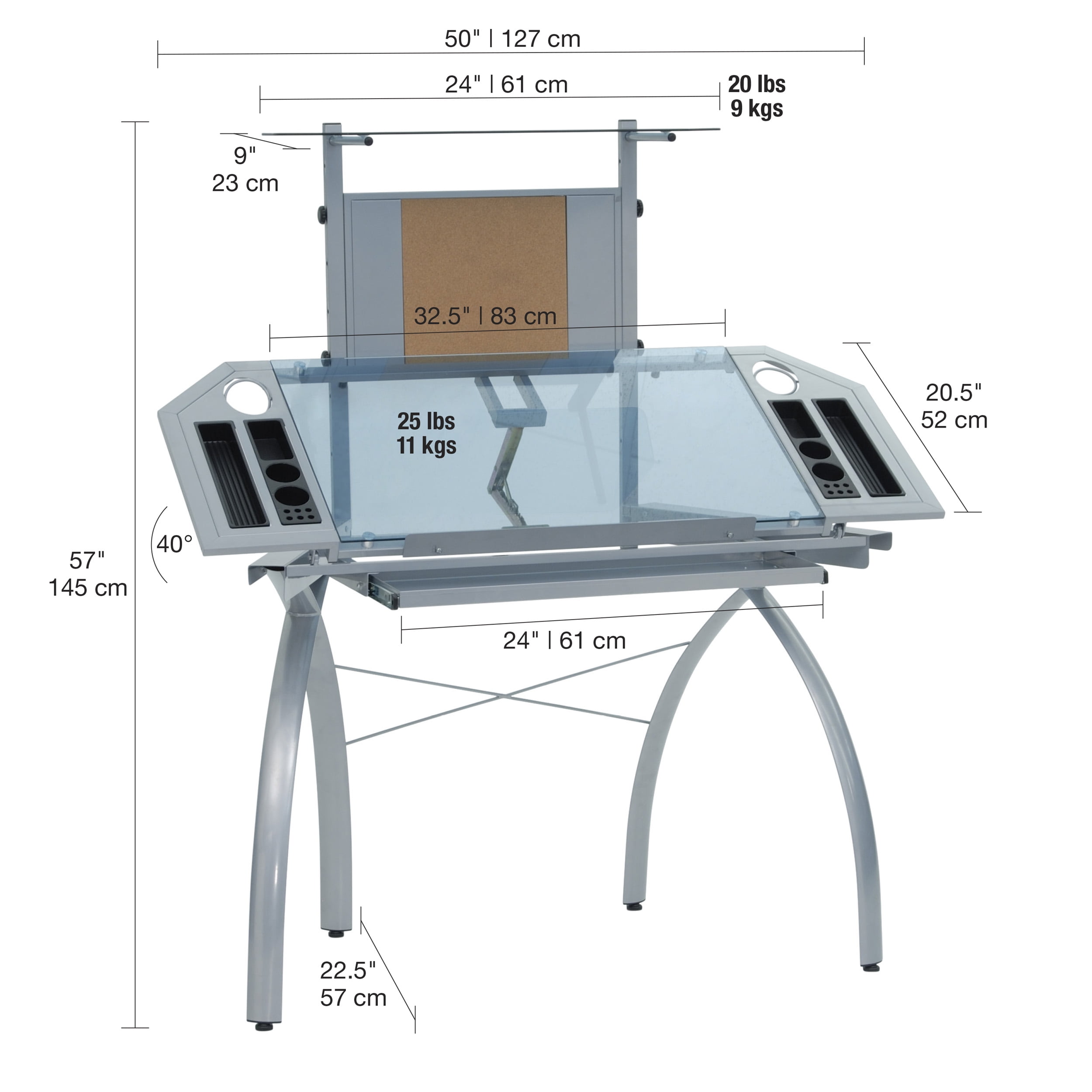 Overall Dimensions: 50″W x 22.5″D x 57″H Main Work Surface: 32.5″W x 20.5″D with Tempered Glass for Safety and (4) Removable Art Trays for Pens, Pencils, Brushes & Supplies 6 Top Angle Adjustments from Flat to 40 Degrees Two Cup Holders for Water Bottles, Drinks or Supplies and Extra Large 24″W x 10″D Pencil & Supply Drawer 24″ Slide Up Pencil Ledge 24″W x 9″D Tower Shelf for Storage with Tempered Glass Combo Magnetic / Cork Board with 4 Magnets