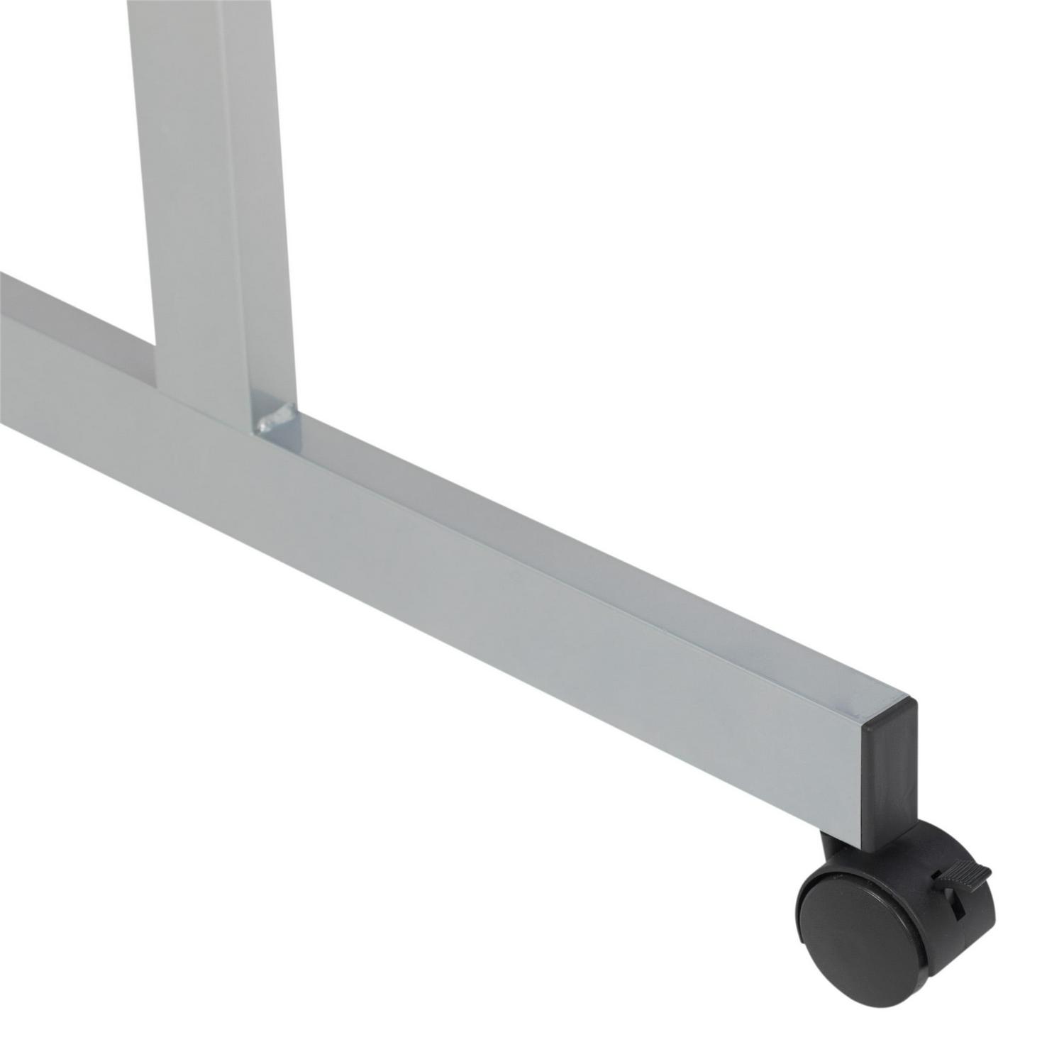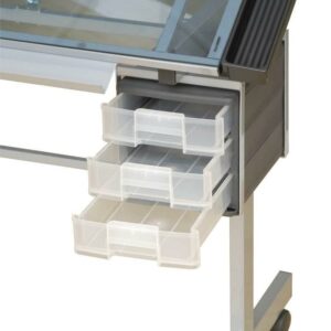 Great for drafting, drawing, and general computer desk type stuff, this large and stylish drafting table has all the needed perks for a productive work station. On either side can be positioned convenient auxiliary storage trays for quick access to your materials. Below is fixed a trio of drawers to help you keep your work area tidy. And at the base of the table is a wide pencil ledge designed to keep things within your immediate reach. All this is mounted on four rolling casters to make it easy for rearranging, cleaning, and moving, which leaves plenty of time for productivity. Note: this table is not compatible with a mounted parallel bar. However, a T-square may be used by simply removing the side tray.