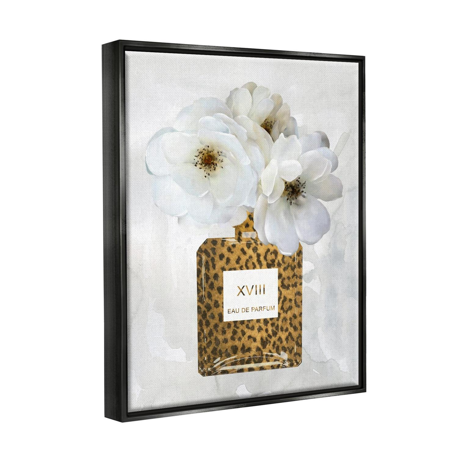 Stupell Industries Leopard Print Perfume Bottle Glam White Spring Florals Jet Black Framed Floating Canvas Wall Art, 16×20, by Carol Robinson