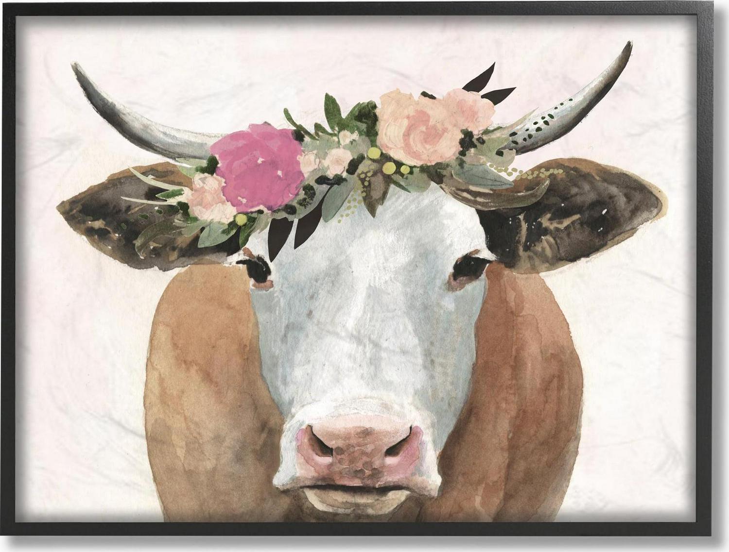 Stupell Industries Springtime Flower Crown Farm Cow with Horns Framed Wall Art by Victoria Borges