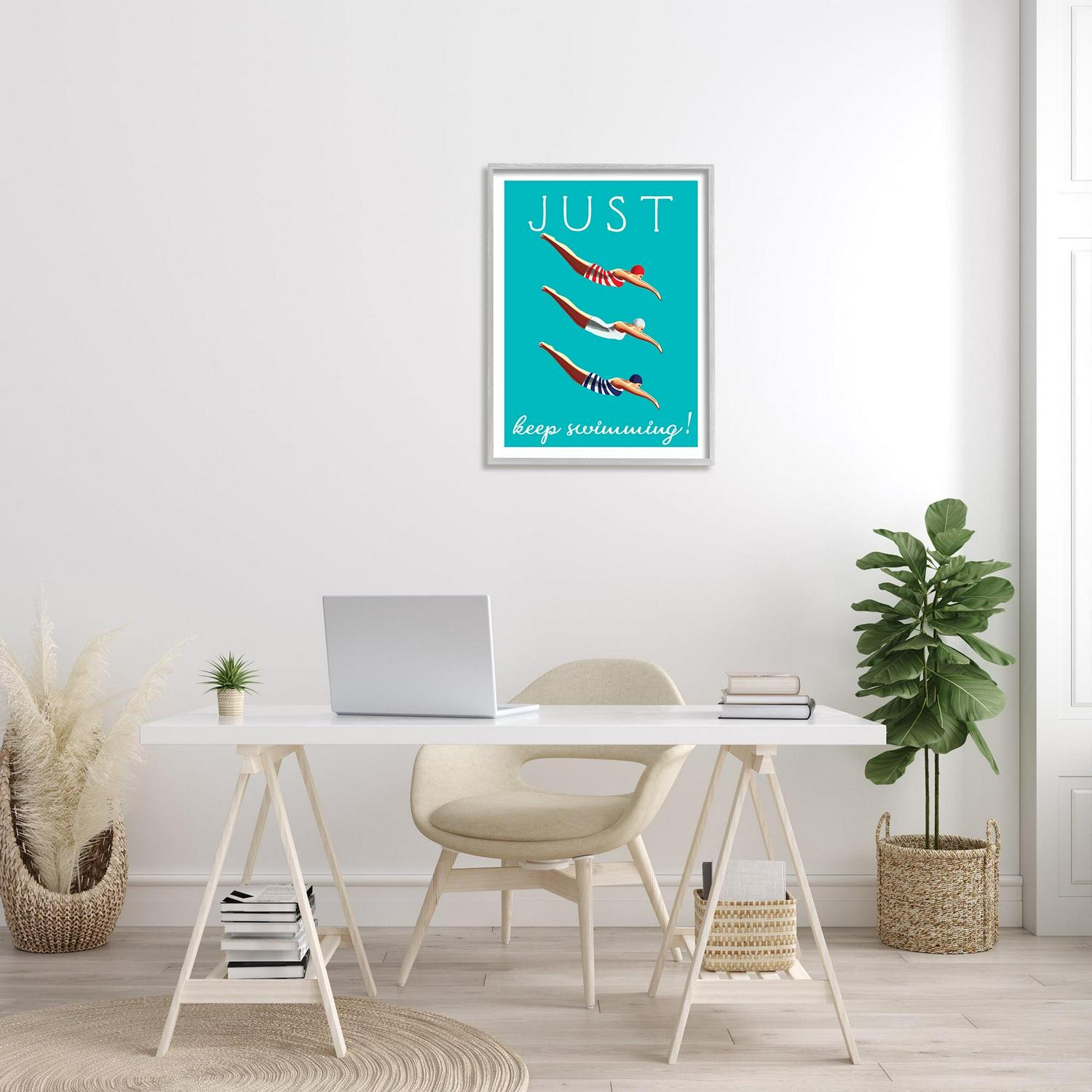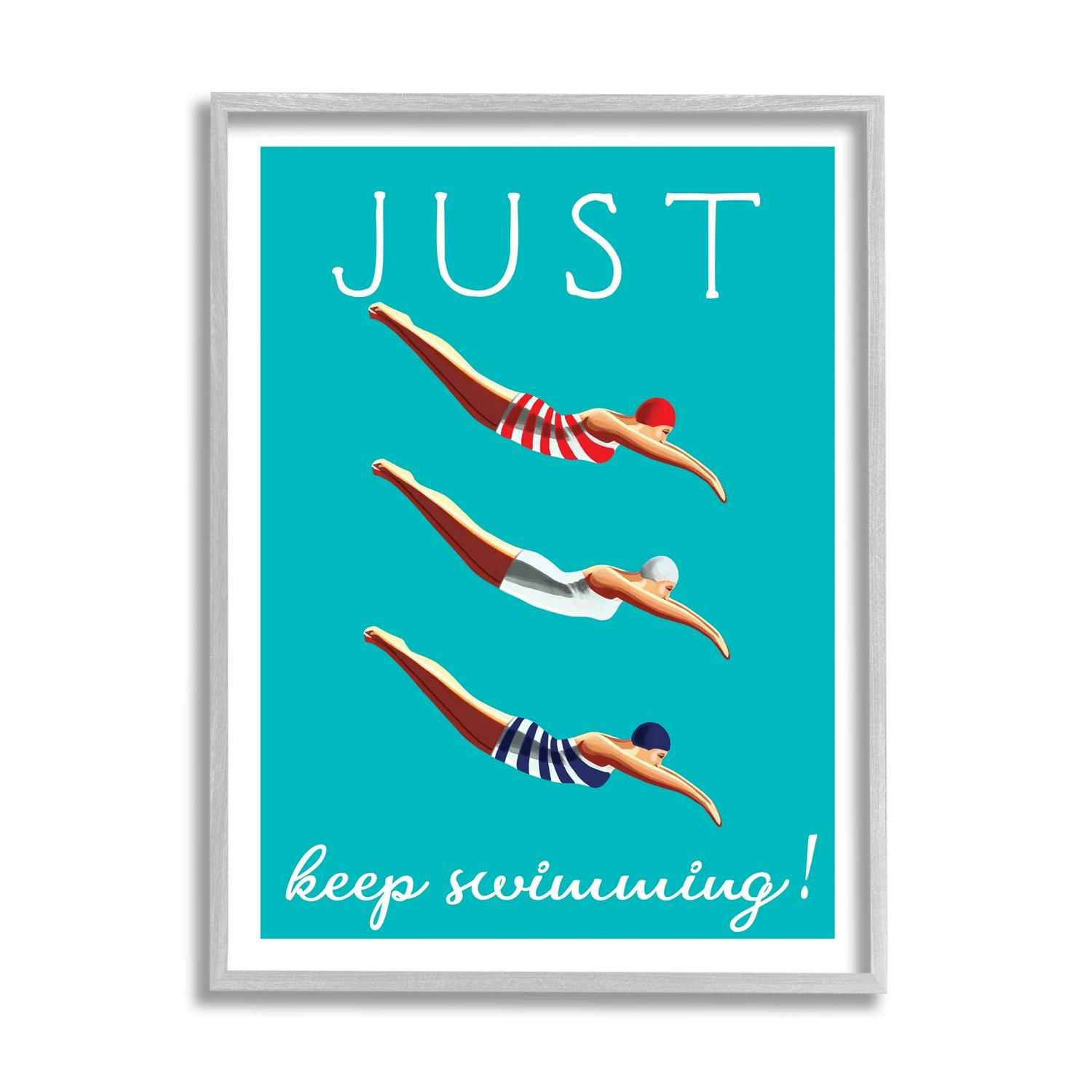 Stupell Industries Trio of Female Divers Just Keep Swimming Phrase Coastal Painting Gray Framed Art Print Wall Art, 24 x 30, Design by Elizabeth Tyndall