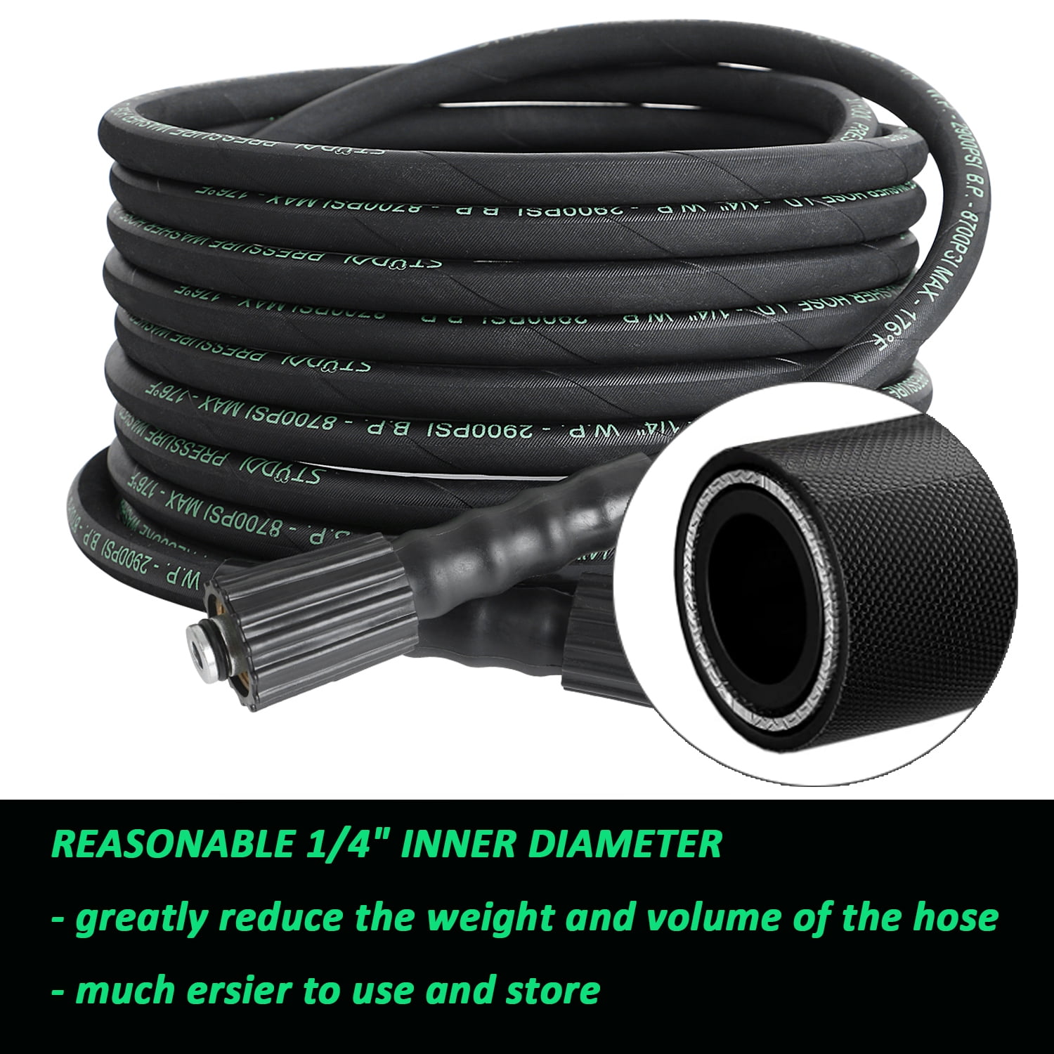 COMPATIBLE WITH SUN JOE PRESSURE WASHER PART NUMBERS – Work for SPX-25H, SPX-25HD, SPX3000-33 | DOES NOT FIT SPX 1500 or 1501 pressure washer models WORKS WITH HOT WATER UP TO 212°F – This pressure washer hose is designed for hot and cold water, being capable of temperatures up to 212°F. Hot water is more effective than cold water at tackling grease, oils and stubborn stains. This feature makes the hose an effective and solid choice for household & commercial pressure washing during all seasons. ENTIRE RUBBER CONSTRUCTION WITH A LAYER OF STEEL-WIRE BRAID IN THE MIDDLE – This upgraded pressure washer hose is made from high-tensile braided steel wrapped in rubber for the ultimate durability. It is solid while also flexible. The combination of high-quality materials and high-tech craftsmanship brings excellent oil resistance, aging resistance, abrasion resistance, and heat resistance. 50 FEET IN LENGTH AND 1/4 INCH IN DIAMETER – This pressure washer hose is 25 feet long and can withstand a maximum pressure of 2900psi, which is strong enough to effectively meeting most cleaning tasks. The inner diameter of the hose is 1/4 inch, providing you with smooth water flow. UNIVERSAL M22-15MM THREAD AND A COUPLER FOR EXTENSION – This hose features with standard double M22-15mm female thread, and it can be easily and quickly connected to most high pressure washers and guns. It also comes with a brass M22-15mm adapter for hose extension. KINK RESISTANT POWER WASHER HOSE – This heavy-duty pressure washer hose is set out to avoid the frustration of kinks in the hose in the middle of washing. It is anti-kink and long-lasting, easy to carry, drag, roll up and store. Warm Tips: please roll the hose all the way out before first use, and then it will be easy to coil and uncoil for each use without kinking.