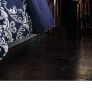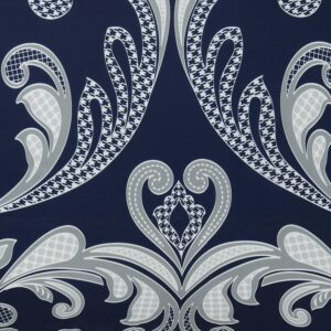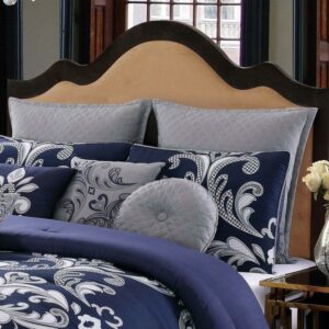 This traditional scroll pattern is dominated by a navy blue background with the large scale repeating scroll pattern in silver and white shades on the face of the comforter. The ensemble is a ten piece set with bed skirt and decorative pillows and shams which completed the whole bed. Face fabrics are 100% microfiber polyester and filled items use 100% polyester fiber filling. The pillow shams use the print from the comforter face, while the European shams use a solid silver color. The decorative pillows use alternative prints that coordinate to the top of the bed with a quilted round pillow, embroidered breakfast pillow and two square pillows.Includes: one comforter 90×90 inches, two shams 20×26 inches, two Euro shams 26×26 inches, one bedskirt 60×80 inches with a 15 inch pleated drop, and pillows: 16×16 printed, 12×16 embroidered, 16 inch round quilted, 16×16 inch square.Face is 100% microfiber polyester with 100% polyester fiber filling on items that are filled.Comforter and standard shams are machine washable in appropriate size machinery. Decorative items have spot cleaning suggested.All components are imported and were manufactured in China.