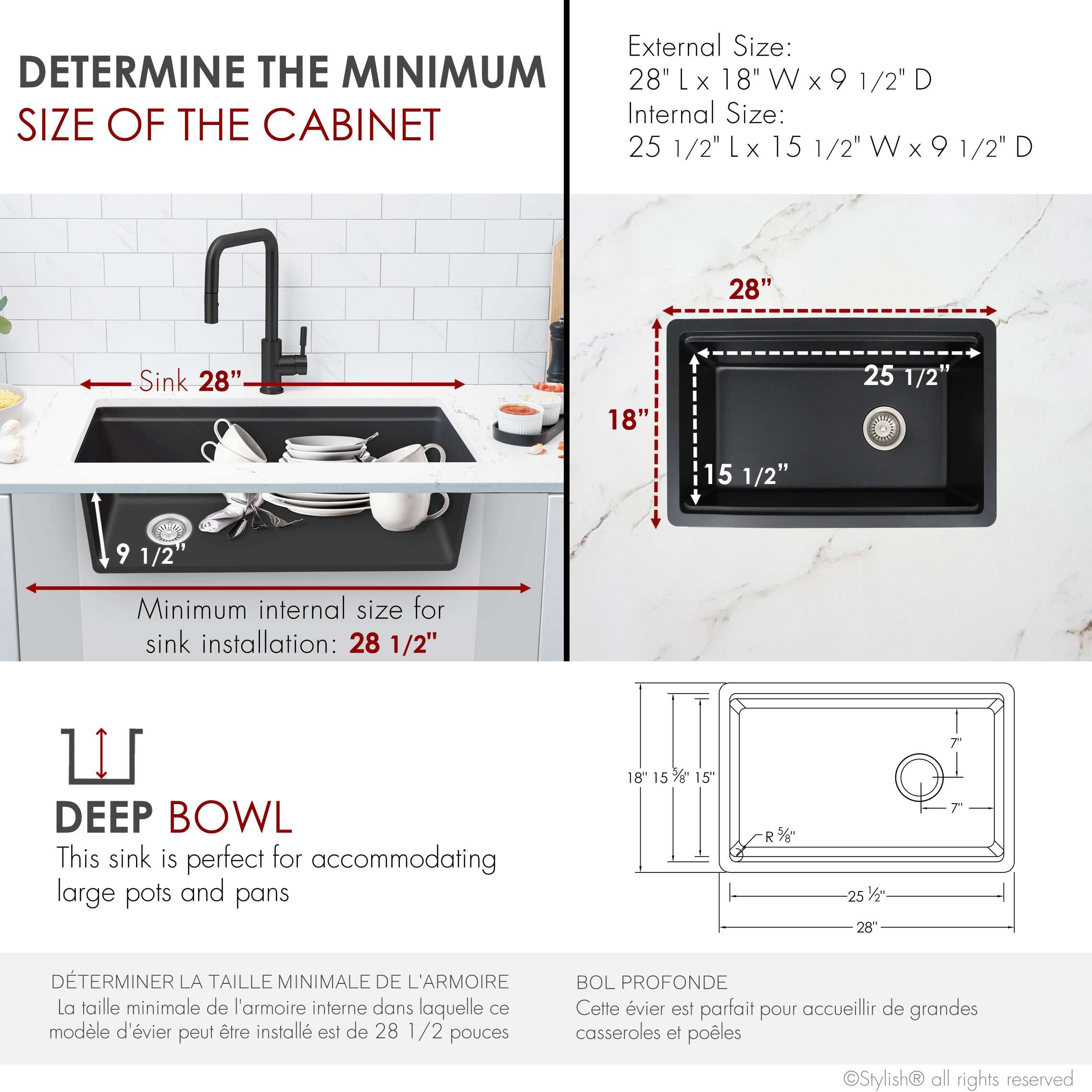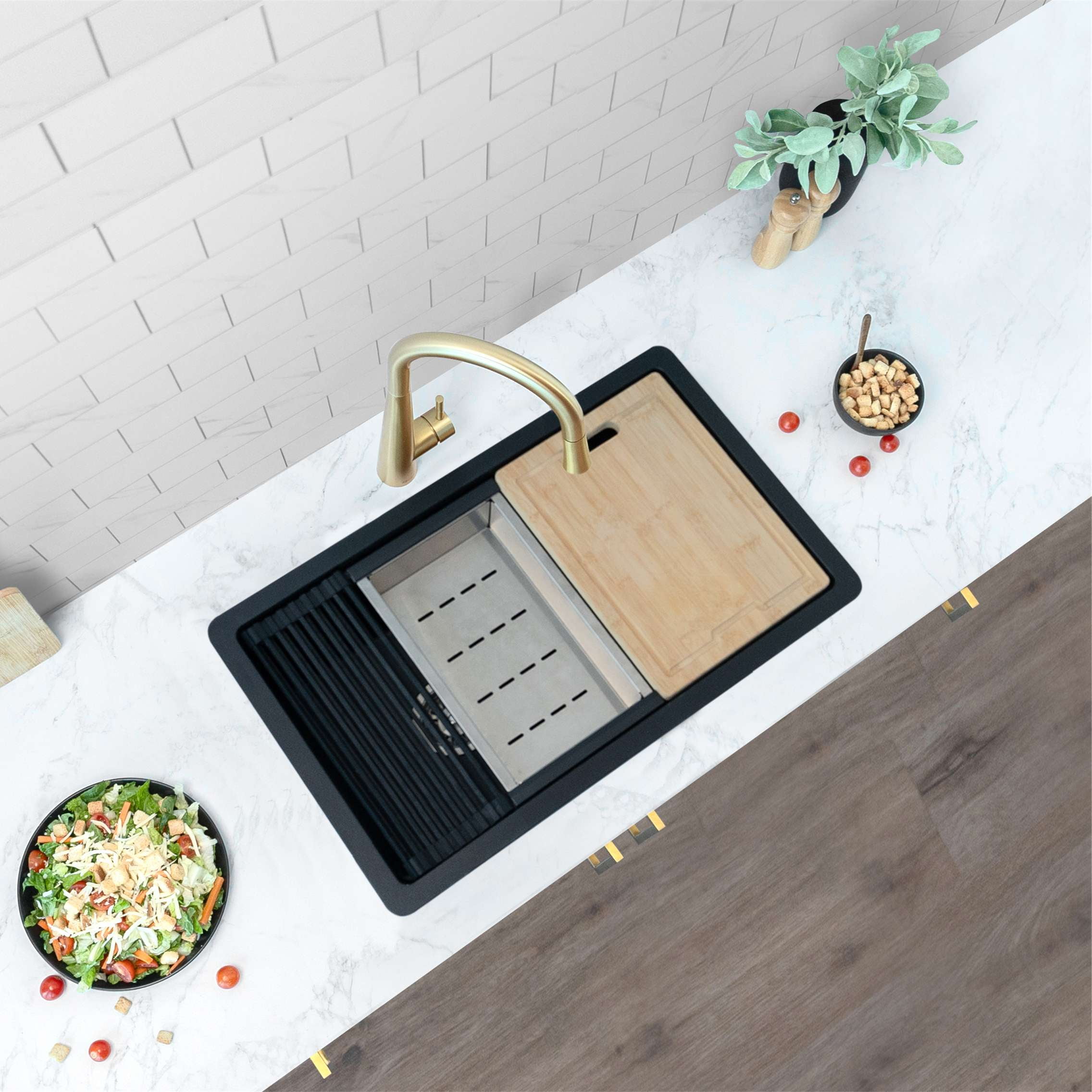 Upgrade your kitchen with our 28-inch composite granite workstation sink, blending clever modern design with exceptional functionality. Crafted with 80% natural quartz, this sink is durable, low-maintenance, and lighter than solid granite. The included strainer, drying rack, colander, and bamboo cutting board enhance your kitchen experience, conveniently fitting on the ledge. Highly resistant to dirt, the sink is easy to clean and can be dual-mounted over the countertop or as an undermount for a seamless look. The deep 9.5-inch bowl accommodates large cookware, while the thick granite minimizes noise. The reversible installation allows you to choose the drain’s placement, and it’s available in Black, Gray, and White, ensuring lasting color. Included are installation instructions and hardware for your convenience. Elevate your kitchen with this sleek, quiet, and versatile composite granite workstation sink.
