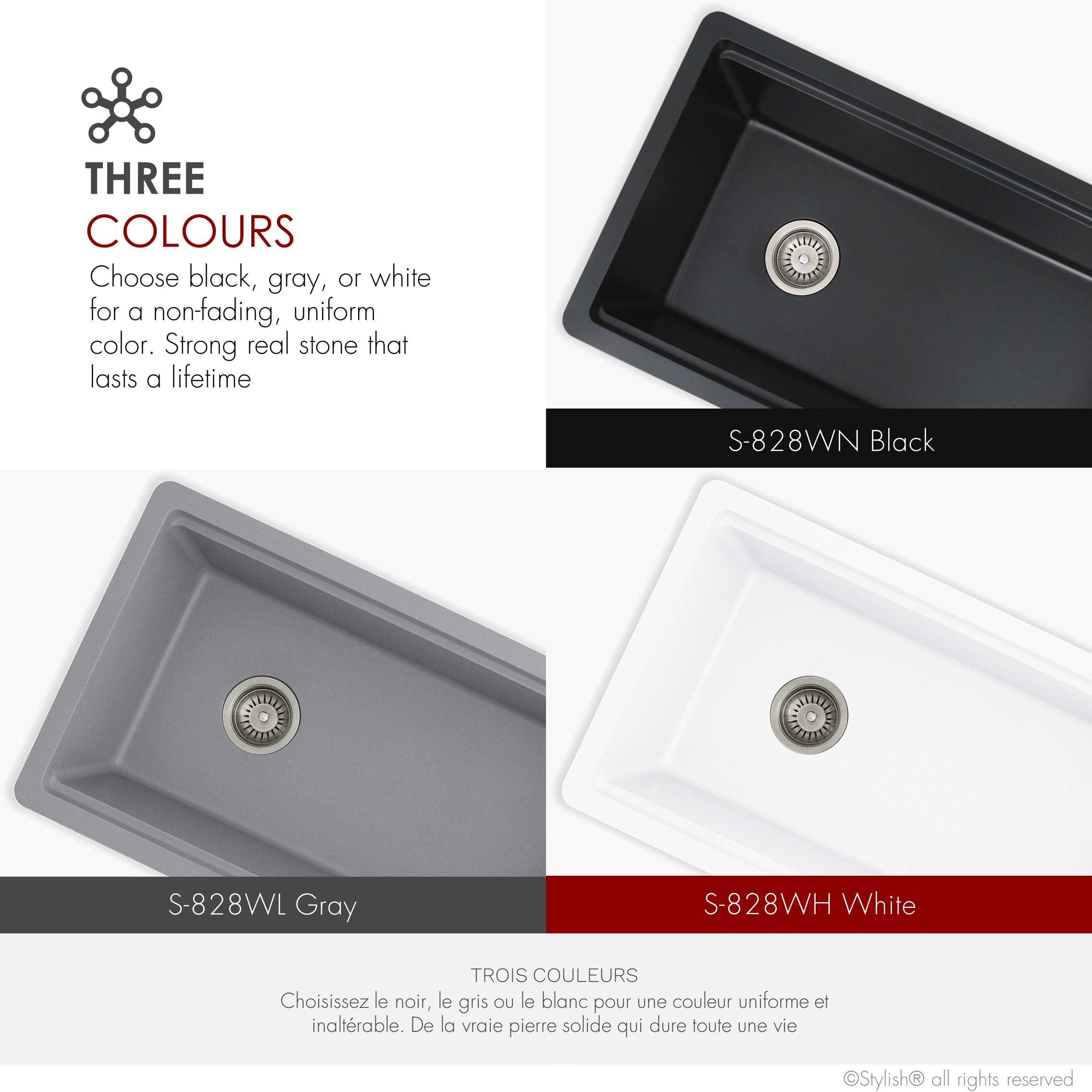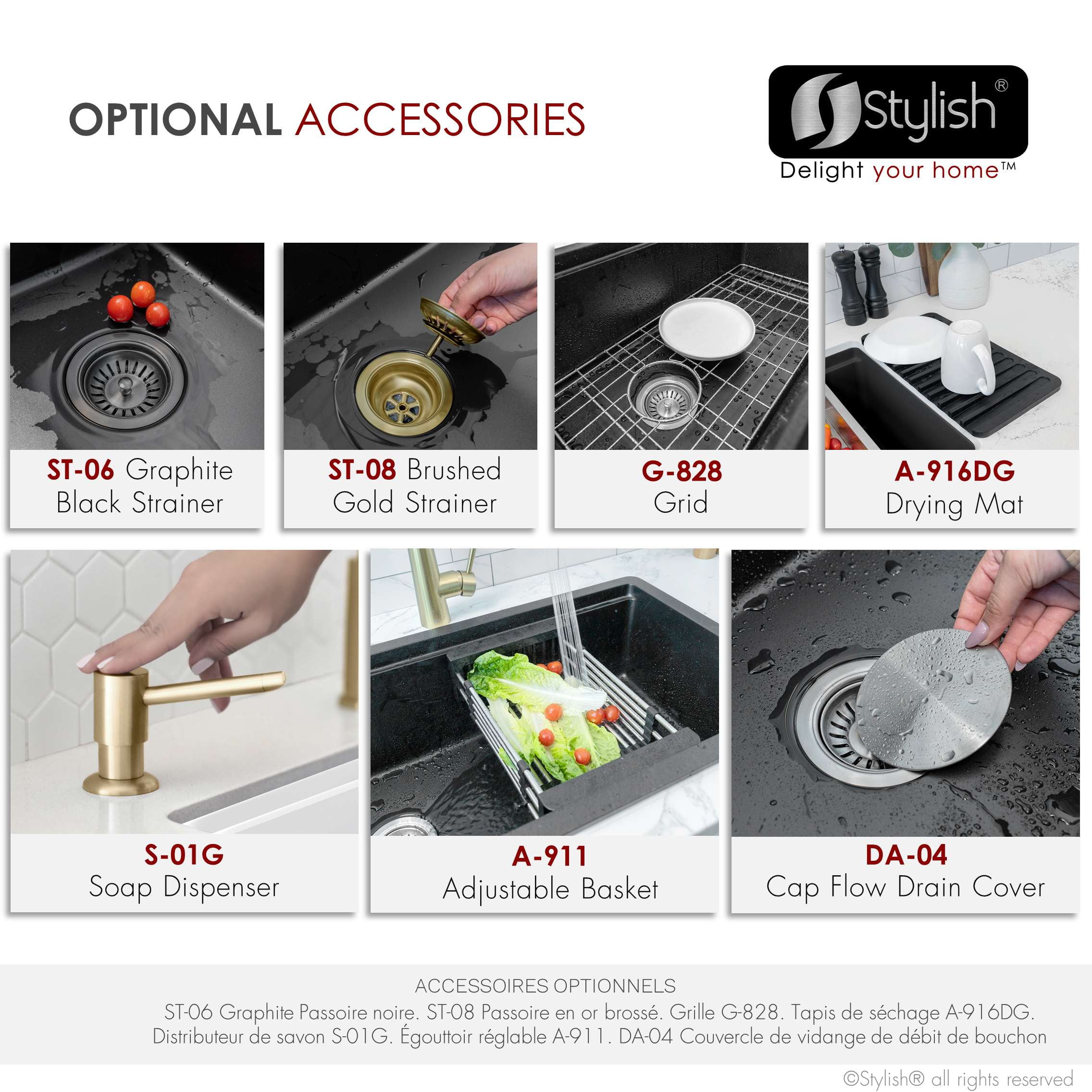 WORK DIRECTLY OVER THE SINK: This composite granite kitchen sink comes with great accessories that slide across the built-in ledge, saving space on the kitchen countertop, helping you use your space to the fullest. NATURAL QUARTZ AND LOW MAINTENANCE: Made from 80% Quartz and 20% Acrylic Resin, this special hardened composite is highly stain, scratch, heat and dent resistant, and is also extremely easy to clean and maintain. QUIET SINK: The thick composite granite helps to eliminate vibration and noise when sink is in use, ensuring that turning on your faucet won’t ever be anything less than enjoyable. CUTTING EDGE DESIGN: Pietra series sinks are designed to have a perfect balance for functionality and space, with elegant and smooth tight radius corners for easy cleaning as well as bold looks and a perfect slope to make water drain fast. THREE COLORS: Choose between black, gray or white. Whichever you choose, we can promise non-fading and uniform color will last a lifetime, with the look and feel of real stone. BEAUTY AND STRENTGH: Clean lines, simple shapes and small corners define this stunning composite granite sink, which combined with the vivid colors and stone appearance offer an amazing addition to your kitchen. DUAL MOUNT INSTALLATION: This sink can be installed as either undermount or drop-in, with smooth and flat flange for easy installation. REVERSIBLE INSTALLATION DESIGN: Designed with the ability to flip the sink around to switch whether the drain is on the left or right, giving you the freedom to choose whatever is convenient for your plumbing. SIDE CENTRE DRAIN: Allows for easy draining and more space inside the sink and under the kitchen cabinet. DEEP BOWL: A 9.5-inch-deep bowl allows to accommodate large pot and pans and prevent splashing. STANDARD STRAINER INCLUDED: allows water to pass through but also allows small food waste to be collected and thrown away, it will perfectly fit any sink with a 3.5” opening, which is industry standard. GARBAGE DISPOSAL: Stylish kitchen sinks come with the standard drain opening of 3.5” diameter that can fit any garbage disposal unit. Due to sink and garburator weight, we recommend adding two shelf “L” brackets, 14 inches long, under the sink bowl. PERFECT FIT ACCESSORIES: Complement the style and functionality of your sink with our accessories, designed to perfectly fit your single bowl dual mount composite granite sink while offering great convenience. The sink includes these high-quality accessories: ST-01 Stainless steel strainer A-04 Metal colander A-914BK roll-up drying rack A-909 Bamboo cutting board.