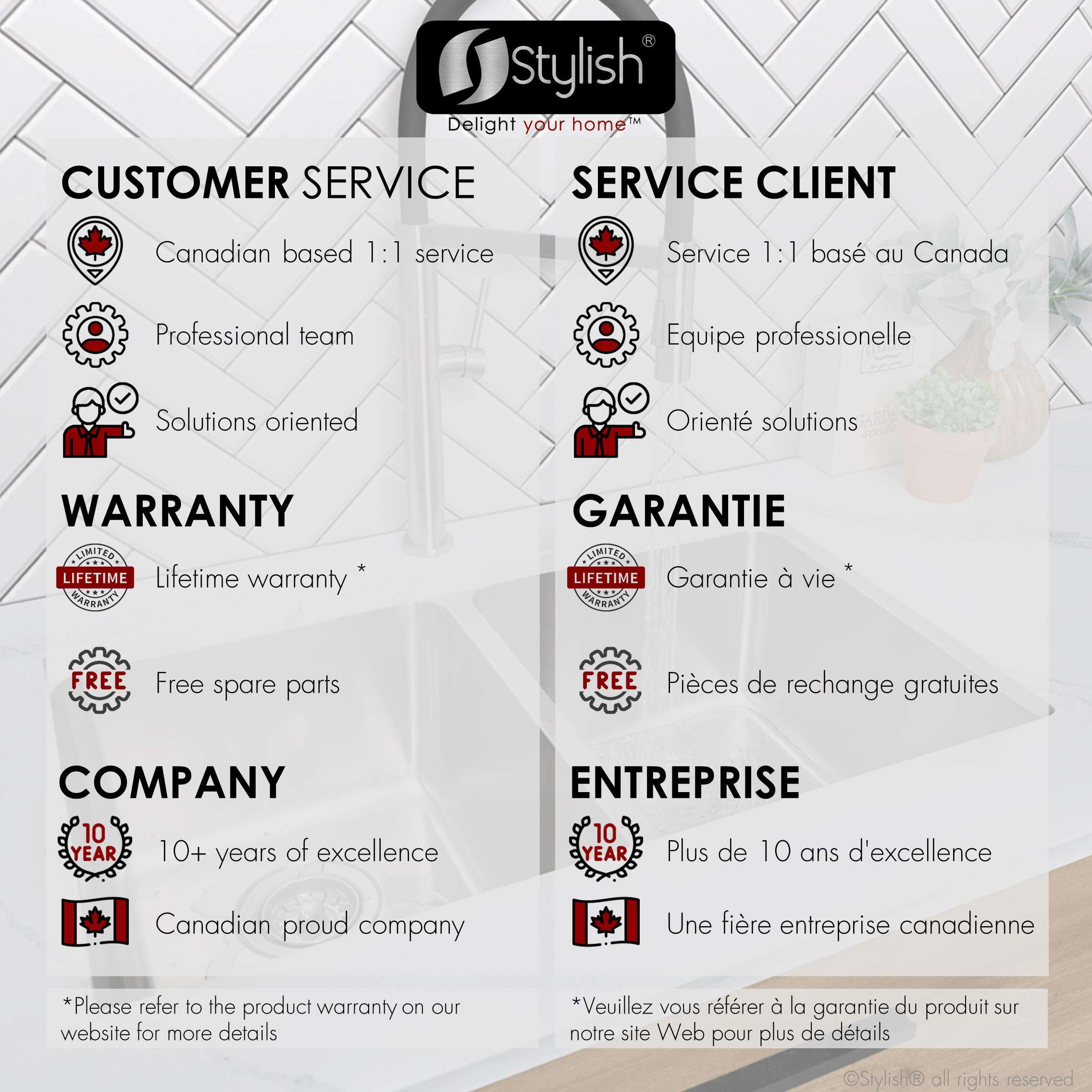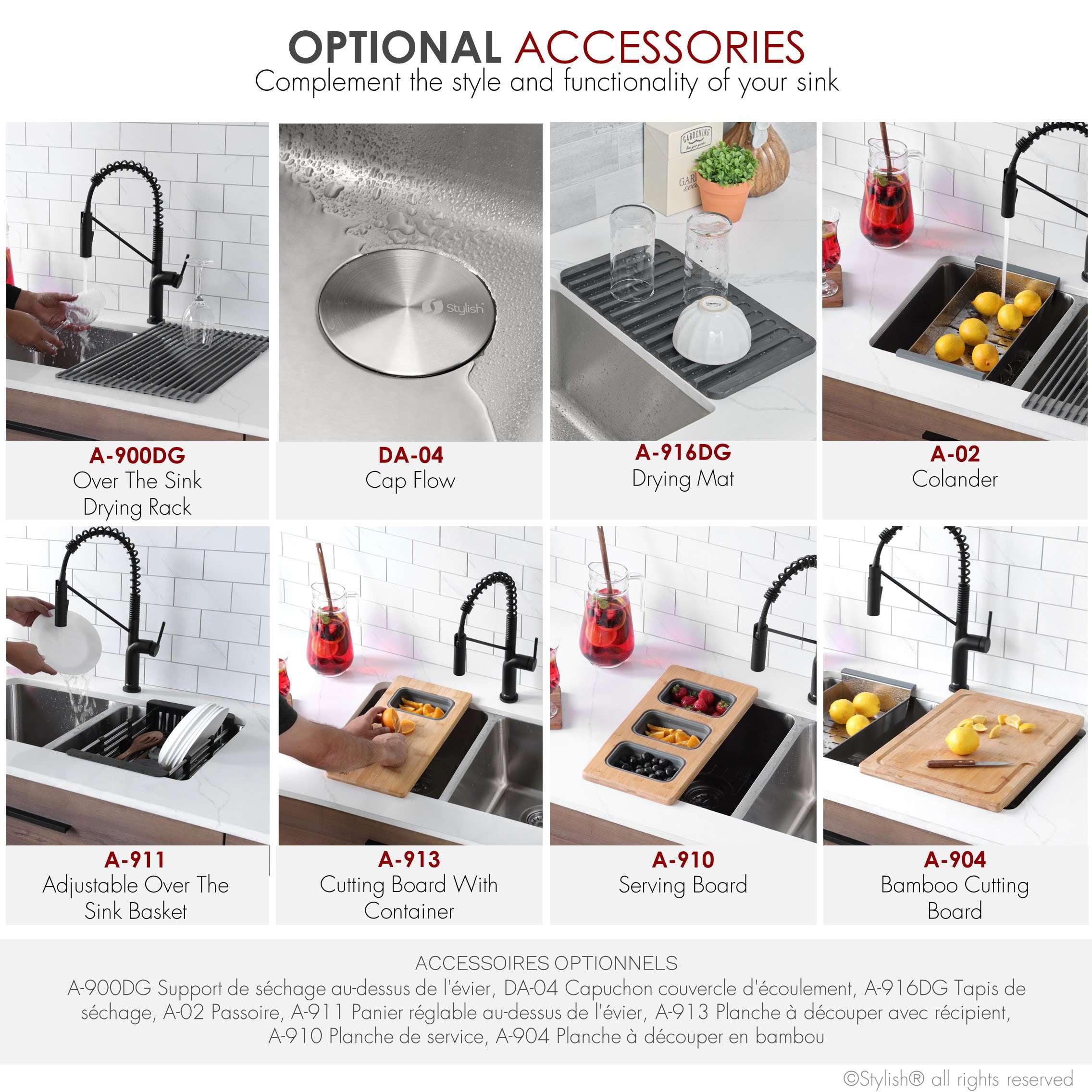 Stylish Dual-Mount 29″ Stainless Steel Double-Bowl Kitchen Sink S-414T Introducing our premium T-304 Stainless Steel Sink, meticulously crafted to bring functionality to your kitchen. With an exceptional blend of style and durability, this sink is designed to elevate your culinary experience. Constructed using premium materials, our sink features a composition of 18% Chromium and 10% Nickel, making it highly resistant to corrosion and stains. The 18-gauge thickness ensures outstanding strength, providing long-lasting performance that withstands the test of time. With a modern aesthetic, the sink boasts a sleek design and 30 mm radius corners, adding a touch of elegance to any kitchen decor. This 29-inch sink provides ample space for all your washing and prep needs. It has a dual-mount design installation, giving you the freedom to choose between under-mount or drop-in configurations. Our Builder Series features a range of sizes carefully designed to meet your specific needs.