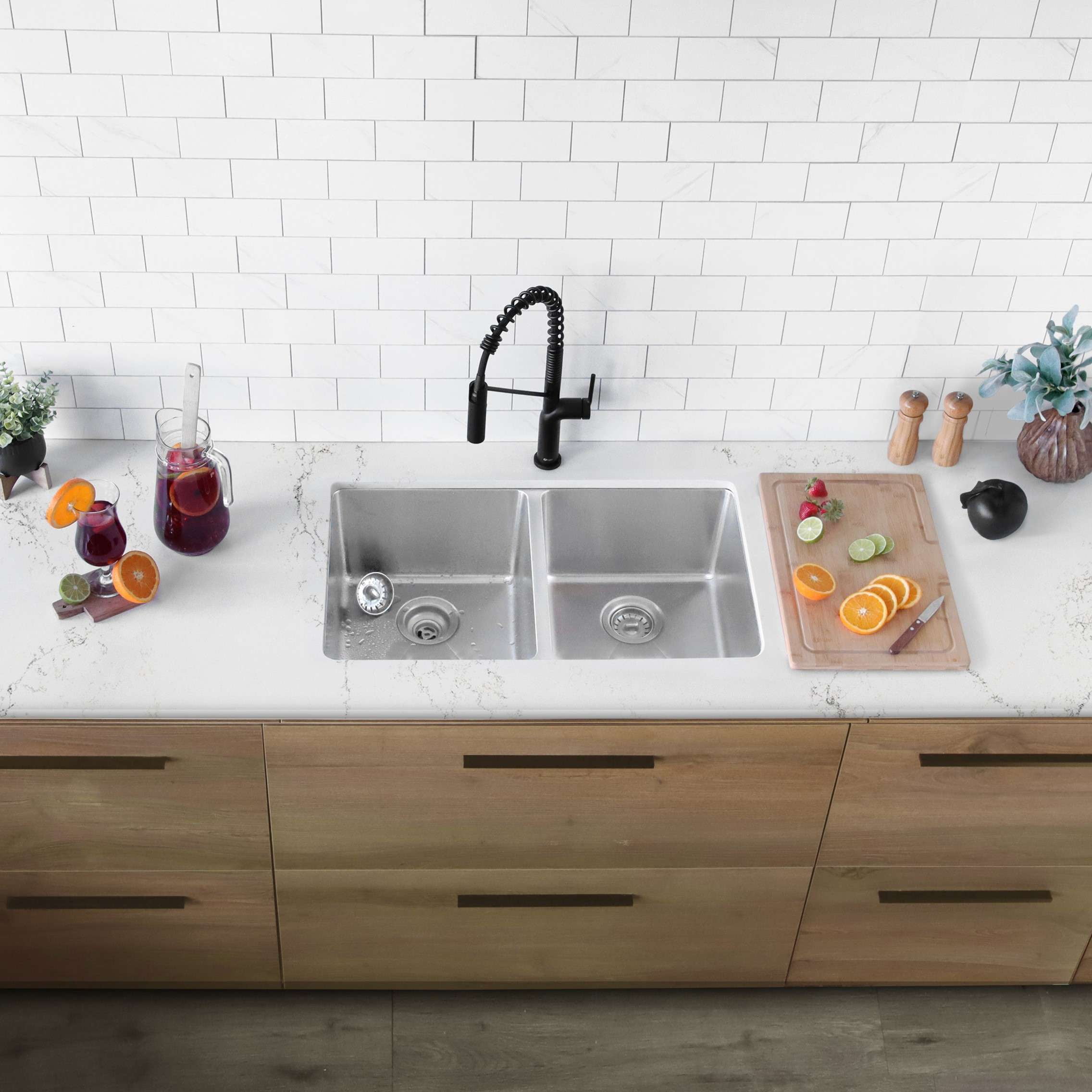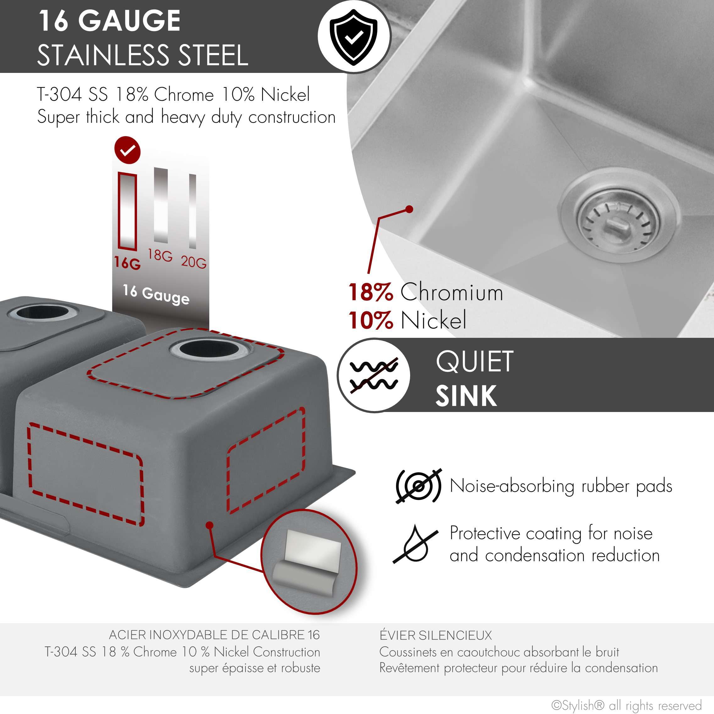 Stain-resistant, corrosion-resistant, rust-resistant, non-fading 16-gauge stainless steel. Noise-reducing sink featuring sound guard padding and rubber pads for effective insulation. Spacious basins with a generous 9-inch depth, perfect for accommodating oversized kitchenware and discreetly concealing dirty dishes. Includes a standard strainer to prevent clogging, designed to fit industry-standard 3.5″ sink drain opening. The product features a versatile dual-mount design, allowing you to select either an under-mount or drop-in installation. Mounting hardware included. The sink’s basins have drain grooves for a stylish look and to prevent water pooling. It also has rear drain openings to maximize space under your kitchen cabinet.