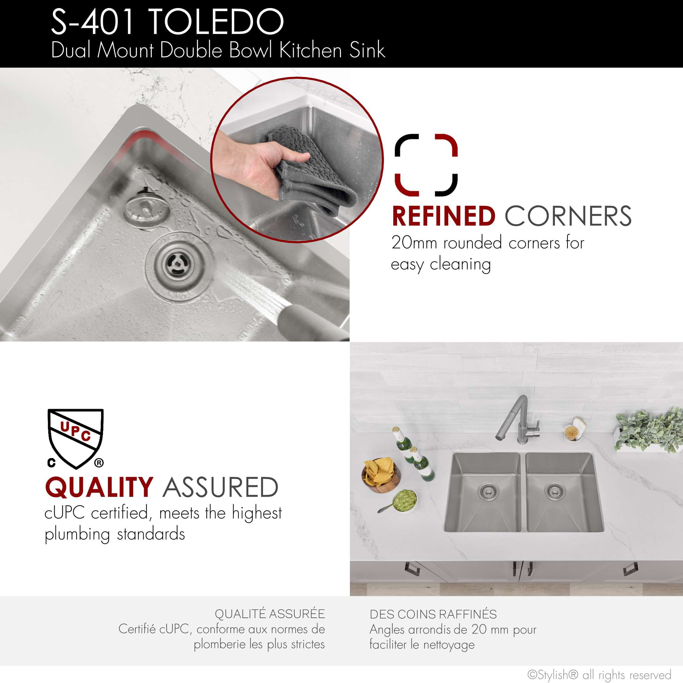 Stylish Dual-Mount 31″ Double-Bowl Stainless Steel Kitchen Sink with Strainers S-401 Presenting our premium T-304 Stainless Steel Sink, meticulously crafted to bring functionality to your kitchen. With an exceptional blend of style and durability, this sink is designed to elevate your culinary experience. Constructed using premium materials, our sink features a composition of 18% Chromium and 10% Nickel, making it highly resistant to corrosion and stains. The 16-gauge thickness ensures outstanding strength, providing long-lasting performance that withstands the test of time. With a modern aesthetic, the sink boasts a sleek design and 20 mm radius corners, adding a touch of elegance to any kitchen decor. This 31-inch sink provides ample space for all your washing and prep needs. It has a dual-mount design installation, giving you the freedom to choose between under-mount or drop-in configurations. Our Builder Series features a range of sizes carefully designed to meet your specific needs. This upgrade to the S-401 makes it a proud addition to our Builder Series.