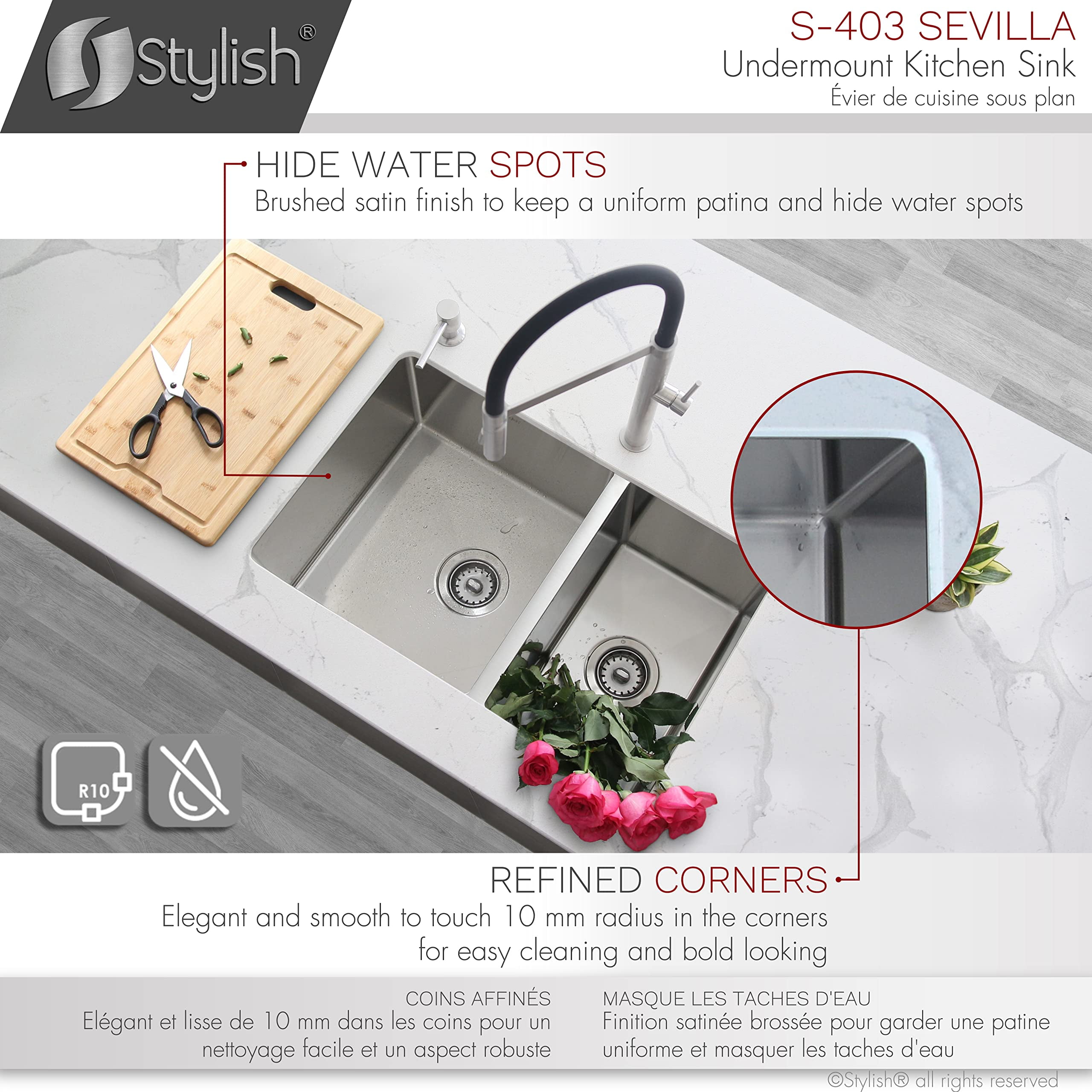 STYLISH S-403 handmade stainless-steel sinks combine functionality, quality and affordability. This 28 inches undermount double bowl kitchen sink features a 60/40 divider with 9 inches deep bowl which provides lots of space to hide dishes and pots, also comes with 10 mm radius corners for easy cleaning. Although this double bowl sink only measures 28 inches, it is designed with a large 15 inches bowl which provides ample space to handle large pots, it is the perfect double bowl sink for a small kitchen cabinet. This undermount kitchen sink has the drains in the middle, which allows reversible installation, the large bowl can be installed on the left or the right side to best fit your desired layout. Both basins have drain grooves for optimal drainage. Handcrafted using premium 304 stainless steel with 18 gauge and 18/10 chrome/nickel content and featuring a commercial grade brushed finish and extremely rust resistant. This undermount kitchen sink is equipped with top-level soundproofing, including rubber dampening pads and protective coating, which reduces condensation and further dampens water sound. For easy installation, all mounting hardware is provided including two high quality all metal drain strainer. Our sinks are designed and serviced in Canada, this sink meets the highest plumbing standards of North America. Stylish sinks are trusted by architects and builders for upscale projects and modern makeovers. *1