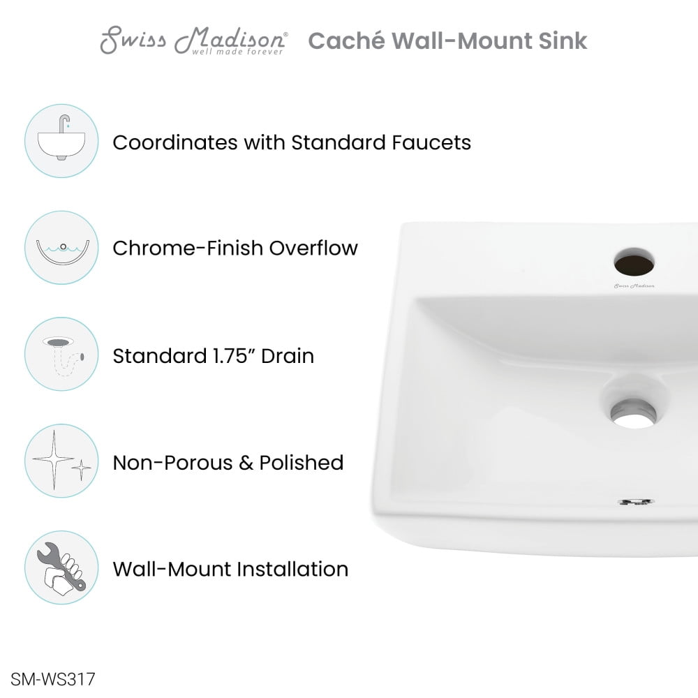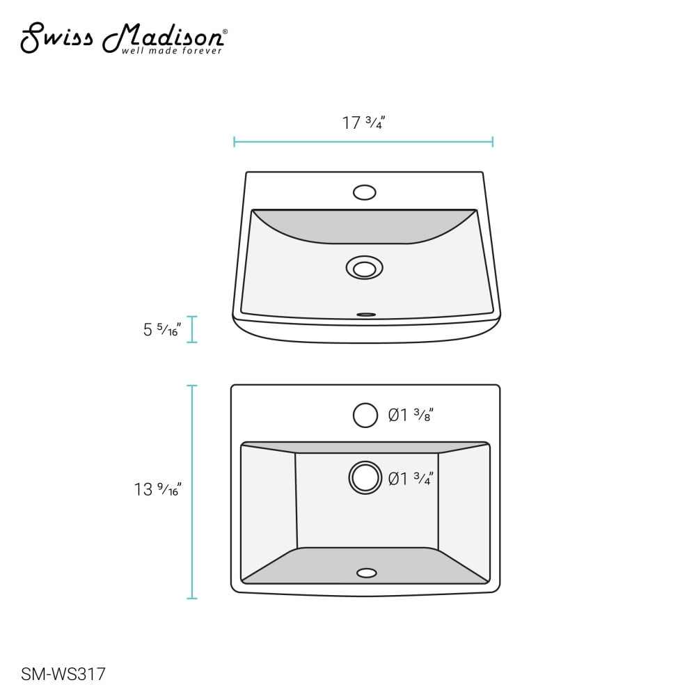 Wall-Mount Installation: Wall-mount sinks are a space-saving, versatile option, offering users installation height customizability. Durable Non-Porous Scratch Resistant Ceramic: Developed from ceramic, that is scratch-resistant and non-porous, providing a durable and reliable option that can withstand routine use. Single Faucet Hole: Pre-drilled standard 1 3/8″ Single Faucet Hole Drain: Standard 1.75″ inch drain opening. Basin Depth: 3.15 inches. Collection: Part of the Sublime Collection, explore additional products in this collection to complete the room.