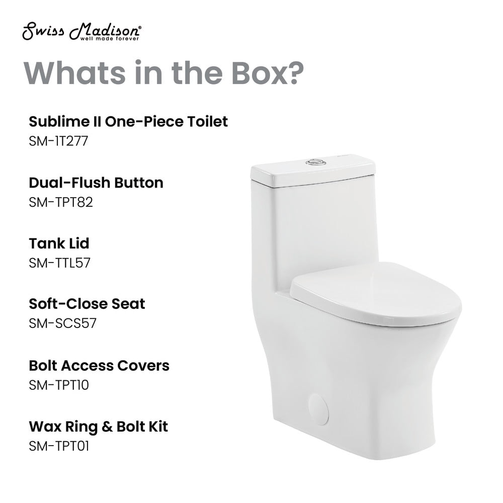 Dual Flush: The buttons for dual flush allow you to choose between a low 1.1 GPF light flush or a high 1.6 GPF full flush. Rough-In: 10″ Rough-In Round Bowl: A Round shape allows freedom of movement for optimal comfort. Between 15-17 inches, the standard height toilet is designed with ergonomic considerations, offering optimal comfort to users of all ages and body types. Durable Non-Porous Scratch Resistant Ceramic: Developed from ceramic, that is scratch-resistant and non-porous, providing a durable and reliable option that can withstand routine use. Fully Glazed and Skirted Trapway: The skirted trapway offers hidden plumbing creating an elevated and luxurious design with a smooth finish for easy cleaning. The fully glazed trapway prevents clogs and keeps water flowing freely. Access Hole: 3″ Diameter access holes for installation. Soft Close and Quick Release Seat: Provides a silent and gentle closing mechanism for added convenience and safety. With just the push of a button, the seat detaches completely for a thorough cleaning. Collection: Part of the Sublime II Collection, explore additional products in this collection to complete the room.