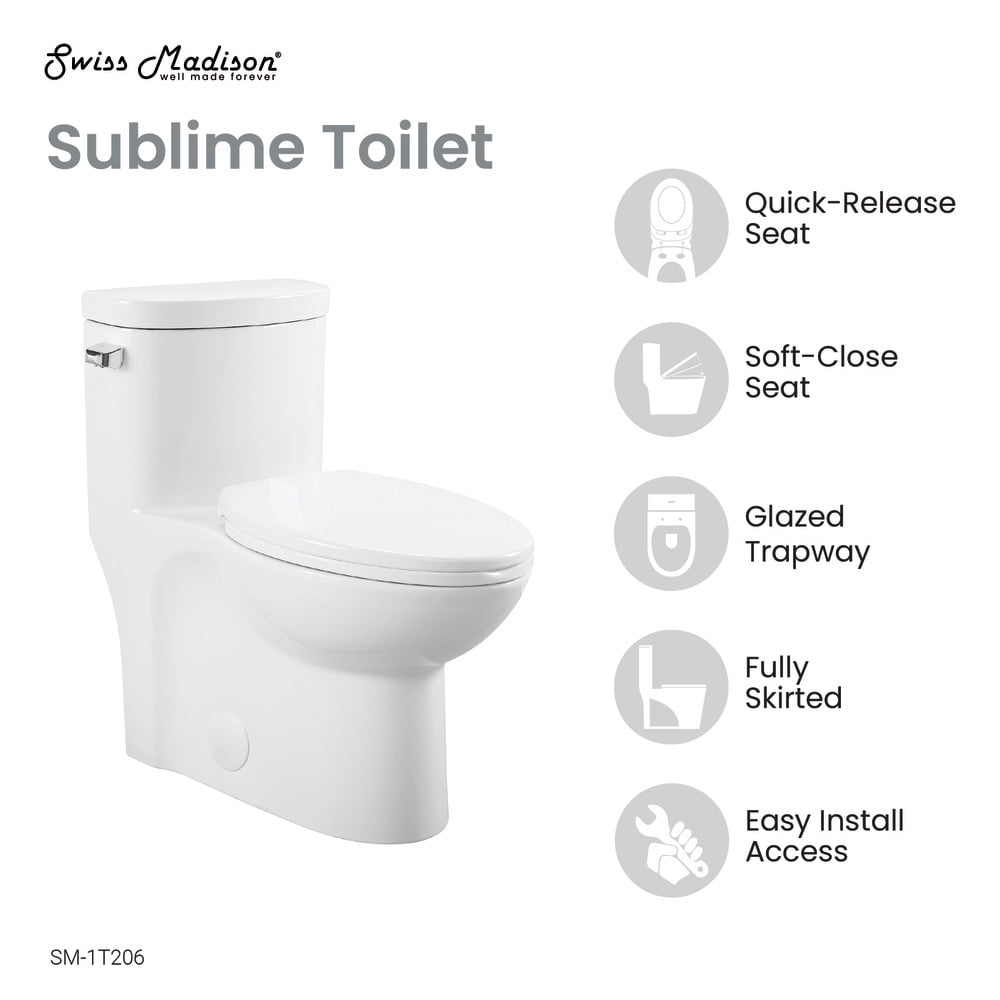 Single Flush: Single Flush 1.28 GPF Rough-In: Standard 12″ Rough-In Standard Elongated Bowl: The elongated bowl provides extra room and comfort. Between 15-17 inches, the standard height toilet is designed with ergonomic considerations, offering optimal comfort to users of all ages and body types. Durable Non-Porous Scratch Resistant Ceramic: Developed from ceramic, that is scratch-resistant and non-porous, providing a durable and reliable option that can withstand routine use. Fully Glazed and Skirted Trapway: The skirted trapway offers hidden plumbing creating an elevated and luxurious design with a smooth finish for easy cleaning. The fully glazed trapway prevents clogs and keeps water flowing freely. Access Hole: 3″ Diameter access holes for installation. Soft Close and Quick Release Seat: Provides a silent and gentle closing mechanism for added convenience and safety. With just the push of a button, the seat detaches completely for a thorough cleaning. Collection: Part of the Sublime Collection, explore additional products in this collection to complete the room.