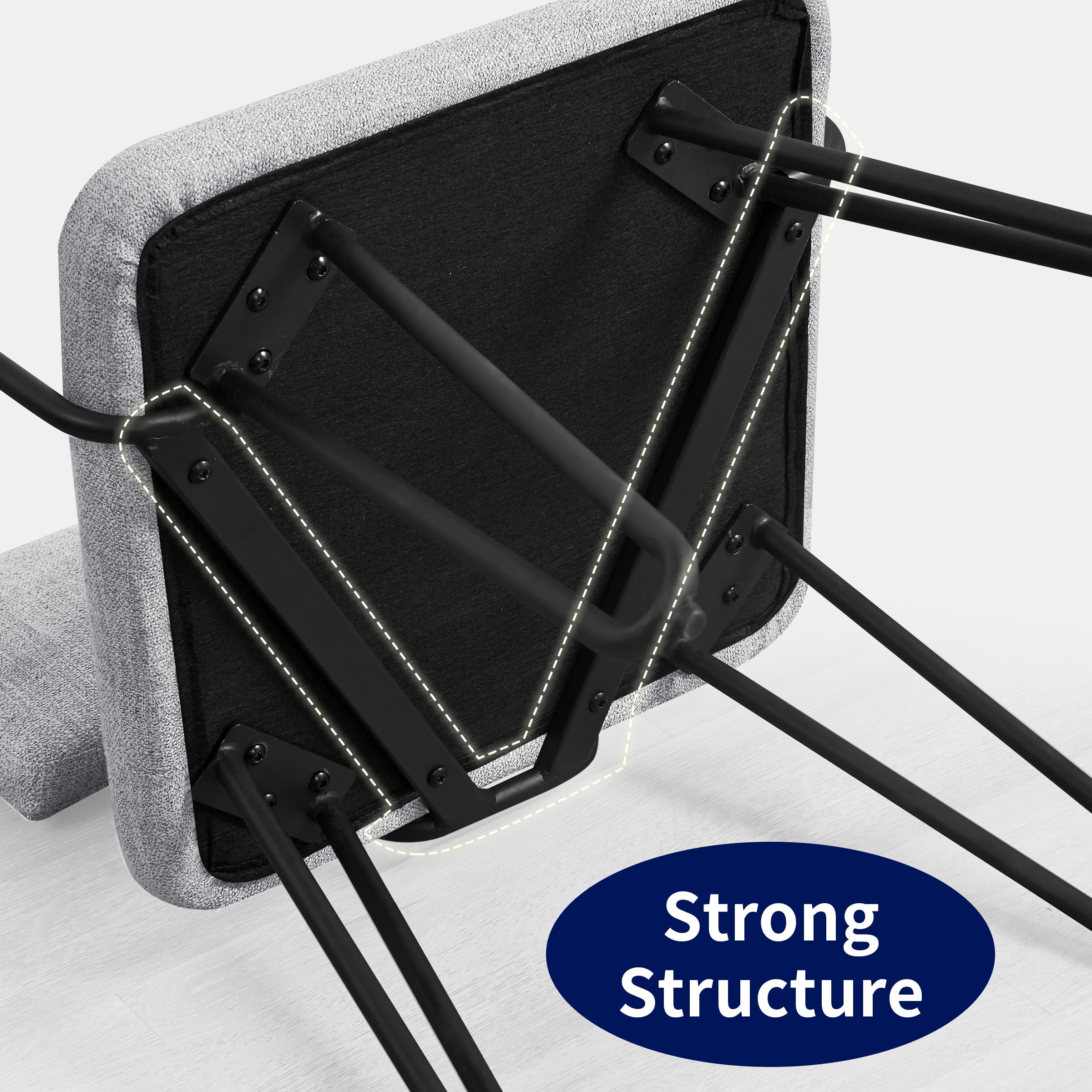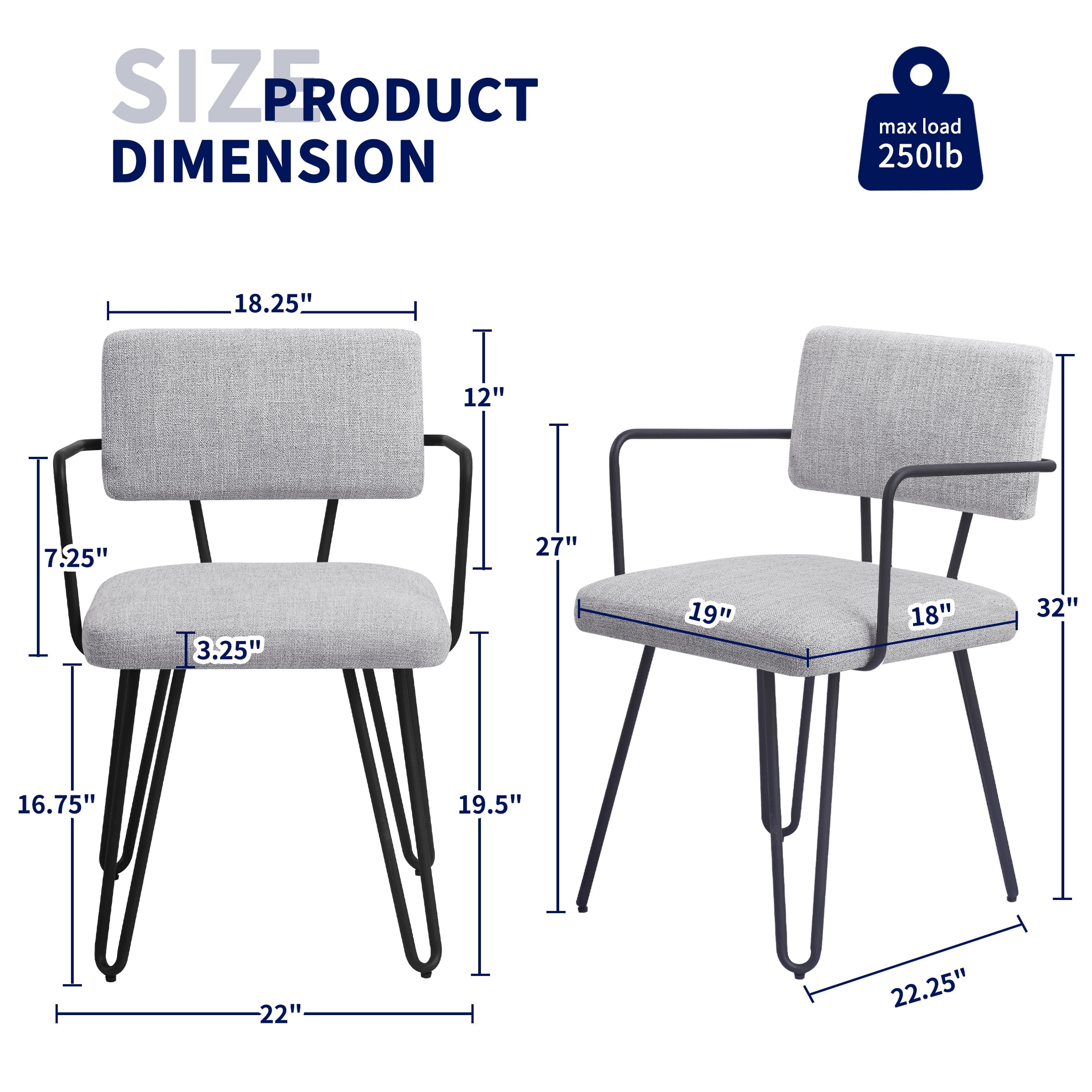 Our iron dining chair offers sitting comfort through an upholstered seat design with high density foam padding and breathable linen fabric wrap, featuring a solid and sturdy iron frame and a maximum load capacity of 250 lbs. Ergonomically designed to fit the body curves perfectly, reducing back pressure and fatigue and providing armrests for resting your arms.