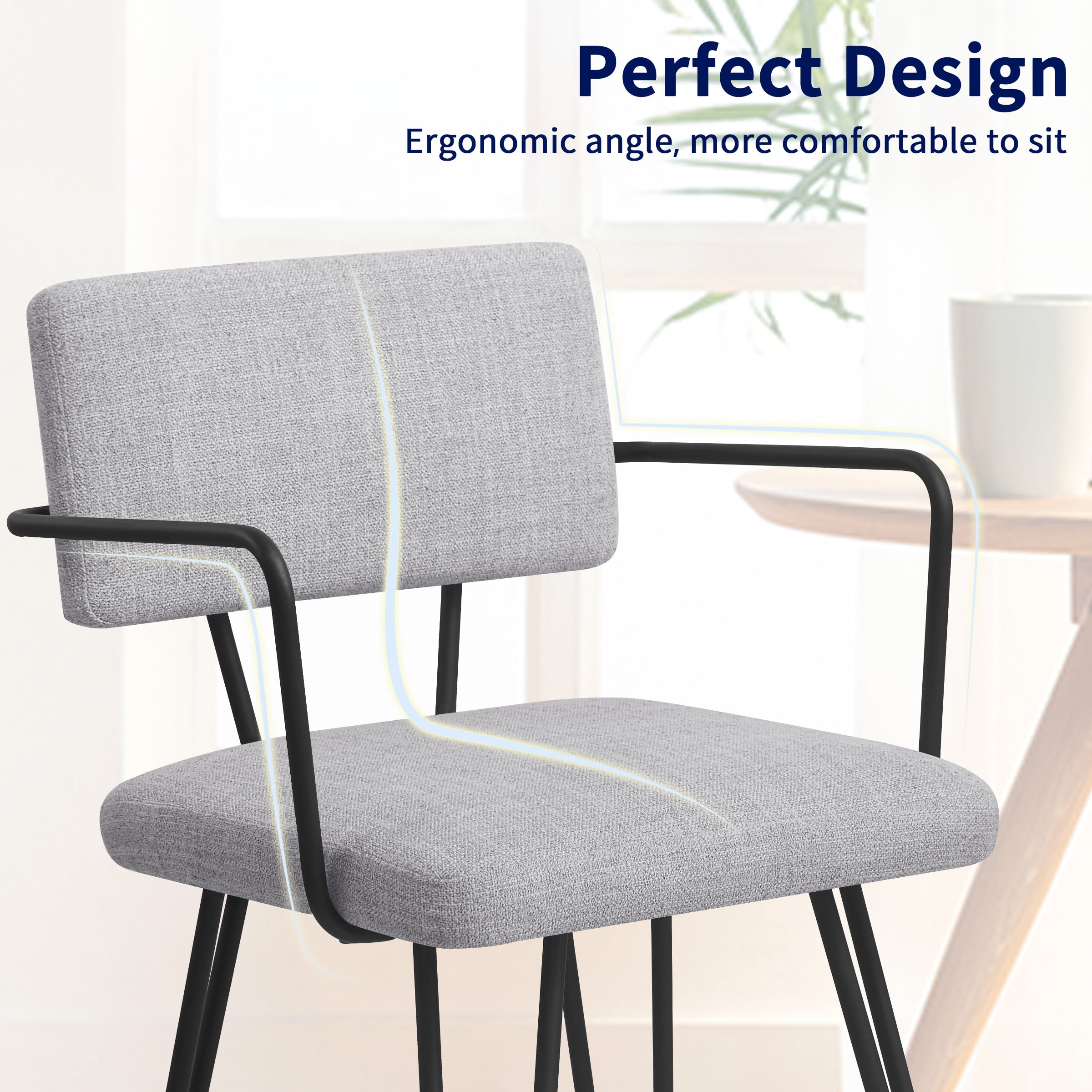 Key Features: Comfortable Sitting: The dining chair is designed with upholstered seat, providing a comfortable sitting experience. And the cushion is filled with high-density sponge and covered by breathable linen fabric, bringing ultimate comfort. Stable & Sturdy Structure: The frame of this dining chair is made of premium iron, featuring a long service life and a maximum load capacity of 250 lbs. In addition, our dining chairs come with adjustable footpads. It can adapt to more dining tables while ensuring that the dining chairs remain stable on uneven floors, and footpads could also keep floor from scratching and prevent the harsh sound when moving. Ergonomic Design: The backrest of dining room chair is designed with artificial curvature, the upholstered dining chairs can perfectly fit your body curve for better relaxation while reducing pressure and fatigue from the back. Moreover, there also exist smooth iron armrests for resting arms. Specification: Color: Off-White, Gray Main Material: Iron, Sponge, Linen Fabric Type: Dining Chair; Dining Room Chairs; Iron Chairs; Metal Chairs Note: Set of 2 Dining Chairs, Arrives in 1 box