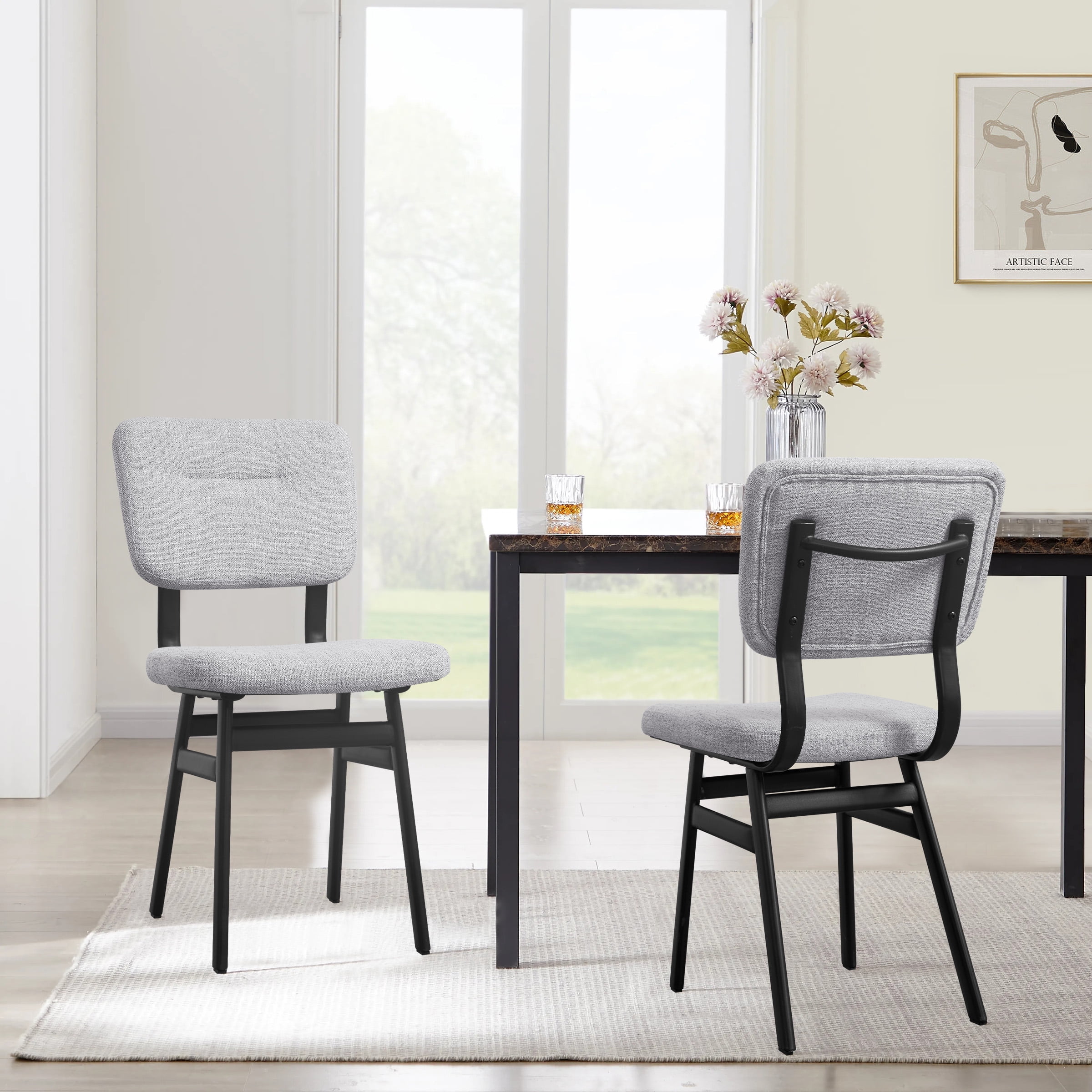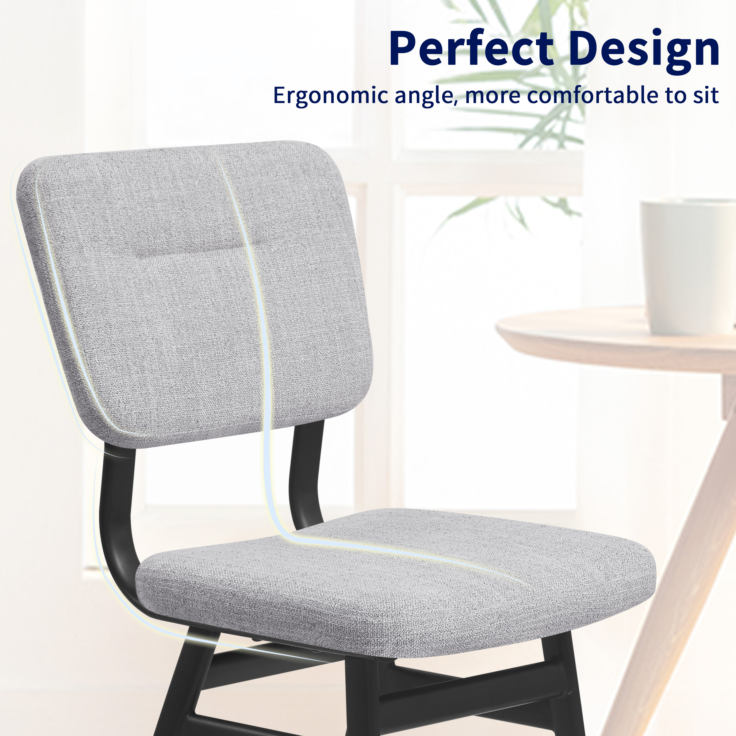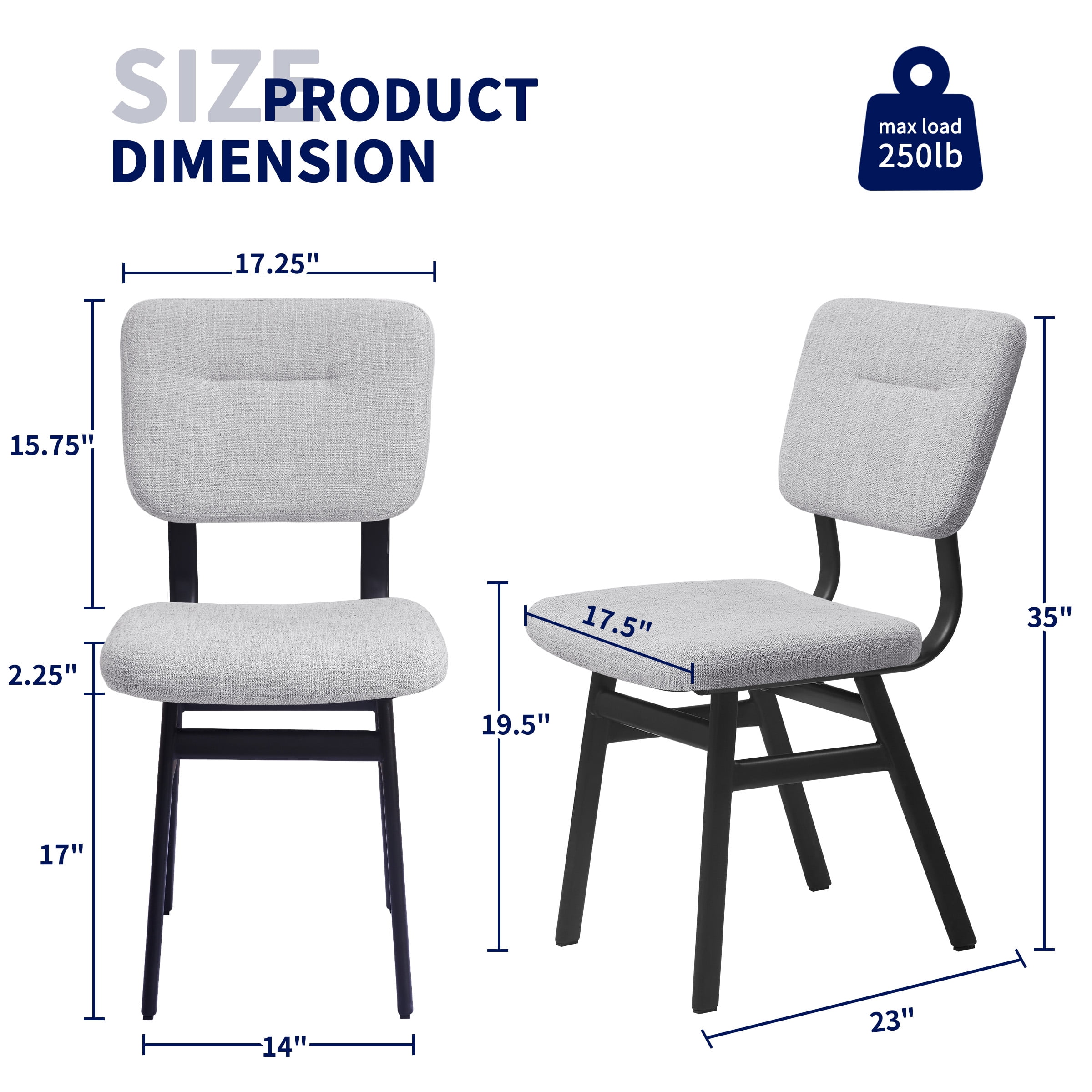 Key Features: Comfortable Sitting: The dining chair is designed with upholstered seat, providing a comfortable sitting experience. And the cushion is filled with high-density sponge and covered by breathable linen fabric, bringing ultimate comfort. Stable & Sturdy Structure: The frame of this dining chair is made of premium iron, featuring a long service life and a maximum load capacity of 250 lbs. In addition, our dining chairs come with footpads, which could also keep floor from scratching and prevent the harsh sound when moving. Ergonomic Design: The backrest of dining room chair is designed with artificial curvature, the upholstered dining chairs can perfectly fit your body curve for better relaxation while reducing pressure and fatigue from the back. Specification: Color: Off-White, Gray Main Material: Iron, Sponge, Linen Fabric Type: Dining Chair; Dining Room Chairs; Iron Chairs; Metal Chairs Note: Set of 2 Dining Chairs, Arrives in 1 box