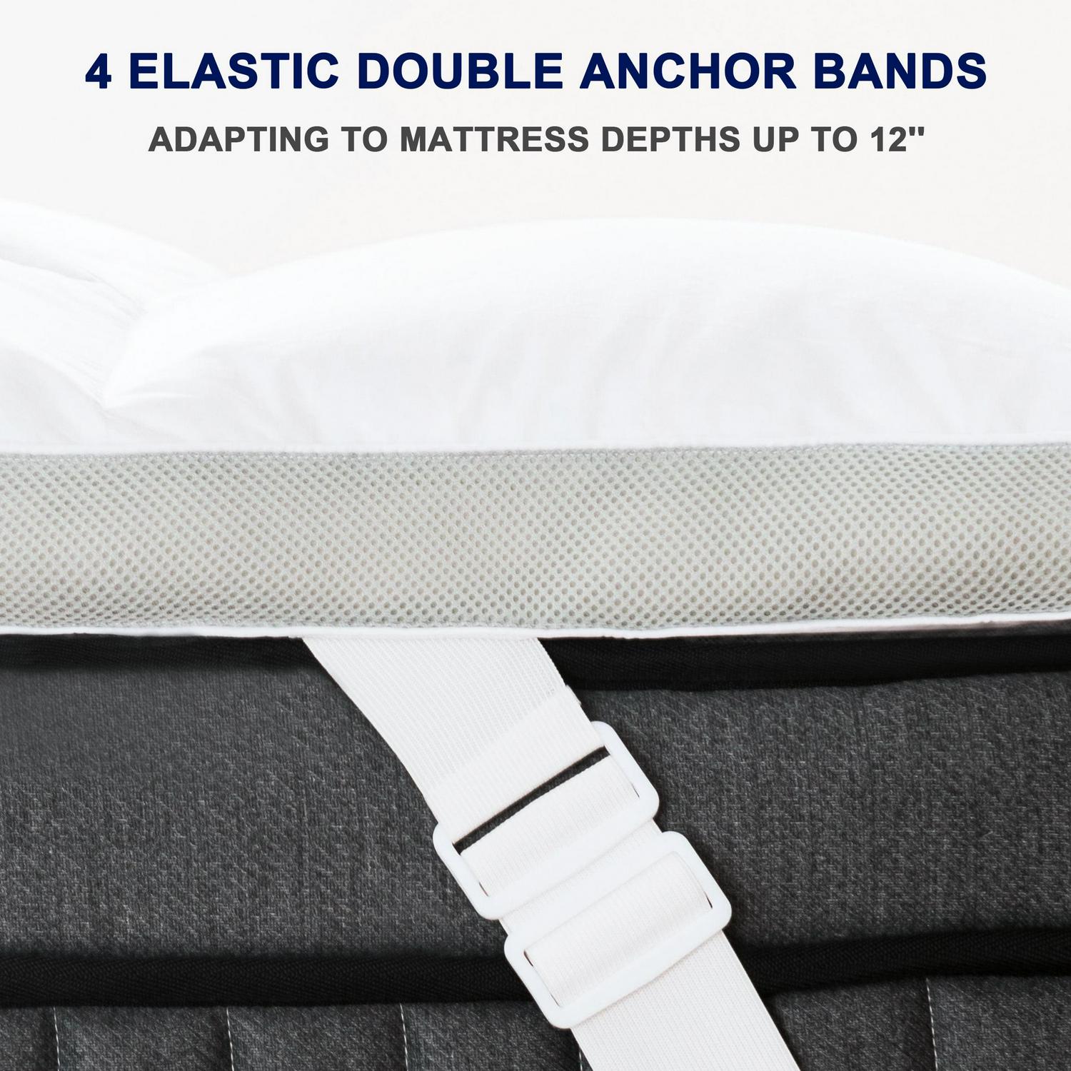 – [Double anchor bands] 4 elastic double anchor bands adapting to mattress depths up to 12”, fit your old mattress perfectly and rejuvenate it, accompanying you through the long night and awake feeling completely refreshed the next day.