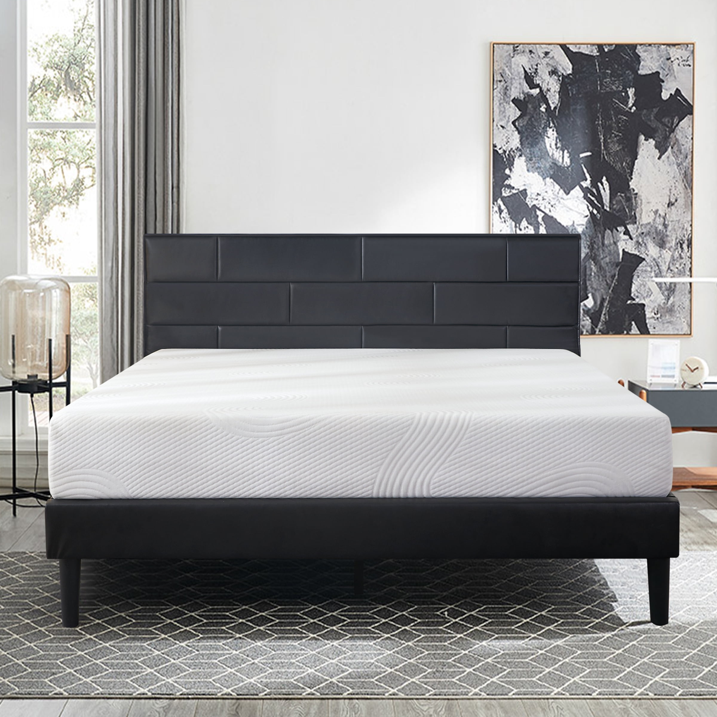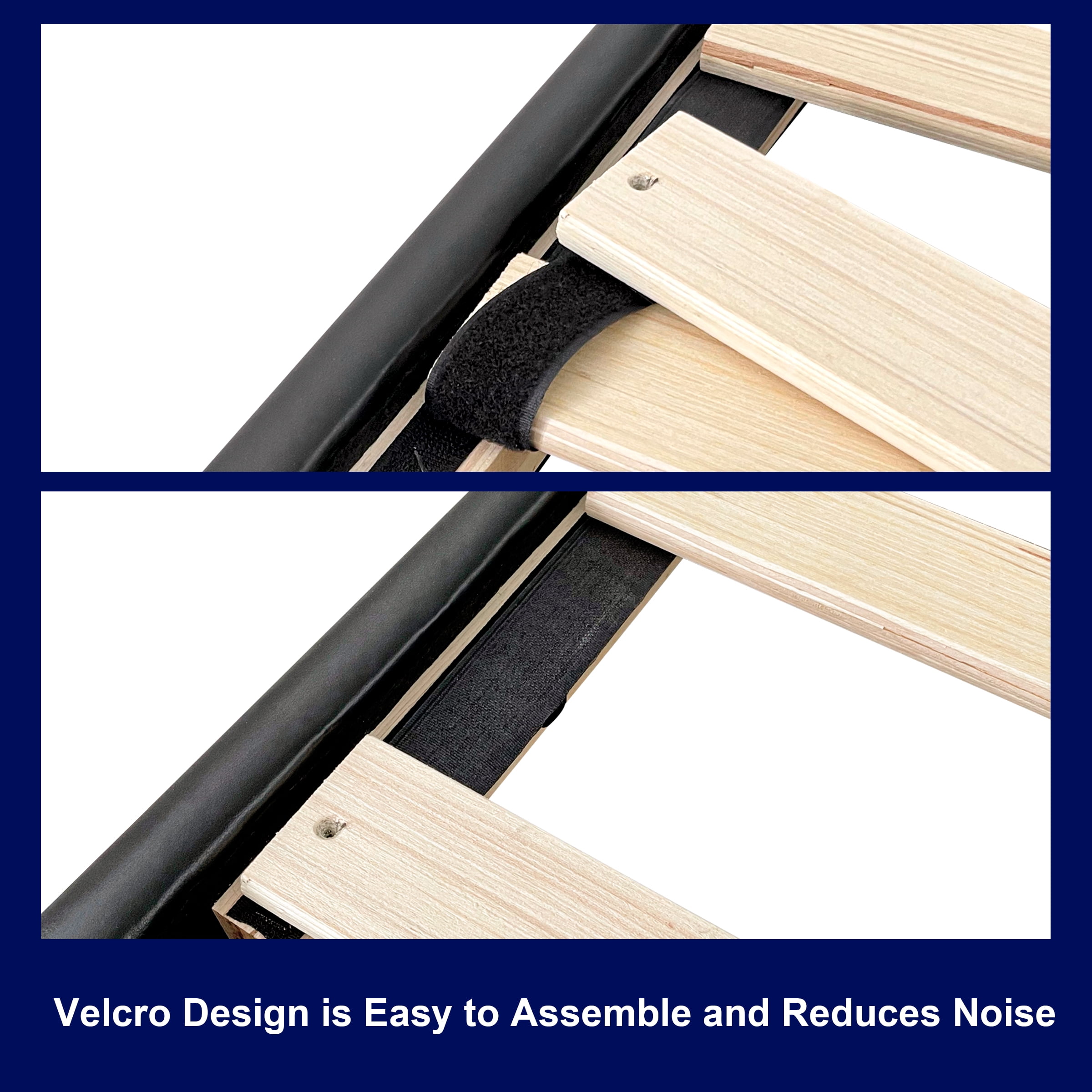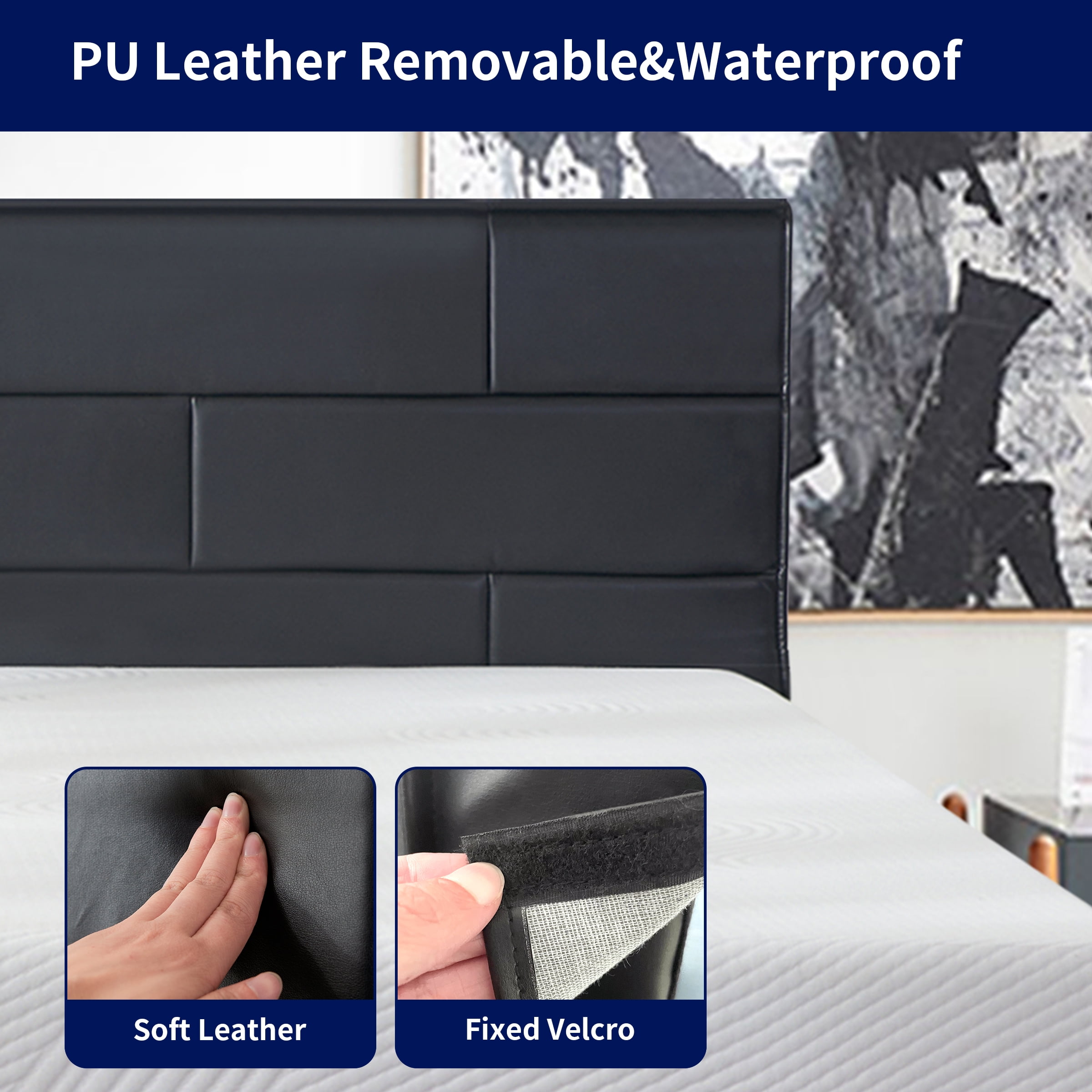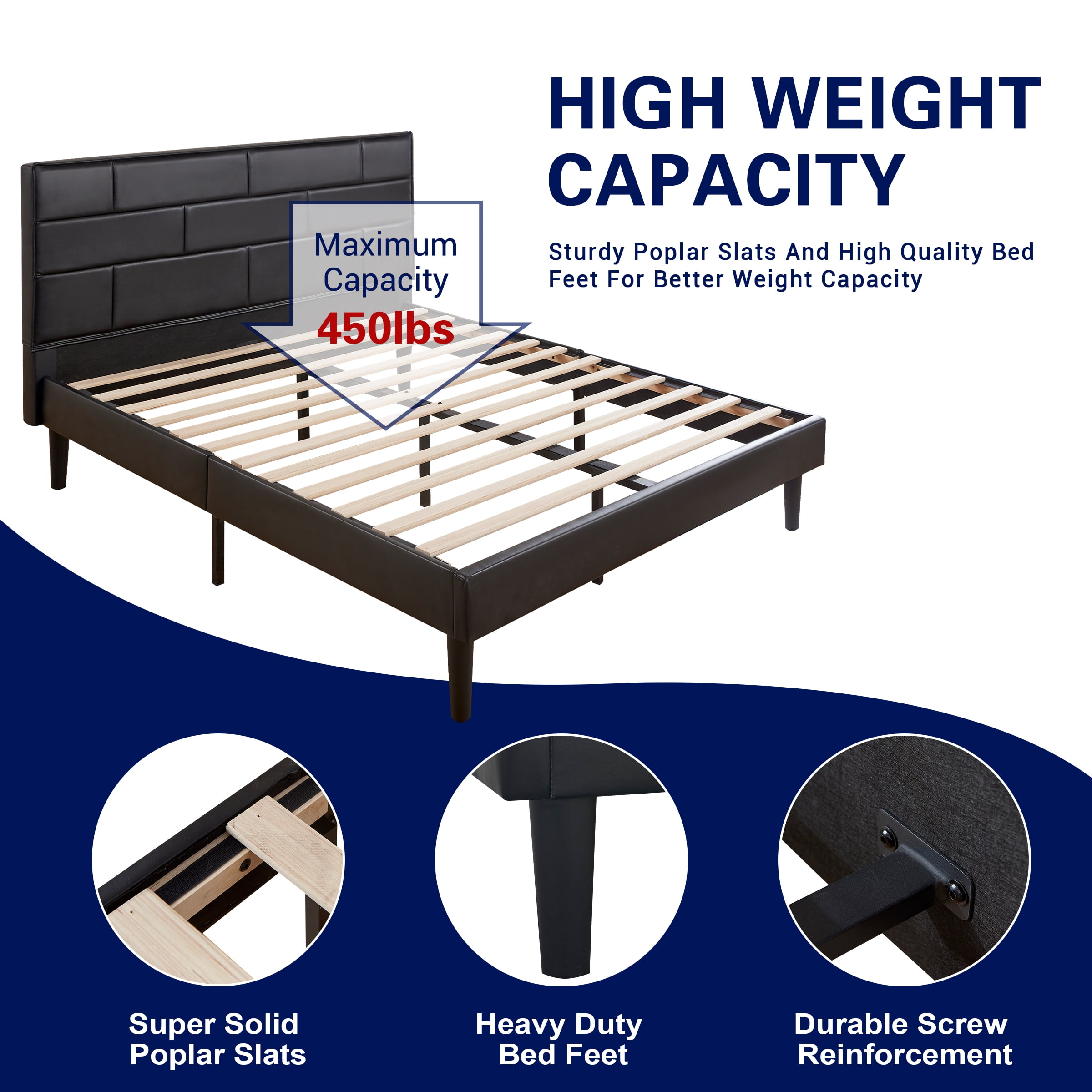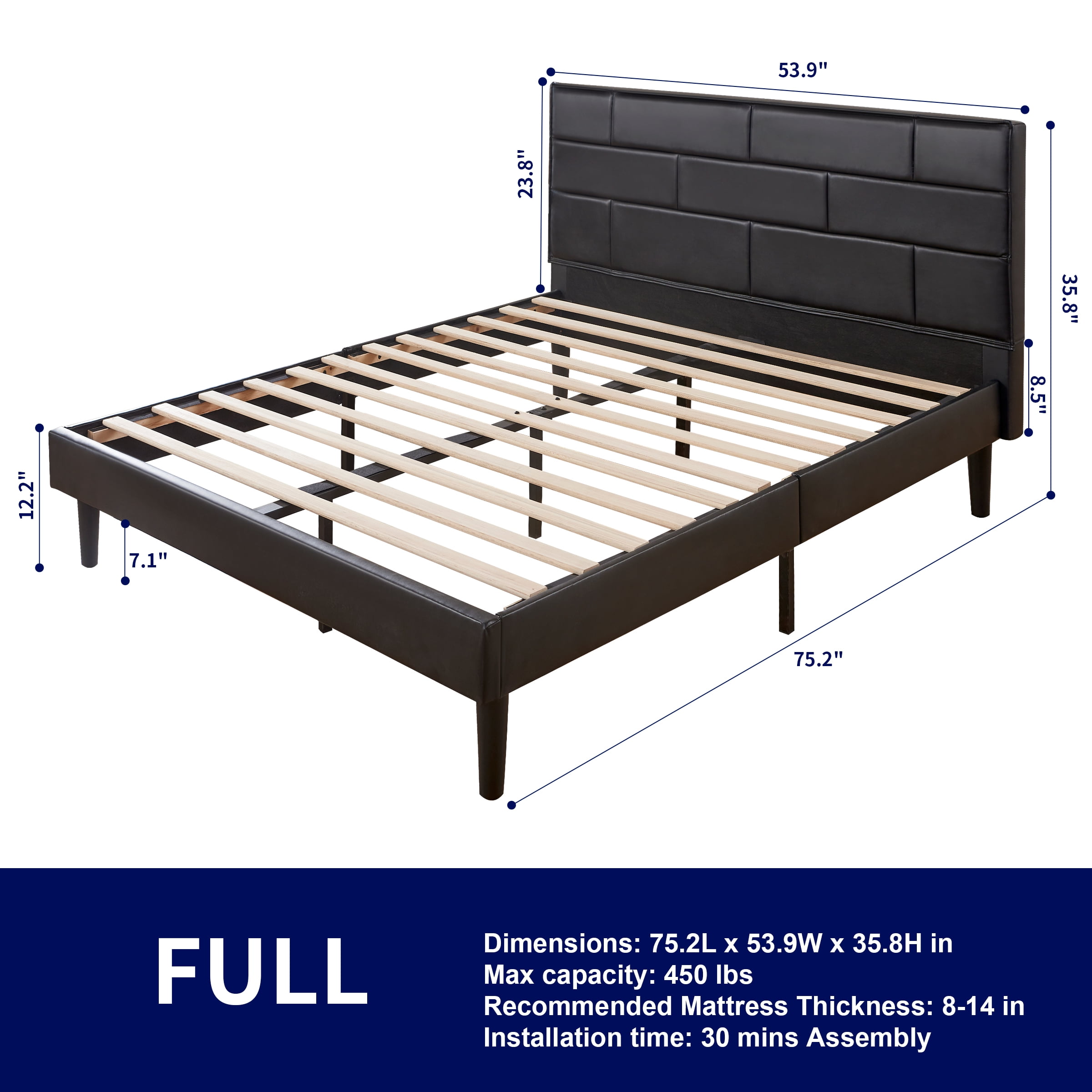 Subrtex Platform Bed Frame with Removable PU Leather Upholstered Headboard, Heavy-Duty Wood Slats Solid Wood Construction: The heavy duty poplar wood slats and 9 durable support legs stabilize the bed frame, which have a strong load-bearing capacity and greatly prolong its service life. PU Leather Headboard: Made of high quality PU leather, the headboard is super soft and skin-friendly, offering you a comfortable backrest experience. Its waterproofness and detachability make it easy to maintain. Noise-Free: The Subrtex wood bed features velcro design, which ensures an easy assembly and no noise interference, providing you a quiet and relaxed sleeping night. Extra Storage Space: 7 inches under-bed clearance is perfect for storing extra odds and ends, allowing you to make the most of your space and keep your bedroom organized. Easy Assembly: Come with all the necessary hardware and an installation manual, you can set up this platform bed with a headboard in about 30 minutes. Applicable Size: Twin: 39″L x 75″W x 36″H Full: 54″L x 75″W x 36″H Queen: 60″L x 80″W x 36″H King: 76″L x 80″W x 36″H Product Specification: Color: Black Type: Bed Frame Frame Material: Solid Poplar Wood Upholstery Material: PU Leather Number of Support Legs: 9 Recommended Mattress Thickness: 6”-14” Height from the ground: 7.1 inch Weight Capacity: Twin/Full 450lbs; Queen/King 750lbs Box Spring Required: No Package Included: 1 x Bed Frame with Removable Headboard 1 x Accessory Kit 1 x Instructions manual Notice: Box spring and mattress not included Please refer to product size before purchase