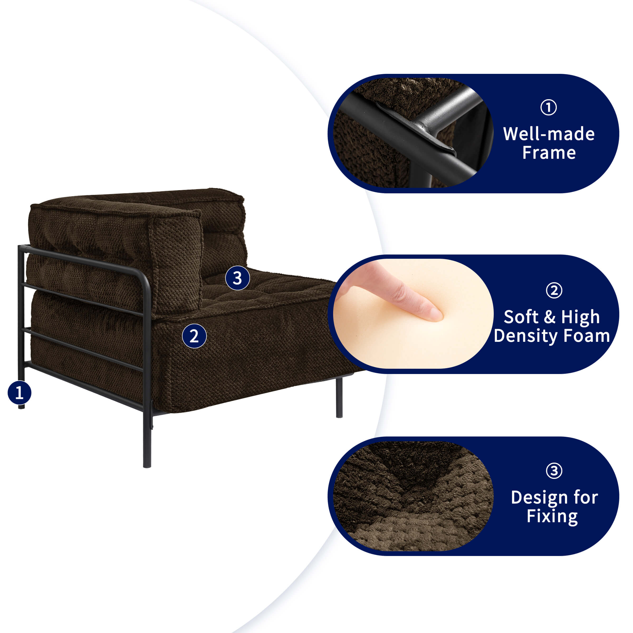 Key Features: Sturdy Metal Frame: The frame are made of metal, which provides sturdy support and adds an elegant modern touch. Comfortable Material: The sofa is filled with high-density sponge and covered with breathable short plush , which provides comfort and support. Ergonomic Design: The upholstered accent chairs can perfectly fit your body curve for better relaxation while reducing pressure and fatigue from the back. Humanized design: Velcro Fixed Design ensures that the backrest of the sofa will not shift. Imagine combinations: Expand your imagination combine them into any shapes you need. Specification: Color: Brown Main Material: Iron, Sponge, Short Plush Type: Sofa, L Shaped Sofa, Metal Sofa Note: L Shaped Sofa X 1
