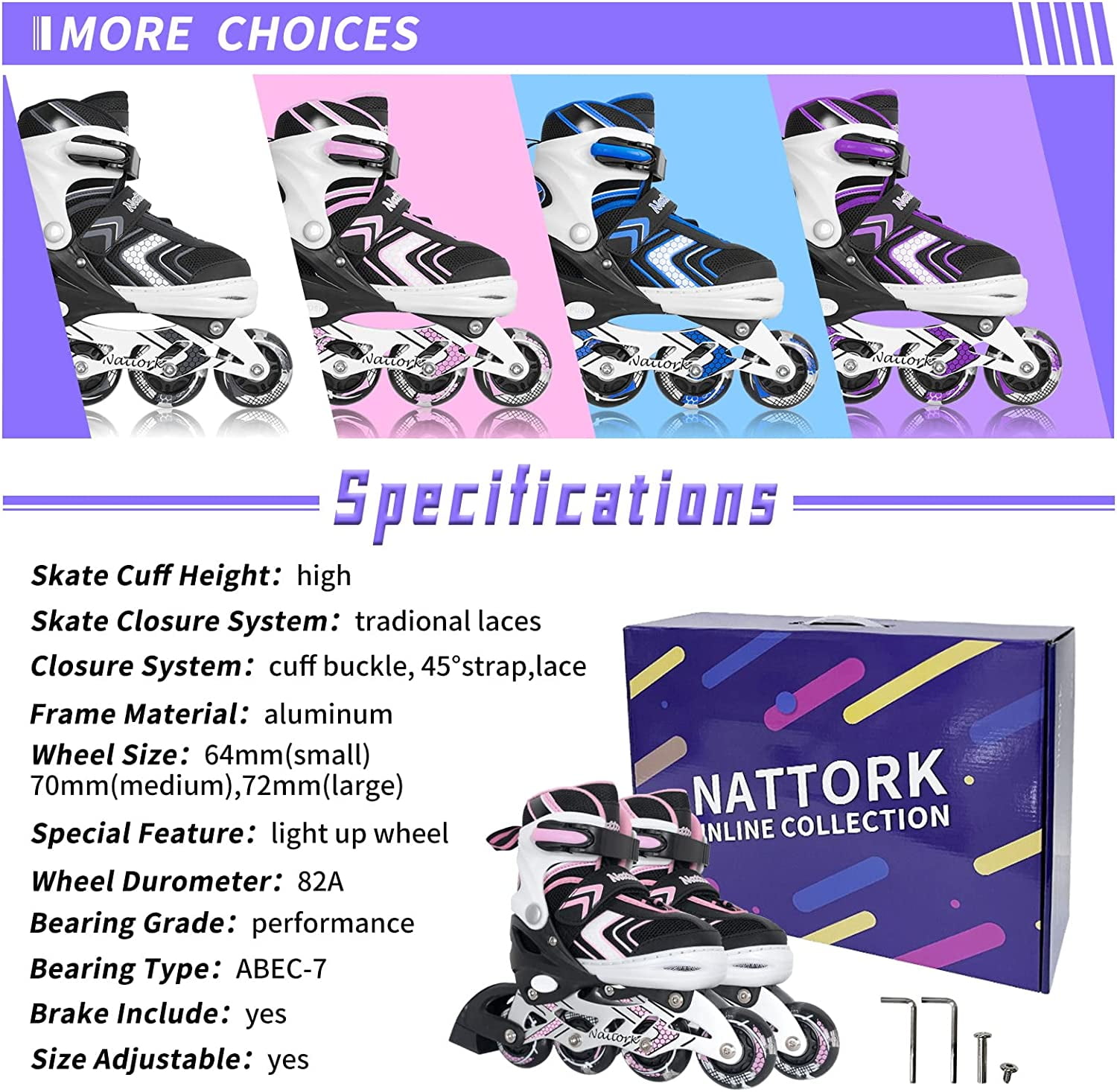 【ADJUSTABLE 4 SIZE】With the ease of size adjustment at the touch of a button, it’s easy for kids to put on/take off. These skates can grow with your child because the shoes can be adjusted to four sizes.SubSun inline skates are available in three sizes: S(11C-1 US)/ M(1.5-4.5 US)/ L(5-8 US), please check our size chart for the specific length of the shoes. 【8 WHEELS ILLUMINATING】Our inline skates for kids come with eight illuminating wheels that lights up automatically when you start to skate. The lights are powered by wheels rolling and never need replacement batteries! Just imagine how cool it will be to flash as bright as a lighting bolt in the dark! (Tips: Please check and tight wheels regularly to prevent them falling off) 【ADVANCED CONFIGURATION】Inline skating with excellent stitching and high quality fabric inside, feel your feet are wrapped in soft fabric. The skates use 82A PU smooth wheels with ABEC-7 bearings. Soft lining provides good sweat absorption, extra padding in the front prevents your child’s toes from hurting. 【TRIPLE PROTECTION】Our skates also designed with 3 protective layers: Durable fixing buckle, wear-resistant hook & loop strap and strong shoelaces, they offering the strong supports for ankle. The single brake is equipped on right foot to prevent the danger of falling. 【IDEAL PRESENT】SubSun inline skates can be a perfect birthday/Christmas gift for your kids, grandchild or nieces and nephews. The kids will have a happy childhood and great toys. Affordable for beginners, we aim to provide a high quality experience.