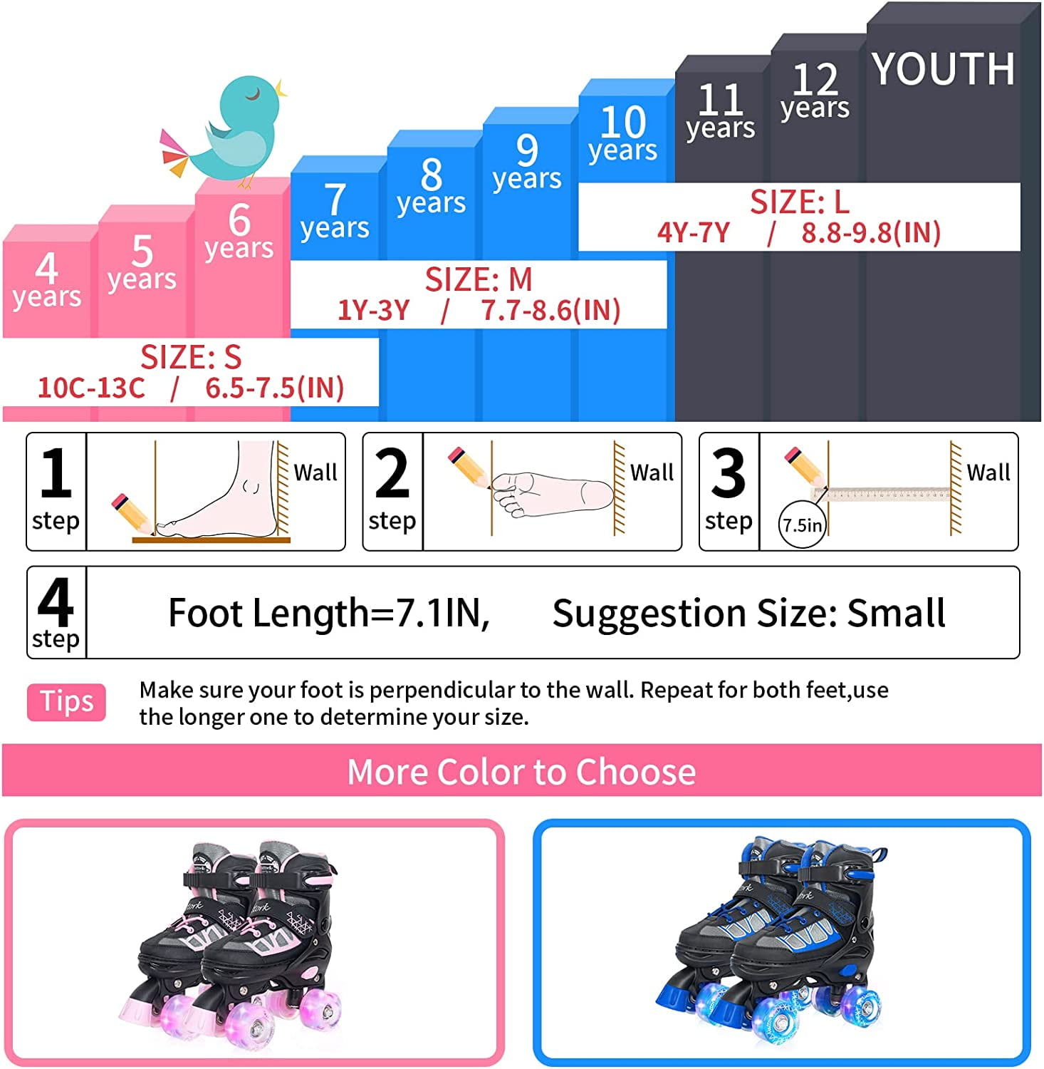 SubSun roller skates offer 4 size adjustability, allowing easy adjustment to different sizes by simply pressing a button. This eliminates the need for frequent roller skate replacements, making them ideal for kids. SubSun roller skates offer 4 size adjustability, allowing easy adjustment to different sizes by simply pressing a button. This eliminates the need for frequent roller skate replacements, making them ideal for kids. With high-quality components such as mute ABEC-7 bearings, PU flash wheels, and a safety limiter, these skates ensure a smooth and happy sliding experience for your child. With high-quality components such as mute ABEC-7 bearings, PU flash wheels, and a safety limiter, these skates ensure a smooth and happy sliding experience for your child.